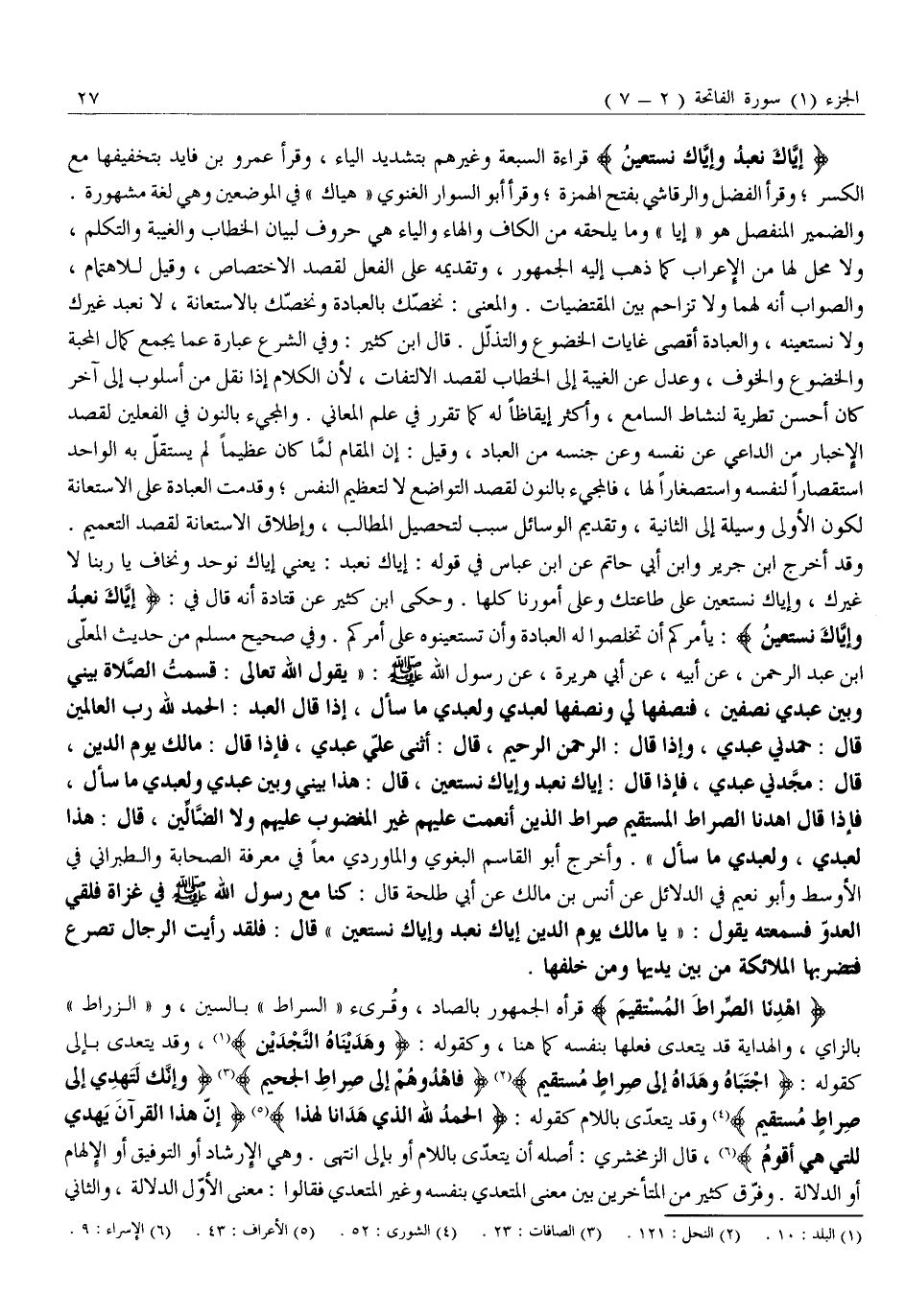 وَقَدْ أَخْرَجَ ابْنُ جَرِيرٍ وَابْنُ أَبِي حَاتِمٍ عَنِ ابْنِ عَبَّاسٍ فِي قَوْلِهِ: إِيَّاكَ نَعْبُدُ: يَعْنِي إِيَّاكَ نُوَحِّدُ وَنَخَافُ يَا رَبَّنَا لَا غَيْرَكَ، وَإِيَّاكَ نَسْتَعِينُ عَلَى طَاعَتِكَ وَعَلَى أُمُورِنَا كُلِّهَا. وَحَكَى ابْنُ كَثِيرٍ عَنْ قَتَادَةَ أَنَّهُ قَالَ فِي: إِيَّاكَ نَعْبُدُ وَإِيَّاكَ نَسْتَعِينُ: يَأْمُرُكُمْ أَنْ تُخْلِصُوا لَهُ الْعِبَادَةَ وَأَنْ تَسْتَعِينُوهُ عَلَى أَمْرِكُمْ. وَفِي صَحِيحِ مسلم من حديث المعلّى ابن عَبْدِ الرَّحْمَنِ، عَنْ أَبِيهِ، عَنْ أَبِي هُرَيْرَةَ، عَنْ رَسُولِ اللَّهِ صَلَّى اللَّهُ عَلَيْهِ وَسَلَّمَ: «يَقُولُ اللَّهُ تَعَالَى: قَسَمْتُ الصَّلَاةَ بَيْنِي وَبَيْنَ عَبْدِي نِصْفَيْنِ، فَنِصْفُهَا لِي وَنِصْفُهَا لِعَبْدِي وَلِعَبْدِي مَا سَأَلَ، إِذَا قَالَ الْعَبْدُ: الْحَمْدُ لِلَّهِ رَبِّ الْعَالَمِينَ قَالَ: حَمِدَنِي عَبْدِي، وَإِذَا قَالَ: الرَّحْمَنِ الرَّحِيمِ، قَالَ: أَثْنَى عَلَيَّ عَبْدِي، فَإِذَا قَالَ: مَالِكِ يَوْمِ الدِّينِ، قَالَ: مَجَّدَنِي عَبْدِي، فَإِذَا قَالَ: إِيَّاكَ نَعْبُدُ وَإِيَّاكَ نَسْتَعِينُ، قَالَ: هَذَا بَيْنِي وَبَيْنَ عَبْدِي وَلِعَبْدِي مَا سَأَلَ، فَإِذَا قَالَ اهْدِنَا الصِّرَاطَ الْمُسْتَقِيمَ صِرَاطَ الَّذِينَ أَنْعَمْتَ عَلَيْهِمْ غَيْرِ الْمَغْضُوبِ عَلَيْهِمْ وَلَا الضَّالِّينَ، قَالَ: هَذَا لِعَبْدِي، وَلِعَبْدِي مَا سَأَلَ» . وَأَخْرَجَ أبو القاسم البغوي والماوردي مَعًا فِي مَعْرِفَةِ الصَّحَابَةِ وَالطَّبَرَانِيُّ فِي الْأَوْسَطِ وَأَبُو نُعَيْمٍ فِي الدَّلَائِلِ عَنْ أَنَسِ بْنِ مَالِكٍ عَنْ أَبِي طَلْحَةَ قَالَ: كُنَّا مَعَ رَسُولِ اللَّهِ صَلَّى اللَّهُ عَلَيْهِ وَسَلَّمَ في غَزَاةٍ فَلَقِيَ الْعَدُوَّ فَسَمِعْتُهُ يَقُولُ: «يَا مَالِكَ يَوْمِ الدِّينِ إِيَّاكَ نَعْبُدُ وَإِيَّاكَ نَسْتَعِينُ» قَالَ: فَلَقَدْ رَأَيْتُ الرِّجَالَ تُصْرَعُ فَتَضْرِبُهَا الْمَلَائِكَةُ مِنْ بين يديها ومن خلفها.