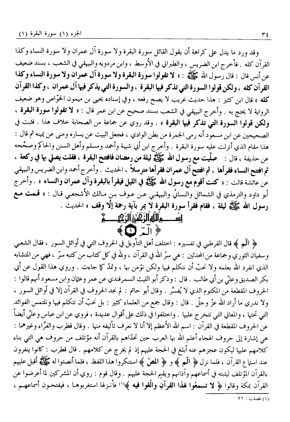 الم قَالَ الْقُرْطُبِيُّ فِي تَفْسِيرِهِ: اخْتَلَفَ أَهْلُ التَّأْوِيلِ فِي الْحُرُوفِ الَّتِي فِي أَوَائِلِ السُّوَرِ، فَقَالَ الشَّعْبِيُّ وَسُفْيَانُ الثَّوْرِيُّ وَجَمَاعَةٌ مِنَ الْمُحَدِّثِينَ: هِيَ سِرُّ اللَّهِ فِي الْقُرْآنِ، وَلِلَّهِ فِي كُلِّ كِتَابٍ مِنْ كُتُبِهِ سِرٌّ، فَهِيَ مِنَ الْمُتَشَابِهِ الَّذِي انْفَرَدَ اللَّهُ بِعِلْمِهِ وَلَا نُحِبُّ أَنْ نَتَكَلَّمَ فِيهَا وَلَكِنْ نُؤْمِنُ بِهَا، وَتُمَدُّ كَمَا جَاءَتْ. وَرُوِيَ هَذَا الْقَوْلُ عَنْ أَبِي بَكْرٍ الصِّدِّيقِ وَعَلِيِّ بْنِ أَبِي طَالِبٍ. قَالَ: وَذَكَرَ أَبُو اللَّيْثِ السَّمَرْقَنْدِيُّ عَنْ عُمَرَ وَعُثْمَانَ وَابْنِ مَسْعُودٍ أَنَّهُمْ قَالُوا: