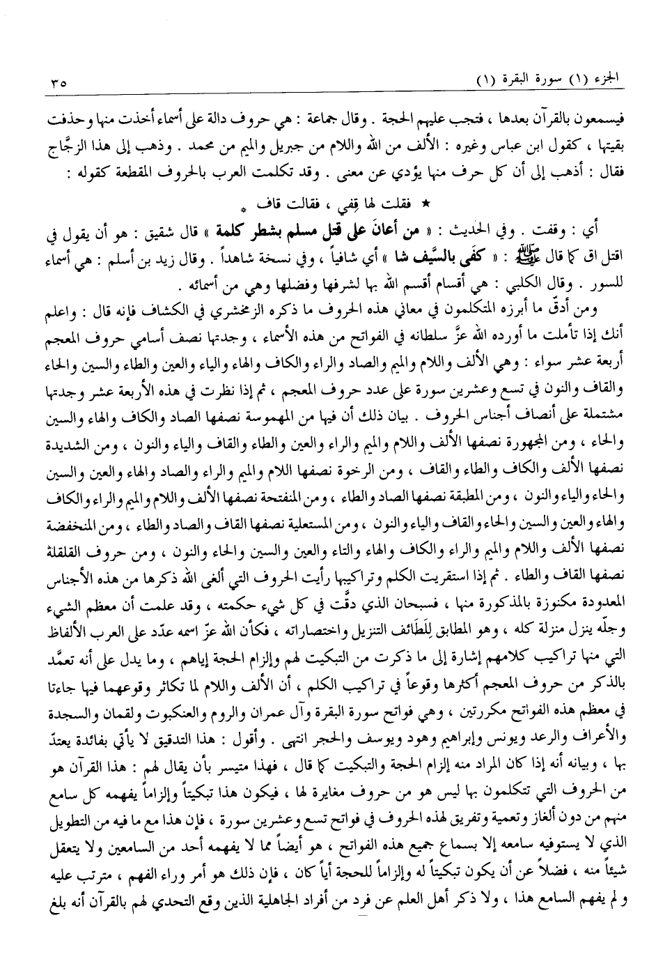 أَيْ: وَقَفْتُ. وَفِي الْحَدِيثِ: «مَنْ أَعَانَ عَلَى قَتْلِ مُسْلِمٍ بِشَطْرِ كَلِمَةٍ» قَالَ شَقِيقٌ: هُوَ أَنْ يَقُولَ فِي اقْتُلْ اقْ كَمَا قَالَ صَلَّى اللَّهُ عَلَيْهِ وَسَلَّمَ: «كَفَى بِالسَّيْفِ شَا» أَيْ شَافِيًا، وَفِي نُسْخَةٍ شَاهِدًا. وَقَالَ زَيْدُ بْنُ أَسْلَمَ: هِيَ أَسْمَاءٌ لِلسُّوَرِ. وَقَالَ الْكَلْبِيُّ: هِيَ أَقْسَامٌ أَقْسَمَ اللَّهُ بِهَا لِشَرَفِهَا وَفَضْلِهَا وَهِيَ مِنْ أَسْمَائِهِ.