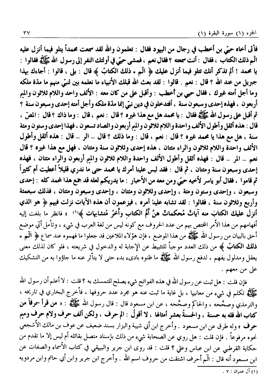 فَأَتَى أَخَاهُ حُيَيَّ بْنَ أَخْطَبَ فِي رِجَالٍ مِنَ الْيَهُودِ فَقَالَ: تَعْلَمُونَ وَاللَّهِ لَقَدْ سَمِعْتُ محمدا يتلوا فِيمَا أُنْزِلَ عَلَيْهِ الم ذَلِكَ الْكِتَابُ، فَقَالَ: أَنْتَ سَمِعْتَهُ؟ فَقَالَ نَعَمْ، فَمَشَى حُيَيٌّ فِي أُولَئِكَ النَّفَرِ إِلَى رَسُولِ اللَّهِ صَلَّى اللَّهُ عَلَيْهِ وَسَلَّمَ فَقَالُوا: