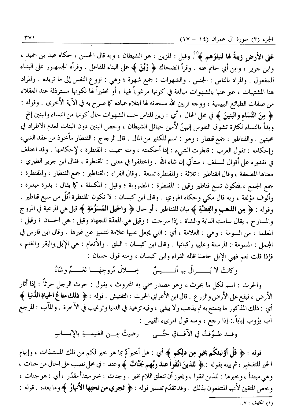 وبدأ بالنساء لكثرة تشوق النُّفُوسِ إِلَيْهِنَّ لِأَنَّهُنَّ حَبَائِلُ الشَّيْطَانِ، وَخَصَّ الْبَنِينَ دُونَ الْبَنَاتِ لِعَدَمِ الِاطِّرَادِ فِي مَحَبَّتِهِنَّ. وَالْقَنَاطِيرُ: جَمْعُ قِنْطَارٍ، وَهُوَ: اسْمٌ لِلْكَثِيرِ مِنَ الْمَالِ. قَالَ الزَّجَّاجُ: الْقِنْطَارُ مَأْخُوذٌ مِنْ عَقْدِ الشَّيْءِ وَإِحْكَامِهِ: تَقُولُ الْعَرَبُ: قَنْطَرْتُ الشَّيْءَ: إِذَا أَحْكَمْتَهُ، وَمِنْهُ سُمِّيَتِ: الْقَنْطَرَةُ، لِإِحْكَامِهَا. وَقَدِ اخْتُلِفَ فِي تَقْدِيرِهِ عَلَى أَقْوَالٍ لِلسَّلَفِ، سَتَأْتِي إِنْ شَاءَ اللَّهُ. وَاخْتَلَفُوا فِي مَعْنَى: الْمُقَنْطَرَةِ، فَقَالَ ابْنُ جَرِيرٍ الطَّبَرِيُّ: