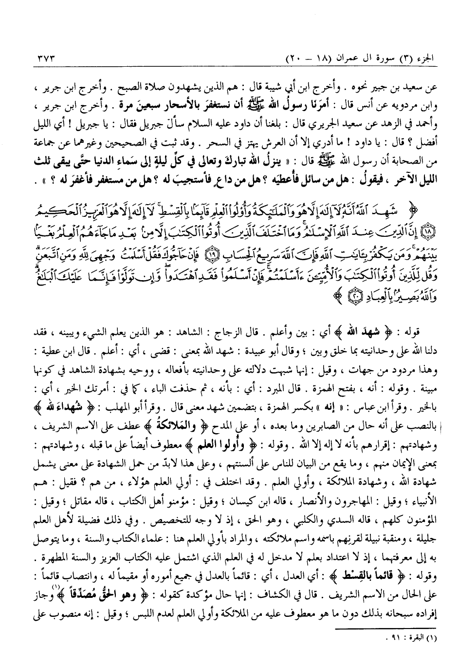 شَهِدَ اللَّهُ أَنَّهُ لَا إِلهَ إِلاَّ هُوَ وَالْمَلائِكَةُ وَأُولُوا الْعِلْمِ قائِماً بِالْقِسْطِ لَا إِلهَ إِلاَّ هُوَ الْعَزِيزُ الْحَكِيمُ (18) إِنَّ الدِّينَ عِنْدَ اللَّهِ الْإِسْلامُ وَمَا اخْتَلَفَ الَّذِينَ أُوتُوا الْكِتابَ إِلاَّ مِنْ بَعْدِ مَا جاءَهُمُ الْعِلْمُ بَغْياً بَيْنَهُمْ وَمَنْ يَكْفُرْ بِآياتِ اللَّهِ فَإِنَّ اللَّهَ سَرِيعُ الْحِسابِ (19) فَإِنْ حَاجُّوكَ فَقُلْ أَسْلَمْتُ وَجْهِيَ لِلَّهِ وَمَنِ اتَّبَعَنِ وَقُلْ لِلَّذِينَ أُوتُوا الْكِتابَ وَالْأُمِّيِّينَ أَأَسْلَمْتُمْ فَإِنْ أَسْلَمُوا فَقَدِ اهْتَدَوْا وَإِنْ تَوَلَّوْا فَإِنَّما عَلَيْكَ الْبَلاغُ وَاللَّهُ بَصِيرٌ بِالْعِبادِ (20)