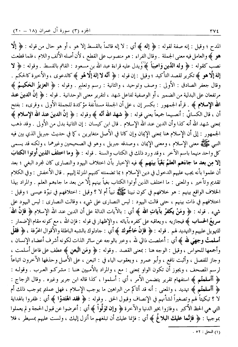 وَقَالَ جَعْفَرٌ الصَّادِقُ: الْأُولَى: وَصْفٌ وَتَوْحِيدٌ، وَالثَّانِيَةُ: رَسْمٌ وَتَعْلِيمٌ. وَقَوْلُهُ: الْعَزِيزُ الْحَكِيمُ مُرْتَفِعَانِ عَلَى الْبَدَلِيَّةِ مِنَ الضَّمِيرِ، أَوِ الْوَصْفِيَّةِ لِفَاعِلِ شَهِدَ، لِتَقْرِيرِ مَعْنَى الْوَحْدَانِيَّةِ. قَوْلُهُ: إِنَّ الدِّينَ عِنْدَ اللَّهِ الْإِسْلامُ. قَرَأَهُ الْجُمْهُورُ: بِكَسْرِ إِنَّ، عَلَى أَنَّ الْجُمْلَةَ مُسْتَأْنَفَةٌ مُؤَكِّدَةٌ لِلْجُمْلَةِ الْأُولَى، وَقُرِئَ: بِفَتْحِ أَنَّ، قَالَ الْكِسَائِيُّ: أَنْصِبُهُمَا جَمِيعًا يَعْنِي قَوْلَهُ: شَهِدَ اللَّهُ أَنَّهُ وَقَوْلَهُ: إِنَّ الدِّينَ عِنْدَ اللَّهِ الْإِسْلامُ بِمَعْنَى شَهِدَ اللَّهُ أَنَّهُ كَذَا وَأَنَّ الدِّينَ عِنْدَ اللَّهِ الْإِسْلَامُ. قَالَ ابْنُ كَيْسَانَ: إِنَّ الثَّانِيَةَ بَدَلٌ مِنَ الْأُولَى. وَقَدْ ذَهَبَ الْجُمْهُورُ: إِلَى أَنَّ الْإِسْلَامَ هُنَا بِمَعْنَى الْإِيمَانِ وَإِنْ كَانَا فِي الْأَصْلِ مُتَغَايِرَيْنِ، كَمَا فِي حَدِيثِ جِبْرِيلَ الَّذِي بَيَّنَ فِيهِ النبي صلّى الله عليه وَسَلَّمَ مَعْنَى الْإِسْلَامِ، وَمَعْنَى الْإِيمَانِ، وَصَدَّقَهُ جِبْرِيلُ، وَهُوَ فِي الصَّحِيحَيْنِ وَغَيْرِهِمَا، وَلَكِنَّهُ قَدْ يُسَمَّى كُلُّ وَاحِدٍ مِنْهُمَا بِاسْمِ الْآخَرِ، وَقَدْ وَرَدَ ذَلِكَ فِي الْكِتَابِ وَالسُّنَّةِ. قَوْلُهُ: وَمَا اخْتَلَفَ الَّذِينَ أُوتُوا الْكِتابَ إِلَّا مِنْ بَعْدِ مَا جاءَهُمُ الْعِلْمُ بَغْياً بَيْنَهُمْ فِيهِ الْإِخْبَارُ بِأَنَّ اخْتِلَافَ الْيَهُودِ وَالنَّصَارَى كَانَ لِمُجَرَّدِ الْبَغْيِ بَعْدَ أَنْ عَلِمُوا بِأَنَّهُ يَجِبُ عَلَيْهِمُ الدُّخُولُ فِي دِينِ الْإِسْلَامِ بِمَا تَضَمَّنَتْهُ كُتُبُهُمُ الْمُنَزَّلَةُ إِلَيْهِمْ. قَالَ الْأَخْفَشُ: وَفِي الْكَلَامِ تَقْدِيمٌ وَتَأْخِيرٌ، وَالْمَعْنَى: مَا اخْتَلَفَ الَّذِينَ أُوتُوا الْكِتَابَ بَغْيًا بَيْنَهُمْ إِلَّا مِنْ بَعْدِ مَا جَاءَهُمُ الْعِلْمُ. وَالْمُرَادُ بِهَذَا الْخِلَافِ الْوَاقِعِ بَيْنَهُمْ: هُوَ خِلَافُهُمْ فِي كون نبينا صلّى الله عليه وَسَلَّمَ نَبِيًّا أَمْ لَا؟ وَقِيلَ: اخْتِلَافُهُمْ فِي نُبُوَّةِ عِيسَى وَقِيلَ: