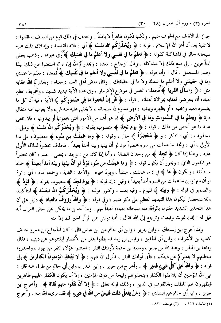 «2» فَجُعِلَتِ النَّفْسُ فِي مَوْضِعِ الْإِضْمَارِ، وَفِي هَذِهِ الْآيَةِ تَهْدِيدٌ شَدِيدٌ، وَتَخْوِيفٌ عَظِيمٌ لِعِبَادِهِ أَنْ يَتَعَرَّضُوا لِعِقَابِهِ بِمُوَالَاةِ أَعْدَائِهِ. قَوْلُهُ: قُلْ إِنْ تُخْفُوا مَا فِي صُدُورِكُمْ الْآيَةَ، فِيهِ أَنَّ كُلَّ مَا يُضْمِرُهُ الْعَبْدُ وَيُخْفِيهِ، أَوْ يُظْهِرُهُ وَيُبْدِيهِ، فَهُوَ مَعْلُومٌ لِلَّهِ سُبْحَانَهُ، لَا يَخْفَى عَلَيْهِ مِنْهُ شَيْءٌ وَلَا يَعْزُبُ عَنْهُ مِثْقَالُ ذَرَّةٍ وَيَعْلَمُ مَا فِي السَّماواتِ وَما فِي الْأَرْضِ مِمَّا هُوَ أَعَمُّ مِنَ الْأُمُورِ الَّتِي يُخْفُونَهَا أَوْ يُبْدُونَهَا، فَلَا يَخْفَى عَلَيْهِ مَا هُوَ أَخَصُّ مِنْ ذَلِكَ. قَوْلُهُ: يَوْمَ تَجِدُ مَنْصُوبٌ بِقَوْلِهِ: وَيُحَذِّرُكُمُ اللَّهُ نَفْسَهُ وَقِيلَ: