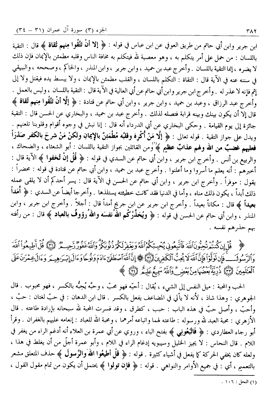 الْحُبُّ وَالْمَحَبَّةُ: مَيْلُ النَّفْسِ إِلَى الشَّيْءِ، يُقَالُ: أَحَبَّهُ فَهُوَ مُحِبٌّ، وَحَبَّهُ يَحِبُّهُ بِالْكَسْرِ، فَهُوَ مَحْبُوبٌ. قَالَ الْجَوْهَرِيُّ: وَهَذَا شَاذٌّ، لِأَنَّهُ لَا يَأْتِي فِي الْمُضَاعَفِ يَفْعِلُ بِالْكَسْرِ. قَالَ ابْنُ الدِّهَانِ: فِي حَبَّ لُغَتَانِ: حَبَّ، وَأَحَبَّ، وأصل حبّ في هذه الْبَابِ: حَبَبَ، كَطَرَقَ، وَقَدْ فُسِّرَتِ الْمَحَبَّةُ لِلَّهِ سُبْحَانَهُ بِإِرَادَةِ طَاعَتِهِ. قَالَ الْأَزْهَرِيُّ: مَحَبَّةُ الْعَبْدِ لِلَّهِ وَرَسُولِهِ: طَاعَتُهُ لَهُمَا وَاتِّبَاعُهُ أَمْرَهُمَا، وَمَحَبَّةُ اللَّهِ لِلْعِبَادِ: إِنْعَامُهُ عَلَيْهِمْ بِالْغُفْرَانِ. وَقَرَأَ أَبُو رَجَاءٍ الْعُطَارِدِيُّ: فَاتَّبِعُونِي بِفَتْحِ الْبَاءِ، وَرُوِيَ عَنْ أبي عمرة بْنِ الْعَلَاءِ أَنَّهُ أَدْغَمَ الرَّاءَ مِنْ يَغْفِرْ فِي اللَّامِ. قَالَ النَّحَّاسُ: لَا يُجِيزُ الْخَلِيلُ وسيبويه إدغام الراء في اللام، وأبو عمرة أَجَلُّ مَنْ أَنْ يَغْلَطَ فِي هَذَا، وَلَعَلَّهُ كان يخفي الحركة كما يفعل في أَشْيَاءَ كَثِيرَةً. قَوْلُهُ: قُلْ أَطِيعُوا اللَّهَ وَالرَّسُولَ حَذْفُ الْمُتَعَلِّقِ مُشْعِرٌ بِالتَّعْمِيمِ، أَيْ: في جميع الْأَوَامِرِ وَالنَّوَاهِي. قَوْلُهُ: فَإِنْ تَوَلَّوْا يَحْتَمِلُ أَنْ يكون من تمام مقول القول،