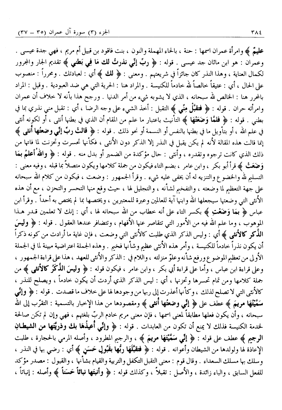 وَعِمْرَانُ: هُوَ ابْنُ مَاثَانَ جَدُّ عِيسَى. قَوْلُهُ: رَبِّ إِنِّي نَذَرْتُ لَكَ مَا فِي بَطْنِي تَقْدِيمُ الْجَارِّ وَالْمَجْرُورِ لِكَمَالِ الْعِنَايَةِ، وَهَذَا النَّذْرُ كَانَ جَائِزًا فِي شَرِيعَتِهِمْ. وَمَعْنَى: لَكَ أَيْ: لِعِبَادَتِكَ. وَمُحَرَّرًا: مَنْصُوبٌ عَلَى الْحَالِ، أَيْ: عَتِيقًا خَالِصًا لِلَّهِ خَادِمًا لِلْكَنِيسَةِ. وَالْمُرَادُ هُنَا: الْحُرِّيَّةُ الَّتِي هِيَ ضِدُّ الْعُبُودِيَّةِ. وَقِيلَ: الْمُرَادُ بِالْمُحَرَّرِ هُنَا: الْخَالِصُ لِلَّهِ سُبْحَانَهُ، الَّذِي لَا يَشُوبُهُ شَيْءٌ مِنْ أَمْرِ الدُّنْيَا. وَرَجَّحَ هَذَا بِأَنَّهُ لَا خِلَافَ أَنَّ عِمْرَانَ وَامْرَأَتَهُ حُرَّانِ. قَوْلُهُ: فَتَقَبَّلْ مِنِّي التَّقَبُّلُ: أَخْذُ الشَّيْءِ عَلَى وَجْهِ الرِّضَا، أَيْ: تَقَبَّلْ مِنِّي نَذْرِي بِمَا فِي بَطْنِي. قَوْلُهُ: فَلَمَّا وَضَعَتْها التَّأْنِيثُ بِاعْتِبَارِ مَا عُلِمَ مِنَ الْمَقَامِ أَنَّ الَّذِي فِي بَطْنِهَا أُنْثَى، أَوْ لِكَوْنِهِ أُنْثَى فِي عِلْمِ اللَّهِ، أَوْ بِتَأْوِيلِ مَا فِي بَطْنِهَا بِالنَّفْسِ أَوِ النَّسَمَةِ أَوْ نَحْوِ ذَلِكَ. قَوْلُهُ: قالَتْ رَبِّ إِنِّي وَضَعْتُها أُنْثى إِنَّمَا قَالَتْ هَذِهِ الْمَقَالَةَ لِأَنَّهُ لَمْ يَكُنْ يُقْبَلُ فِي النَّذْرِ إِلَّا الذَّكَرُ دُونَ الْأُنْثَى، فَكَأَنَّهَا تَحَسَّرَتْ وَتَحَزَّنَتْ لِمَا فَاتَهَا مِنْ ذَلِكَ الَّذِي كَانَتْ تَرْجُوهُ وَتُقَدِّرُهُ، وَأُنْثَى: حَالٌ مُؤَكَّدَةٌ مِنَ الضَّمِيرِ أَوْ بَدَلٌ مِنْهُ. قَوْلُهُ: وَاللَّهُ أَعْلَمُ بِما وَضَعَتْ قَرَأَ أَبُو بَكْرٍ، وَابْنُ عَامِرٍ، بِضَمِّ التَّاءِ فَيَكُونُ مِنْ جُمْلَةِ كَلَامِهَا وَيَكُونُ مُتَّصِلًا بِمَا قَبْلَهُ، وَفِيهِ مَعْنَى: