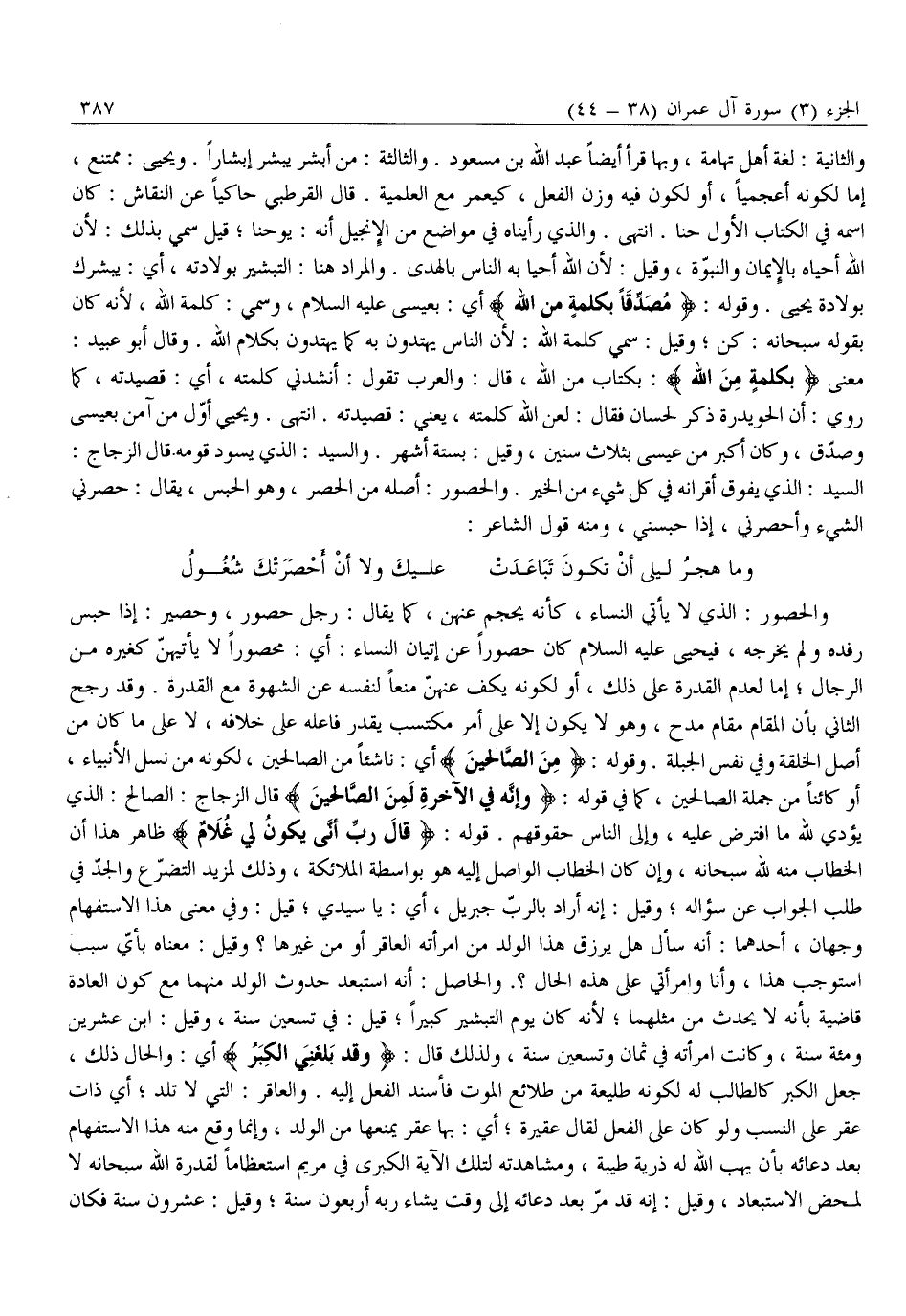 وَالْحَصُورُ: الَّذِي لَا يَأْتِي النِّسَاءَ، كَأَنَّهُ يُحْجِمُ عَنْهُنَّ، كَمَا يُقَالُ: رَجُلٌ حَصُورٌ، وَحَصِيرٌ: إِذَا حَبَسَ رِفْدَهُ وَلَمْ يُخْرِجْهُ، فَيَحْيَى عَلَيْهِ السَّلَامُ كَانَ حَصُورًا عَنْ إِتْيَانِ النِّسَاءِ: أَيْ: مَحْصُورًا لَا يَأْتِيهِنَّ كَغَيْرِهِ مِنَ الرِّجَالِ إِمَّا لِعَدَمِ الْقُدْرَةِ عَلَى ذَلِكَ، أَوْ لِكَوْنِهِ يَكُفُّ عَنْهُنَّ مَنْعًا لِنَفْسِهِ عَنِ الشَّهْوَةِ مَعَ الْقُدْرَةِ. وَقَدْ رُجِّحَ الثَّانِي بِأَنَّ الْمَقَامَ مَقَامُ مَدْحٍ، وَهُوَ لَا يَكُونُ إِلَّا عَلَى أَمْرٍ مُكْتَسَبٍ يَقْدِرُ فَاعِلُهُ عَلَى خِلَافِهِ، لَا عَلَى مَا كَانَ مِنْ أَصْلِ الْخِلْقَةِ وَفِي نَفْسِ الْجِبِلَّةِ. وَقَوْلُهُ: مِنَ الصَّالِحِينَ أَيْ: نَاشِئًا مِنَ الصَّالِحِينَ، لِكَوْنِهِ مِنْ نَسْلِ الْأَنْبِيَاءِ، أَوْ كَائِنًا مِنْ جُمْلَةِ الصَّالِحِينَ، كَمَا فِي قَوْلِهِ: وَإِنَّهُ فِي الْآخِرَةِ لَمِنَ الصَّالِحِينَ قَالَ الزَّجَّاجُ: الصَّالِحُ: الَّذِي يُؤَدِّي لِلَّهِ مَا افْتَرَضَ عَلَيْهِ، وَإِلَى النَّاسِ حُقُوقَهُمْ. قَوْلُهُ: قالَ رَبِّ أَنَّى يَكُونُ لِي غُلامٌ ظَاهِرُ هَذَا أَنَّ الْخِطَابَ مِنْهُ لِلَّهِ سُبْحَانَهُ، وَإِنْ كَانَ الْخِطَابُ الْوَاصِلُ إِلَيْهِ هُوَ بِوَاسِطَةِ الْمَلَائِكَةِ، وَذَلِكَ لِمَزِيدِ التَّضَرُّعِ وَالْجِدُّ فِي طَلَبِ الْجَوَابِ عَنْ سُؤَالِهِ وَقِيلَ: إِنَّهُ أَرَادَ بِالرَّبِّ جِبْرِيلَ، أَيْ: يَا سَيِّدِي قِيلَ: وَفِي مَعْنَى هَذَا الِاسْتِفْهَامِ وَجْهَانِ، أَحَدُهُمَا: أَنَّهُ سَأَلَ هَلْ يُرْزَقُ هَذَا الْوَلَدَ مِنِ امْرَأَتِهِ الْعَاقِرِ أَوْ مِنْ غَيْرِهَا؟ وَقِيلَ: مَعْنَاهُ بِأَيِّ سَبَبٍ أَسْتَوْجِبُ هَذَا، وَأَنَا وَامْرَأَتِي عَلَى هَذِهِ الْحَالِ؟. وَالْحَاصِلُ: أَنَّهُ اسْتَبْعَدَ حُدُوثَ الْوَلَدِ مِنْهُمَا مَعَ كَوْنِ الْعَادَةِ قَاضِيَةً بِأَنَّهُ لَا يَحْدُثُ مَنْ مِثْلِهِمَا لِأَنَّهُ كَانَ يَوْمُ التَّبْشِيرِ كَبِيرًا قِيلَ: فِي تِسْعِينَ سَنَةً، وَقِيلَ: ابْنُ عِشْرِينَ وَمِائَةِ سَنَةٍ، وَكَانَتِ امْرَأَتُهُ فِي ثَمَانٍ وَتِسْعِينَ سَنَةً، وَلِذَلِكَ قَالَ: وَقَدْ بَلَغَنِيَ الْكِبَرُ أَيْ: وَالْحَالُ ذَلِكَ، جَعَلَ الْكِبَرَ كَالطَّالِبِ لَهُ لِكَوْنِهِ طَلِيعَةً مِنْ طَلَائِعِ الْمَوْتِ فَأَسْنَدَ الْفِعْلَ إِلَيْهِ. وَالْعَاقِرُ: الَّتِي لَا تَلِدُ أَيْ ذَاتُ عُقْرٍ عَلَى النَّسَبِ وَلَوْ كَانَ عَلَى الْفِعْلِ لَقَالَ عَقِيرَةٌ أَيْ: بِهَا عُقْرٌ يَمْنَعُهَا مِنَ الْوَلَدِ، وَإِنَّمَا وَقَعَ مِنْهُ هَذَا الِاسْتِفْهَامُ بَعْدَ دُعَائِهِ بِأَنْ يَهَبَ اللَّهُ لَهُ ذُرِّيَّةً طَيِّبَةً، وَمُشَاهَدَتُهُ لِتِلْكَ الْآيَةِ الْكُبْرَى فِي مَرْيَمَ اسْتِعْظَامًا لِقُدْرَةِ اللَّهِ سُبْحَانَهُ لَا لِمَحْضِ الِاسْتِبْعَادِ، وَقِيلَ: إِنَّهُ قَدْ مَرَّ بَعْدَ دُعَائِهِ إِلَى وَقْتٍ يَشَاءُ رَبُّهُ أَرْبَعُونَ سَنَةً وَقِيلَ: عِشْرُونَ سَنَةً فَكَانَ