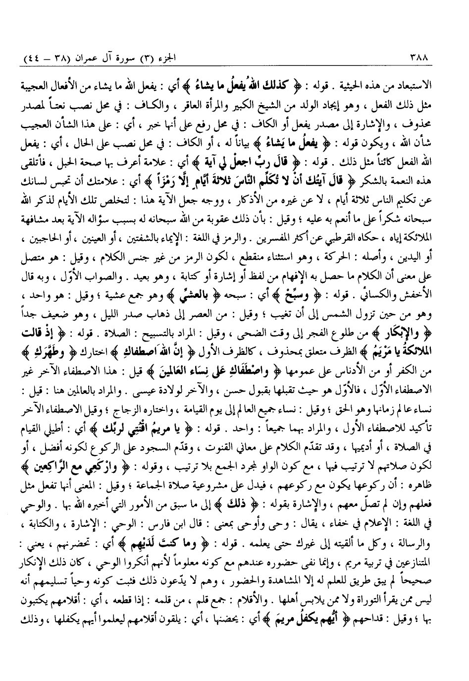 بَيَانًا لَهُ، أَوِ الْكَافُ: فِي مَحَلِّ نَصْبٍ عَلَى الْحَالِ، أَيْ: يَفْعَلُ اللَّهُ الْفِعْلَ كَائِنًا مِثْلَ ذَلِكَ. قَوْلُهُ: قالَ رَبِّ اجْعَلْ لِي آيَةً أَيْ: عَلَامَةً أَعْرِفُ بِهَا صِحَّةَ الْحَبَلِ، فَأَتَلَقَّى هَذِهِ النِّعْمَةَ بالشكر قالَ آيَتُكَ أَلَّا تُكَلِّمَ النَّاسَ ثَلاثَةَ أَيَّامٍ إِلَّا رَمْزاً أَيْ: عَلَامَتُكَ أَنْ تَحْبِسَ لِسَانَكَ عَنْ تَكْلِيمِ النَّاسِ ثَلَاثَةَ أَيَّامٍ، لَا عَنْ غَيْرِهِ مِنَ الْأَذْكَارِ، وَوَجْهُ جَعْلِ الْآيَةِ هَذَا: لِتَخْلُصَ تِلْكَ الْأَيَّامُ لِذِكْرِ اللَّهِ سُبْحَانَهُ شُكْرًا عَلَى مَا أَنْعَمَ بِهِ عَلَيْهِ وَقِيلَ: بِأَنَّ ذَلِكَ عُقُوبَةٌ مِنَ اللَّهِ سُبْحَانَهُ لَهُ بِسَبَبِ سُؤَالِهِ الْآيَةَ بَعْدَ مُشَافَهَةِ الْمَلَائِكَةِ إِيَّاهُ، حَكَاهُ الْقُرْطُبِيُّ عَنْ أَكْثَرِ الْمُفَسِّرِينَ. وَالرَّمْزُ فِي اللُّغَةِ: الْإِيمَاءُ بِالشَّفَتَيْنِ، أَوِ الْعَيْنَيْنِ، أَوِ الْحَاجِبَيْنِ، أَوِ الْيَدَيْنِ، وَأَصْلُهُ: الْحَرَكَةُ، وَهُوَ اسْتِثْنَاءٌ مُنْقَطِعٌ، لِكَوْنِ الرَّمْزِ مِنْ غَيْرِ جِنْسِ الْكَلَامِ، وَقِيلَ: هُوَ مُتَّصِلٌ عَلَى مَعْنَى أَنَّ الْكَلَامَ مَا حَصَلَ بِهِ الْإِفْهَامُ مِنْ لَفْظٍ أَوْ إِشَارَةٍ أَوْ كِتَابَةٍ، وَهُوَ بَعِيدٌ. وَالصَّوَابُ الْأَوَّلُ، وَبِهِ قَالَ الْأَخْفَشُ وَالْكِسَائِيُّ. قَوْلُهُ: وَسَبِّحْ أَيْ: سَبِّحْهُ بِالْعَشِيِّ وَهُوَ جَمْعُ عَشِيَّةٍ وَقِيلَ: هُوَ وَاحِدٌ، وَهُوَ مِنْ حِينِ تَزُولُ الشَّمْسُ إِلَى أَنْ تَغِيبَ وَقِيلَ: مِنَ الْعَصْرِ إِلَى ذَهَابِ صَدْرِ اللَّيْلِ، وَهُوَ ضَعِيفٌ جِدًّا وَالْإِبْكارِ مِنْ طُلُوعِ الْفَجْرِ إِلَى وَقْتِ الضُّحَى، وَقِيلَ: الْمُرَادُ بِالتَّسْبِيحِ: الصَّلَاةُ. قوله: إِذْ قالَتِ الْمَلائِكَةُ يا مَرْيَمُ الظَّرْفُ مُتَعَلِّقٌ بِمَحْذُوفٍ، كَالظَّرْفِ الْأَوَّلِ إِنَّ اللَّهَ اصْطَفاكِ اخْتَارَكِ وَطَهَّرَكِ مِنَ الْكُفْرِ أَوْ مِنَ الأدناس عَلَى عُمُومِهَا وَاصْطَفاكِ عَلى نِساءِ الْعالَمِينَ قِيلَ: هَذَا الِاصْطِفَاءُ الْآخَرُ غَيْرُ الِاصْطِفَاءِ الْأَوَّلِ، فَالْأَوَّلُ هُوَ حَيْثُ تَقَبَلَّهَا بِقَبُولٍ حَسَنٍ، وَالْآخَرُ لِوِلَادَةِ عِيسَى. وَالْمُرَادُ بِالْعَالَمِينَ هُنَا: قِيلَ: