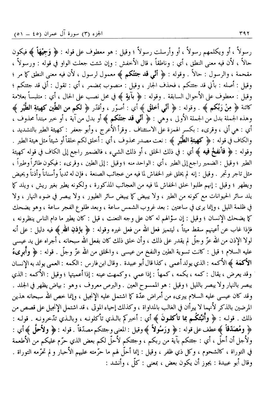 وَقَوْلُهُ: فَأَنْفُخُ فِيهِ أَيْ: فِي ذَلِكَ الْخَلْقِ، أَوْ ذَلِكَ الشَّيْءِ، فَالضَّمِيرُ رَاجِعٌ إِلَى الْكَافِ فِي قَوْلِهِ كَهَيْئَةِ الطَّيْرِ وَقِيلَ: الضَّمِيرُ رَاجِعٌ إِلَى الطَّيْرِ، أَيِ: الْوَاحِدُ مِنْهُ وَقِيلَ: إِلَى الطِّينِ، وَقُرِئَ: فَيَكُونُ طَائِرًا وَطَيْرًا، مِثْلَ تَاجِرٍ وَتَجْرٍ. وَقِيلَ: إِنَّهُ لَمْ يَخْلُقْ غَيْرَ الْخُفَّاشِ لِمَا فِيهِ مِنْ عَجَائِبِ الصَّنْعَةِ، فَإِنَّ لَهُ ثَدْيًا وَأَسْنَانًا وَأُذُنًا وَيَحِيضُ وَيَطْهُرُ وَقِيلَ: إِنَّهُمْ طَلَبُوا خَلْقَ الْخُفَّاشِ لِمَا فِيهِ مِنَ الْعَجَائِبِ الْمَذْكُورَةِ، وَلِكَوْنِهِ يَطِيرُ بِغَيْرِ رِيشٍ، وَيَلِدُ كَمَا يَلِدُ سَائِرُ الْحَيَوَانَاتِ مَعَ كَوْنِهِ مِنَ الطَّيْرِ، وَلَا يَبِيضُ كَمَا يَبِيضُ سَائِرُ الطُّيُورِ، وَلَا يُبْصِرُ فِي ضَوْءِ النَّهَارِ، وَلَا فِي ظُلْمَةِ اللَّيْلِ، وَإِنَّمَا يَرَى فِي سَاعَتَيْنِ: بَعْدَ غُرُوبِ الشَّمْسِ سَاعَةً، وَبَعْدَ طُلُوعِ الْفَجْرِ سَاعَةً، وَهُوَ يَضْحَكُ كَمَا يَضْحَكُ الْإِنْسَانُ وَقِيلَ: إِنَّ سُؤَالَهُمْ لَهُ كَانَ عَلَى وَجْهِ التَّعَنُّتِ، قِيلَ: كَانَ يَطِيرُ مَا دَامَ النَّاسُ يَنْظُرُونَهُ، فَإِذَا غَابَ عَنْ أَعْيُنِهِمْ سَقَطَ مَيِّتًا، لِيَتَمَيَّزَ فِعْلُ اللَّهِ مِنْ فِعْلِ غَيْرِهِ وَقَوْلُهُ: بِإِذْنِ اللَّهِ فِيهِ دَلِيلٌ: عَلَى أَنَّهُ لَوْلَا الْإِذْنُ مِنَ اللَّهِ عَزَّ وَجَلَّ لَمْ يَقْدِرْ عَلَى ذَلِكَ، وَأَنَّ خَلْقَ ذَلِكَ كَانَ بِفِعْلِ اللَّهِ سُبْحَانَهُ، أَجْرَاهُ عَلَى يَدِ عِيسَى عَلَيْهِ السَّلَامُ قِيلَ: كَانَتْ تَسْوِيَةُ الطِّينِ وَالنَّفْخِ مِنْ عِيسَى، وَالْخَلْقُ مِنَ اللَّهِ عَزَّ وَجَلَّ. قَوْلُهُ: وَأُبْرِئُ الْأَكْمَهَ الْأَكْمَهُ: الَّذِي يُولَدُ أَعْمَى، كَذَا قَالَ أَبُو عُبَيْدَةَ. وَقَالَ ابْنُ فَارِسٍ: الْكَمَهُ: الْعَمَى يُوَلَدُ بِهِ الْإِنْسَانُ وَقَدْ يَعْرِضُ، يُقَالُ: كَمِهَ، يَكْمَهُ، كَمَهًا: إِذَا عَمِيَ، وَكَمِهْتُ عَيْنَهُ: إِذَا أَعْمَيْتَهَا وَقِيلَ: الْأَكْمَهُ: الَّذِي يُبْصِرُ بِالنَّهَارِ وَلَا يُبْصِرُ بِاللَّيْلِ وَقِيلَ: هُوَ الْمَمْسُوحُ الْعَيْنِ. وَالْبَرَصُ مَعْرُوفٌ، وَهُوَ: بَيَاضٌ يَظْهَرُ فِي الْجِلْدِ.