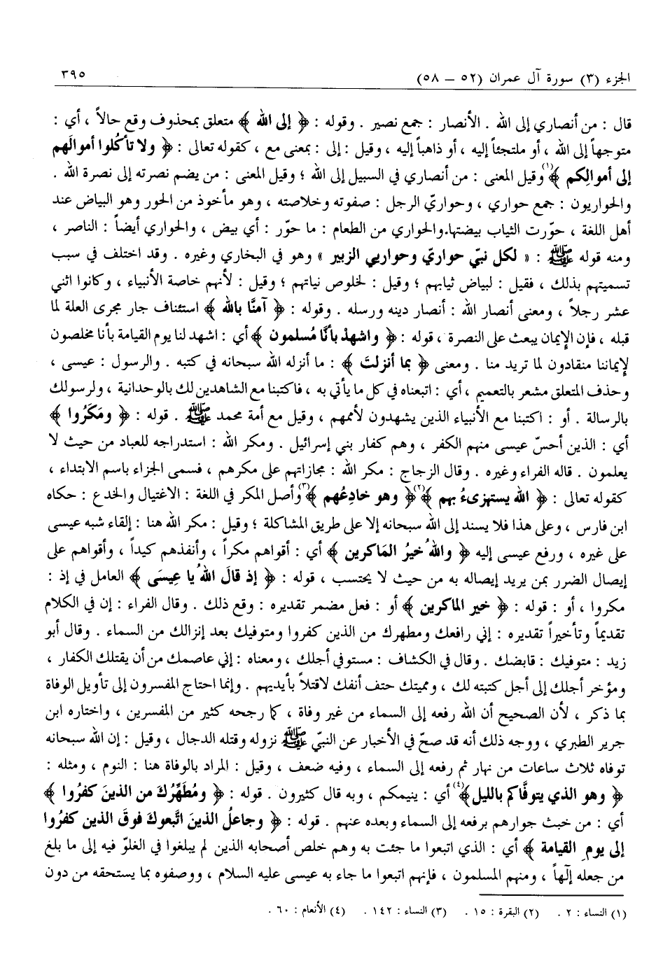 وَالْحَوَارِيُّونَ: جَمْعُ حَوَارِيٍّ، وَحَوَارِيُّ الرَّجُلِ: صَفْوَتُهُ وَخُلَاصَتُهُ، وَهُوَ مَأْخُوذٌ مِنَ الْحَوَرِ وَهُوَ الْبَيَاضُ عِنْدَ أَهْلِ اللُّغَةِ، حَوَّرْتُ الثِّيَابَ بَيَّضْتُهَا. وَالْحَوَارِيُّ مِنَ الطَّعَامِ: مَا حُوِّرَ: أَيْ بُيِّضَ، وَالْحَوَارِيُّ أَيْضًا: النَّاصِرُ، وَمِنْهُ قَوْلُهُ صَلَّى اللَّهُ عليه وَسَلَّمَ: «لِكُلِّ نَبِيٍّ حَوَارِيٌّ وَحَوَارِيِّي الزُّبَيْرُ» وَهُوَ فِي الْبُخَارِيِّ وَغَيْرِهِ. وَقَدِ اخْتُلِفَ فِي سَبَبِ تَسْمِيَتِهِمْ بِذَلِكَ، فَقِيلَ: لِبَيَاضِ ثِيَابِهِمْ وَقِيلَ: لِخُلُوصِ نِيَّاتِهِمْ وَقِيلَ: لِأَنَّهُمْ خَاصَّةُ الْأَنْبِيَاءِ، وَكَانُوا اثْنَيْ عَشَرَ رَجُلًا، وَمَعْنَى أَنْصَارِ اللَّهِ: أَنْصَارُ دِينِهِ وَرُسُلِهِ. وَقَوْلُهُ: آمَنَّا بِاللَّهِ اسْتِئْنَافٌ جَارٍ مَجْرَى الْعِلَّةِ لِمَا قَبْلَهُ، فَإِنَّ الْإِيمَانَ يَبْعَثُ عَلَى النُّصْرَةِ، قَوْلُهُ: وَاشْهَدْ بِأَنَّا مُسْلِمُونَ أَيِ: اشْهَدْ لَنَا يَوْمَ الْقِيَامَةِ بِأَنَّا مُخْلِصُونَ لِإِيمَانِنَا مُنْقَادُونَ لِمَا تُرِيدُ مِنَّا. وَمَعْنَى بِما أَنْزَلْتَ: مَا أَنْزَلَهُ اللَّهُ سُبْحَانَهُ فِي كُتُبِهِ. وَالرَّسُولُ: عِيسَى، وَحَذْفُ الْمُتَعَلِّقِ مُشْعِرٌ بِالتَّعْمِيمِ، أَيِ: اتَّبَعْنَاهُ فِي كُلِّ مَا يَأْتِي بِهِ، فَاكْتُبْنَا مَعَ الشَّاهِدِينَ لَكَ بِالْوَحْدَانِيَّةِ، وَلِرَسُولِكَ بِالرِّسَالَةِ. أَوِ: اكْتُبْنَا مَعَ الْأَنْبِيَاءِ الَّذِينَ يَشْهَدُونَ لِأُمَمِهِمْ، وَقِيلَ مَعَ أُمَّةِ محمد صلّى الله عليه وَسَلَّمَ. قَوْلُهُ: وَمَكَرُوا أَيِ: الَّذِينَ أَحَسَّ عِيسَى مِنْهُمُ الْكُفْرَ، وَهُمْ كُفَّارُ بَنِي إِسْرَائِيلَ. وَمَكْرُ اللَّهِ: اسْتِدْرَاجُهُ لِلْعِبَادِ مِنْ حَيْثُ لَا يَعْلَمُونَ. قَالَهُ الْفَرَّاءُ وَغَيْرُهُ. وَقَالَ الزَّجَّاجُ: مَكْرُ اللَّهِ: مُجَازَاتُهُمْ عَلَى مَكْرِهِمْ، فَسُمِّيَ الْجَزَاءُ بِاسْمِ الِابْتِدَاءِ، كقوله تعالى: اللَّهُ يَسْتَهْزِئُ بِهِمْ «2» وَهُوَ خادِعُهُمْ