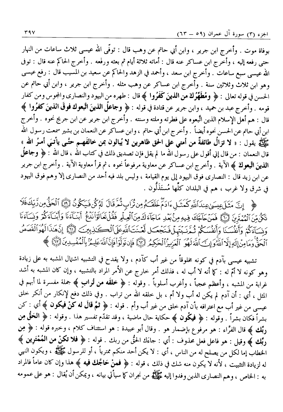 إِنَّ مَثَلَ عِيسى عِنْدَ اللَّهِ كَمَثَلِ آدَمَ خَلَقَهُ مِنْ تُرابٍ ثُمَّ قالَ لَهُ كُنْ فَيَكُونُ (59) الْحَقُّ مِنْ رَبِّكَ فَلا تَكُنْ مِنَ الْمُمْتَرِينَ (60) فَمَنْ حَاجَّكَ فِيهِ مِنْ بَعْدِ مَا جاءَكَ مِنَ الْعِلْمِ فَقُلْ تَعالَوْا نَدْعُ أَبْناءَنا وَأَبْناءَكُمْ وَنِساءَنا وَنِساءَكُمْ وَأَنْفُسَنا وَأَنْفُسَكُمْ ثُمَّ نَبْتَهِلْ فَنَجْعَلْ لَعْنَتَ اللَّهِ عَلَى الْكاذِبِينَ (61) إِنَّ هَذَا لَهُوَ الْقَصَصُ الْحَقُّ وَما مِنْ إِلهٍ إِلاَّ اللَّهُ وَإِنَّ اللَّهَ لَهُوَ الْعَزِيزُ الْحَكِيمُ (62) فَإِنْ تَوَلَّوْا فَإِنَّ اللَّهَ عَلِيمٌ بِالْمُفْسِدِينَ (63)