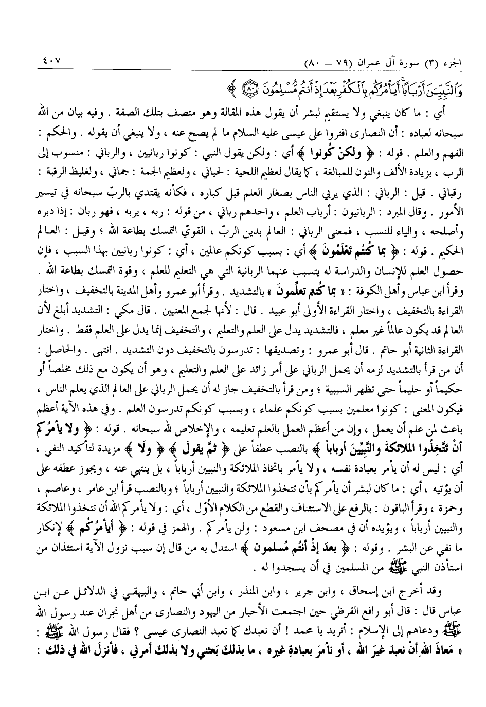 مَا كانَ لِبَشَرٍ أَنْ يُؤْتِيَهُ اللَّهُ الْكِتابَ وَالْحُكْمَ وَالنُّبُوَّةَ ثُمَّ يَقُولَ لِلنَّاسِ كُونُوا عِباداً لِي مِنْ دُونِ اللَّهِ وَلكِنْ كُونُوا رَبَّانِيِّينَ بِما كُنْتُمْ تُعَلِّمُونَ الْكِتابَ وَبِما كُنْتُمْ تَدْرُسُونَ (79) وَلا يَأْمُرَكُمْ أَنْ تَتَّخِذُوا الْمَلائِكَةَ وَالنَّبِيِّينَ أَرْباباً أَيَأْمُرُكُمْ بِالْكُفْرِ بَعْدَ إِذْ أَنْتُمْ مُسْلِمُونَ (80)