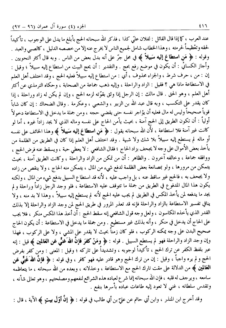 إِنَّ: مَنْ، حَرْفُ شَرْطٍ، وَالْجَزَاءُ مَحْذُوفٌ، أَيْ: مَنِ اسْتَطَاعَ إِلَيْهِ سَبِيلًا فَعَلَيْهِ الْحَجُّ، وَقَدِ اخْتَلَفَ أَهْلُ الْعِلْمِ فِي الِاسْتِطَاعَةِ مَاذَا هِيَ؟ فَقِيلَ: الزَّادُ وَالرَّاحِلَةُ، وَإِلَيْهِ ذَهَبَ جَمَاعَةٌ مِنَ الصَّحَابَةِ، وَحَكَاهُ التِّرْمِذِيُّ عَنْ أَكْثَرِ أَهْلِ الْعِلْمِ، وَهُوَ الْحَقُّ. قَالَ مَالِكٌ: إِنَّ الرَّجُلَ إِذَا وَثِقَ بِقُوَّتِهِ لَزِمَهُ الْحَجُّ، وَإِنْ لَمْ يَكُنْ لَهُ زَادٌ وَرَاحِلَةٌ، إِذَا كَانَ يَقْدِرُ عَلَى التَّكَسُّبِ، وَبِهِ قَالَ عَبْدُ اللَّهِ بْنُ الزُّبَيْرِ، وَالشَّعْبِيُّ، وَعِكْرِمَةُ. وَقَالَ الضَّحَّاكُ: إِنْ كَانَ شَابًّا قَوِيًّا صَحِيحًا وَلَيْسَ لَهُ مَالٌ فَعَلَيْهِ أَنْ يُؤَاجِرَ نَفْسَهُ حَتَّى يَقْضِيَ حَجَّهُ، وَمِنْ جُمْلَةِ مَا يَدْخُلُ فِي الِاسْتِطَاعَةِ دُخُولًا أَوَّلِيًّا: أَنْ تَكُونَ الطَّرِيقُ إِلَى الْحَجِّ آمِنَةً، بِحَيْثُ يَأْمَنُ الْحَاجُّ عَلَى نَفْسِهِ وَمَالِهِ الَّذِي لَا يَجِدُ زَادًا غَيْرَهُ، أَمَّا لَوْ كَانَتْ غَيْرَ آمِنَةٍ فَلَا اسْتِطَاعَةَ، لَأَنَّ اللَّهَ سُبْحَانَهُ يَقُولُ: مَنِ اسْتَطاعَ إِلَيْهِ سَبِيلًا وَهَذَا الْخَائِفُ عَلَى نَفْسِهِ أَوْ مَالِهِ لَمْ يَسْتَطِعْ إِلَيْهِ سَبِيلًا بِلَا شَكٍّ وَلَا شُبْهَةٍ. وَقَدِ اخْتَلَفَ أَهْلُ الْعِلْمِ إِذَا كَانَ فِي الطَّرِيقِ مِنَ الظَّلَمَةِ من يأخذ بعض الأموال على وجه لا يجحف بزاد الحاج فَقَالَ الشَّافِعِيُّ: لَا يُعْطِي حَبَّةً، وَيَسْقُطُ عَنْهُ فَرْضُ الْحَجِّ، وَوَافَقَهُ جَمَاعَةٌ، وَخَالَفَهُ آخَرُونَ. وَالظَّاهِرُ: أَنَّ مَنْ تَمَكَّنَ مِنَ الزَّادِ وَالرَّاحِلَةِ، وَكَانَتِ الطَّرِيقُ آمِنَةً، بِحَيْثُ يَتَمَكَّنُ مِنْ مُرُورِهَا، وَلَوْ بِمُصَانَعَةِ بَعْضِ الظَّلَمَةِ لِدَفْعِ شَيْءٍ مِنَ الْمَالِ، يتمكن منه الْحَاجُّ، وَلَا يَنْقُصُ مِنْ زَادِهِ وَلَا يُجْحِفُ بِهِ، فَالْحَجُّ غَيْرُ سَاقِطٍ عَنْهُ، بَلْ وَاجِبٌ عَلَيْهِ، لِأَنَّهُ قَدِ اسْتَطَاعَ السَّبِيلَ بِدَفْعِ شَيْءٍ مِنَ الْمَالِ، وَلَكِنَّهُ يَكُونُ هَذَا الْمَالُ الْمَدْفُوعُ فِي الطَّرِيقِ مِنْ جُمْلَةِ مَا تَتَوَقَّفُ عَلَيْهِ الِاسْتِطَاعَةُ، فَلَوْ وَجَدَ الرَّجُلُ زَادًا وَرَاحِلَةً وَلَمْ يَجِدْ مَا يَدْفَعُهُ لِمَنْ يَأْخُذُ الْمَكْسَ فِي الطَّرِيقِ لَمْ يَجِبْ عَلَيْهِ الْحَجُّ لِأَنَّهُ لَمْ يَسْتَطِعْ إِلَيْهِ سَبِيلًا، وَهَذَا لَا بُدَّ مِنْهُ، وَلَا يُنَافِي تَفْسِيرَ الِاسْتِطَاعَةِ بِالزَّادِ وَالرَّاحِلَةِ فَإِنَّهُ قَدْ تَعَذَّرَ الْمُرُورُ فِي طَرِيقِ الْحَجِّ لِمَنْ وَجَدَ الزَّادَ وَالرَّاحِلَةَ إِلَّا بِذَلِكَ الْقَدْرِ الَّذِي يَأْخُذُهُ الْمَكَّاسُونَ، وَلَعَلَّ وَجْهَ قَوْلِ الشَّافِعِيِّ إِنَّهُ سَقَطَ الْحَجُّ: أَنَّ أَخْذَ هَذَا الْمَكْسِ مُنْكَرٌ، فَلَا يَجِبُ عَلَى الْحَاجِّ أَنْ يَدْخُلَ فِي مُنْكَرٍ، وَأَنَّهُ بِذَلِكَ غَيْرُ مُسْتَطِيعٍ. وَمِنْ جُمْلَةِ مَا يَدْخُلُ فِي الِاسْتِطَاعَةِ: أَنْ يَكُونَ الْحَاجُّ صَحِيحَ الْبَدَنِ عَلَى وَجْهٍ يُمْكِنُهُ الرُّكُوبُ، فَلَوْ كَانَ زَمِنًا بِحَيْثُ لَا يَقْدِرُ عَلَى الْمَشْيِ، وَلَا عَلَى الرُّكُوبِ، فَهَذَا وَإِنْ وَجَدَ الزَّادَ والراحلة فهو لم يستطيع السَّبِيلَ. قَوْلُهُ: وَمَنْ كَفَرَ فَإِنَّ اللَّهَ غَنِيٌّ عَنِ الْعالَمِينَ قِيلَ: إِنَّهُ عَبَّرَ بِلَفْظِ الْكُفْرِ عَنْ تَرْكِ الْحَجِّ، تَأْكِيدًا لِوُجُوبِهِ، وَتَشْدِيدًا عَلَى تَارِكِهِ وَقِيلَ: الْمَعْنَى: وَمَنْ كَفَرَ بِفَرْضِ الْحَجِّ وَلَمْ يَرَهُ وَاجِبًا، وَقِيلَ: إِنَّ مَنْ تَرَكَ الْحَجَّ وَهُوَ قَادِرٌ عَلَيْهِ فَهُوَ كَافِرٌ، وَفِي قَوْلِهِ: فَإِنَّ اللَّهَ غَنِي