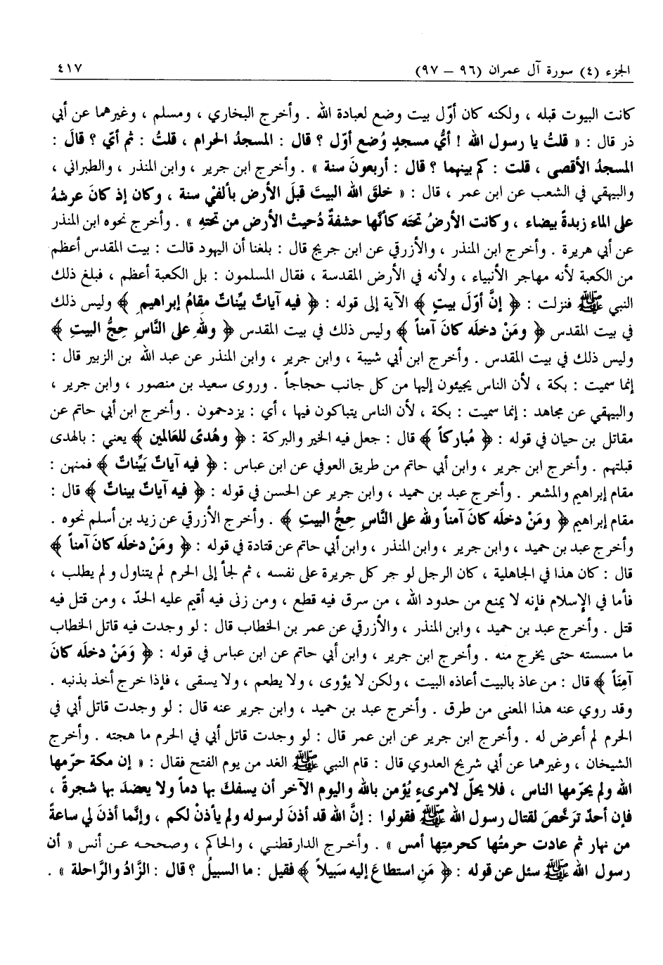 وَقَدْ رُوِيَ عَنْهُ هَذَا الْمَعْنَى مِنْ طُرُقٍ. وَأَخْرَجَ عَبْدُ بْنُ حُمَيْدٍ، وَابْنُ جَرِيرٍ عَنْهُ قَالَ: لَوْ وَجَدْتُ قَاتِلَ أَبِي فِي الْحَرَمِ لَمْ أَعْرِضْ لَهُ. وَأَخْرَجَ ابْنُ جَرِيرٍ عَنِ ابْنِ عُمَرَ قَالَ: لَوْ وَجَدْتُ قَاتِلَ أَبِي فِي الْحَرَمِ مَا هِجْتُهُ. وَأَخْرَجَ الشَّيْخَانِ، وَغَيْرُهُمَا عَنْ أَبِي شُرَيْحٍ الْعَدَوِيِّ قَالَ: قَامَ النبي صلّى الله عليه وَسَلَّمَ الْغَدَ مِنْ يَوْمِ الْفَتْحِ فَقَالَ: «إِنَّ مَكَّةَ حَرَّمَهَا اللَّهُ وَلَمْ يُحَرِّمْهَا النَّاسُ، فَلَا يَحِلُّ لِامْرِئٍ يُؤْمِنُ بِاللَّهِ وَالْيَوْمِ الْآخِرِ أَنْ يَسْفِكَ بِهَا دَمًا وَلَا يُعْضَدَ بِهَا شَجَرَةٌ، فَإِنْ أَحَدٌ تَرَخَّصَ لِقِتَالِ رَسُولِ اللَّهِ صَلَّى الله عليه وَسَلَّمَ فَقُولُوا: إِنَّ اللَّهَ قَدْ أَذِنَ لِرَسُولِهِ وَلَمْ يَأْذَنْ لَكُمْ، وَإِنَّمَا أَذِنَ لِي سَاعَةً من نهار ثم عادت حرمتها كَحُرْمَتِهَا أَمْسِ» . وَأَخْرَجَ الدَّارَقُطْنِيُّ، وَالْحَاكِمُ، وَصَحَّحَهُ عَنْ أَنَسٍ «أَنَّ رَسُولَ اللَّهِ صَلَّى اللَّهُ عَلَيْهِ وَسَلَّمَ سُئِلَ عَنْ قَوْلِهِ: مَنِ اسْتَطاعَ إِلَيْهِ سَبِيلًا فَقِيلَ: مَا السَّبِيلُ؟ قَالَ: الزَّادُ وَالرَّاحِلَةُ» .