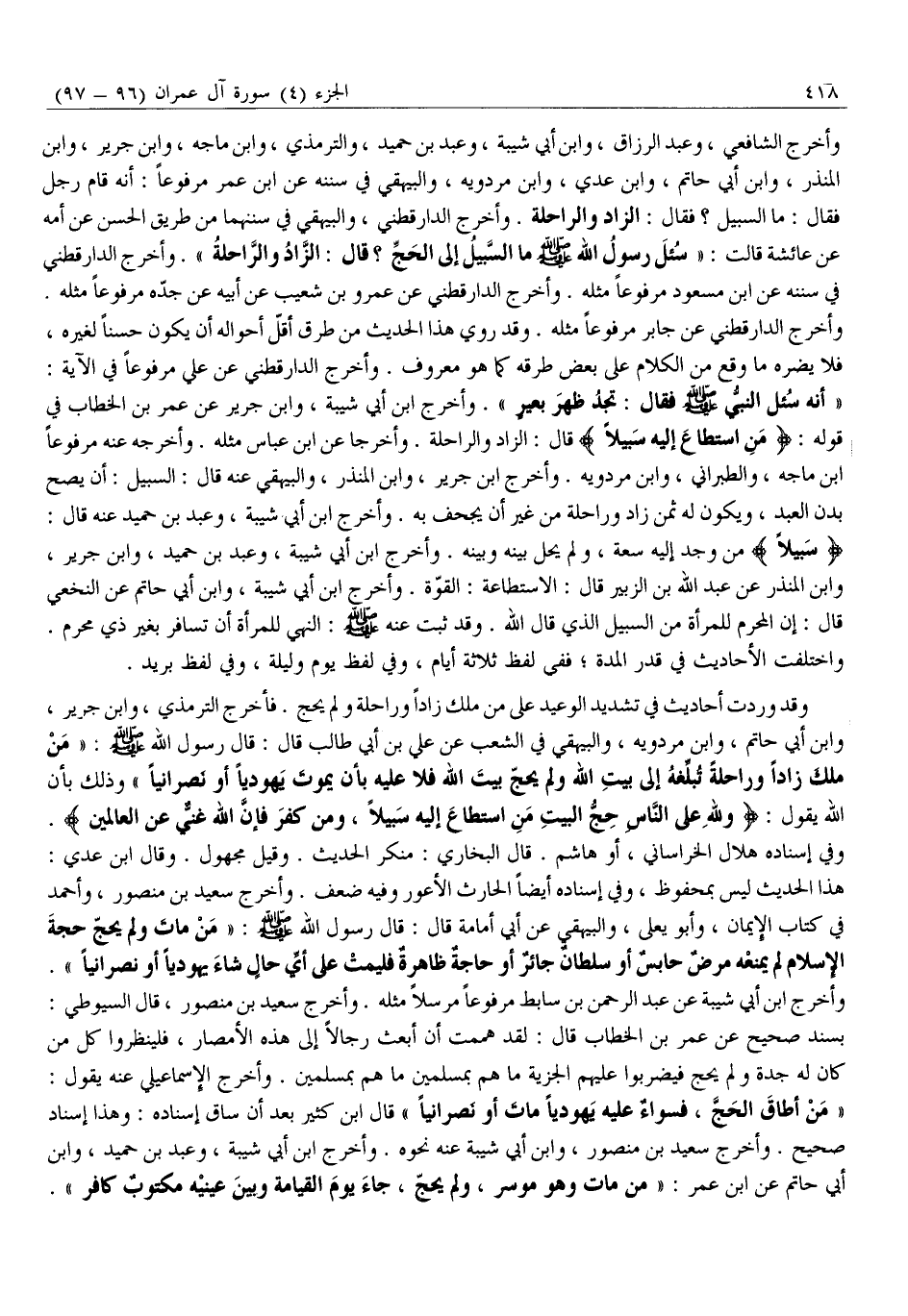 وَأَخْرَجَ الشَّافِعِيُّ، وَعَبْدُ الرَّزَّاقِ، وَابْنُ أَبِي شَيْبَةَ، وَعَبْدُ بْنُ حُمَيْدٍ، وَالتِّرْمِذِيُّ، وَابْنُ مَاجَهْ، وَابْنُ جَرِيرٍ، وَابْنُ الْمُنْذِرِ، وَابْنُ أَبِي حَاتِمٍ، وَابْنُ عَدِيٍّ، وَابْنُ مَرْدَوَيْهِ، وَالْبَيْهَقِيُّ فِي سُنَنِهِ عَنِ ابْنِ عُمَرَ مَرْفُوعًا: أَنَّهُ قَامَ رَجُلٌ فَقَالَ: مَا السَّبِيلُ؟ فَقَالَ: الزَّادُ وَالرَّاحِلَةُ. وَأَخْرَجَ الدَّارَقُطْنِيُّ، وَالْبَيْهَقِيُّ فِي سُنَنِهِمَا مِنْ طَرِيقِ الْحَسَنِ عَنْ أُمِّهِ عَنْ عَائِشَةَ قَالَتْ: «سُئِلَ رَسُولُ اللَّهِ صَلَّى اللَّهُ عَلَيْهِ وَسَلَّمَ مَا السَّبِيلُ إِلَى الْحَجِّ؟ قَالَ: الزَّادُ وَالرَّاحِلَةُ» . وَأَخْرَجَ الدَّارَقُطْنِيُّ فِي سُنَنِهِ عَنِ ابْنِ مَسْعُودٍ مَرْفُوعًا مِثْلَهُ. وَأَخْرَجَ الدَّارَقُطْنِيُّ عَنْ عَمْرِو بْنِ شُعَيْبٍ عَنْ أَبِيهِ عَنْ جَدِّهِ مَرْفُوعًا مِثْلَهُ.