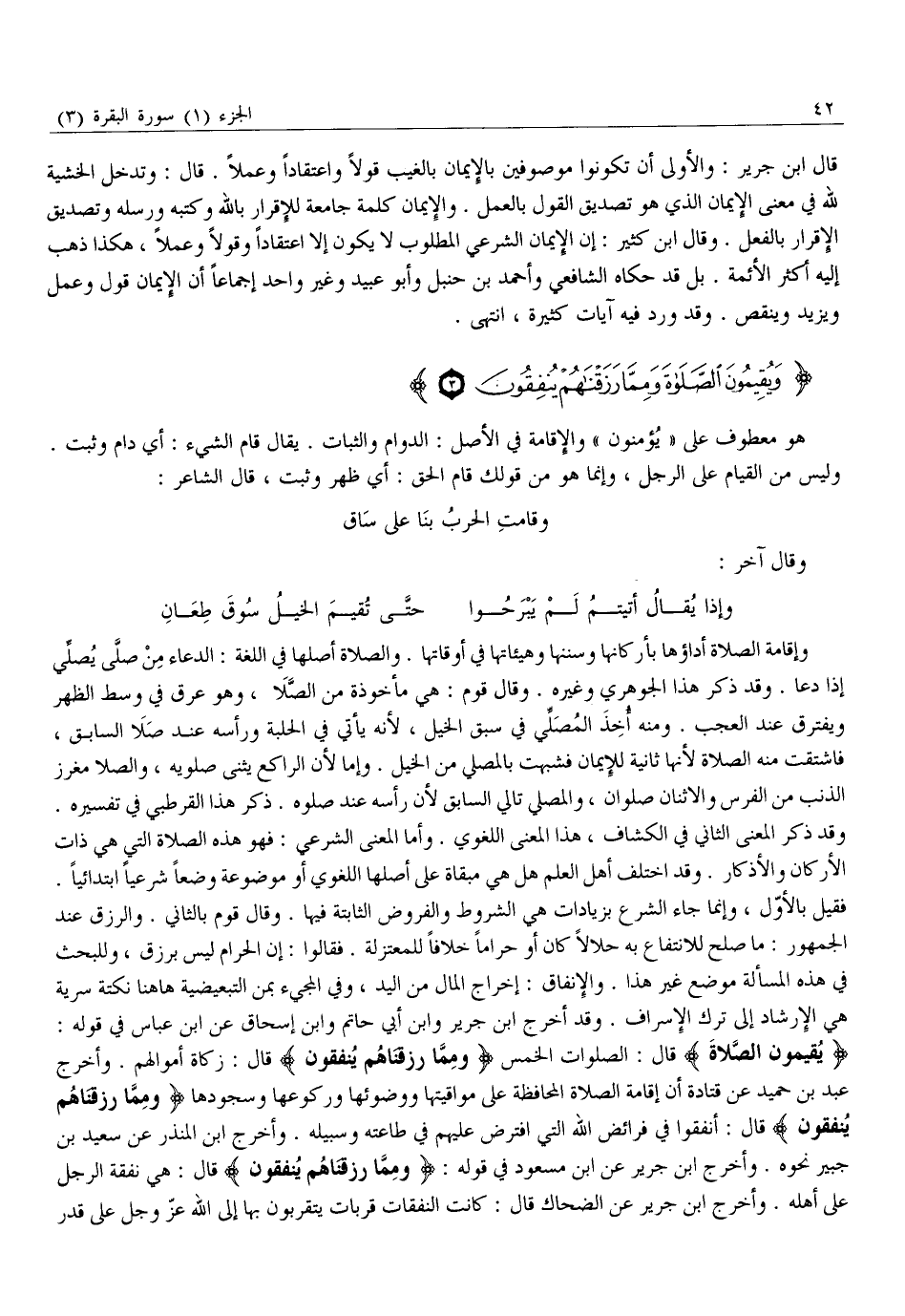 يُقِيمُونَ الصَّلاةَ قَالَ: الصَّلَوَاتُ الْخَمْسُ وَمِمَّا رَزَقْناهُمْ يُنْفِقُونَ قَالَ: زَكَاةُ أَمْوَالِهِمْ. وَأَخْرَجَ عَبْدُ بْنُ حُمَيْدٍ عَنْ قَتَادَةَ أَنَّ إِقَامَةَ الصَّلَاةِ الْمُحَافَظَةُ عَلَى مَوَاقِيتِهَا وَوُضُوئِهَا وَرُكُوعِهَا وَسُجُودِهَا وَمِمَّا رَزَقْناهُمْ يُنْفِقُونَ قَالَ: أَنْفَقُوا فِي فَرَائِضِ اللَّهِ الَّتِي افْتَرَضَ عَلَيْهِمْ فِي طَاعَتِهِ وَسَبِيلِهِ. وَأَخْرَجَ ابْنُ الْمُنْذِرِ عَنْ سَعِيدِ بْنِ جُبَيْرٍ نَحْوَهُ. وَأَخْرَجَ ابْنُ جَرِيرٍ عَنِ ابْنِ مَسْعُودٍ فِي قَوْلِهِ: وَمِمَّا رَزَقْناهُمْ يُنْفِقُونَ قَالَ: هِيَ نَفَقَةُ الرَّجُلِ عَلَى أَهْلِهِ. وَأَخْرَجَ ابْنُ جَرِيرٍ عَنِ الضَّحَّاكِ قَالَ: كَانَتِ النَّفَقَاتُ قُرُبَاتٍ يَتَقَرَّبُونَ بِهَا إِلَى اللَّهِ عَزَّ وَجَلَّ عَلَى قَدْرِ