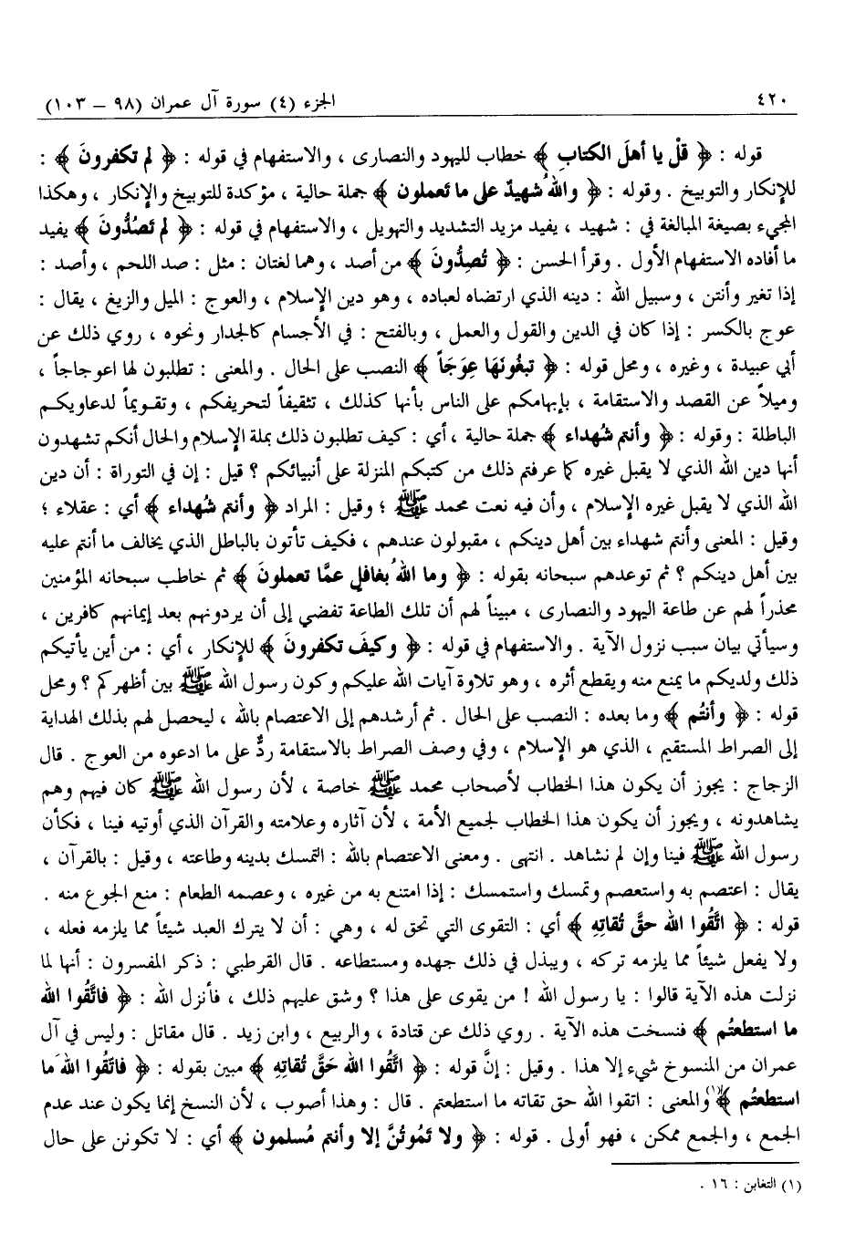 قوله: قُلْ يا أَهْلَ الْكِتابِ خِطَابٌ لِلْيَهُودِ وَالنَّصَارَى، وَالِاسْتِفْهَامُ فِي قَوْلِهِ: لِمَ تَكْفُرُونَ: