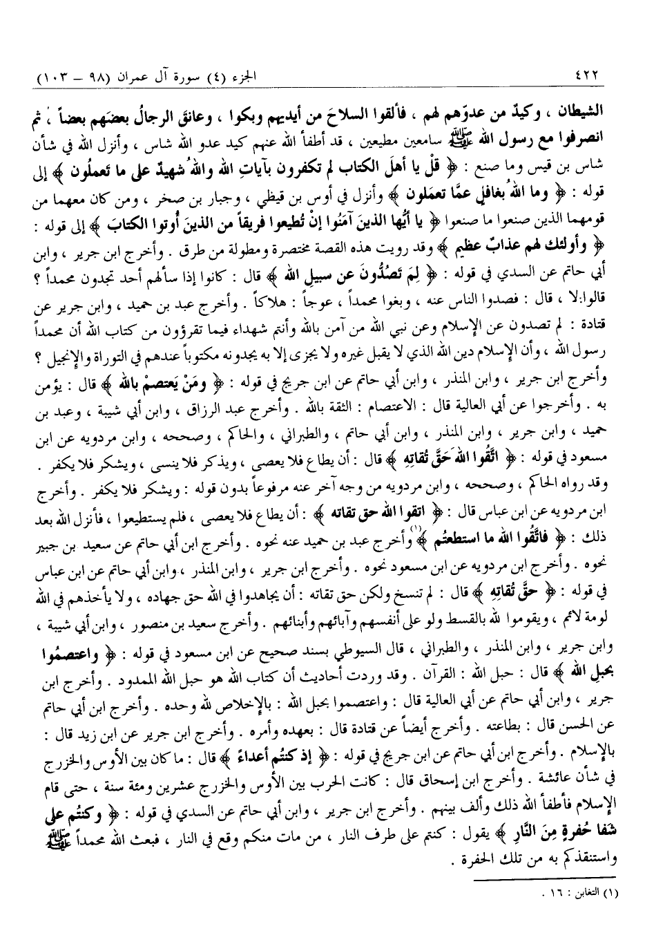 وَأَخْرَجَ ابْنُ جَرِيرٍ، وَابْنُ الْمُنْذِرِ، وَابْنُ أَبِي حَاتِمٍ عَنِ ابْنِ جُرَيْجٍ فِي قَوْلِهِ: وَمَنْ يَعْتَصِمْ بِاللَّهِ قَالَ: يُؤْمِنْ بِهِ. وَأَخْرَجُوا عَنْ أَبِي الْعَالِيَةِ قَالَ: الِاعْتِصَامُ: الثِّقَةُ بِاللَّهِ. وَأَخْرَجَ عَبْدُ الرَّزَّاقِ، وَابْنُ أَبِي شَيْبَةَ، وَعَبْدُ بْنُ حُمَيْدٍ، وَابْنُ جَرِيرٍ، وَابْنُ الْمُنْذِرِ، وَابْنُ أَبِي حَاتِمٍ، وَالطَّبَرَانِيُّ، وَالْحَاكِمُ، وَصَحَّحَهُ، وَابْنُ مَرْدَوَيْهِ عَنِ ابْنِ مَسْعُودٍ فِي قَوْلِهِ: اتَّقُوا اللَّهَ حَقَّ تُقاتِهِ قَالَ: أَنْ يُطَاعَ فَلَا يُعْصَى، وَيُذْكَرَ فَلَا يُنْسَى، وَيُشْكَرَ فَلَا يُكْفَرَ.