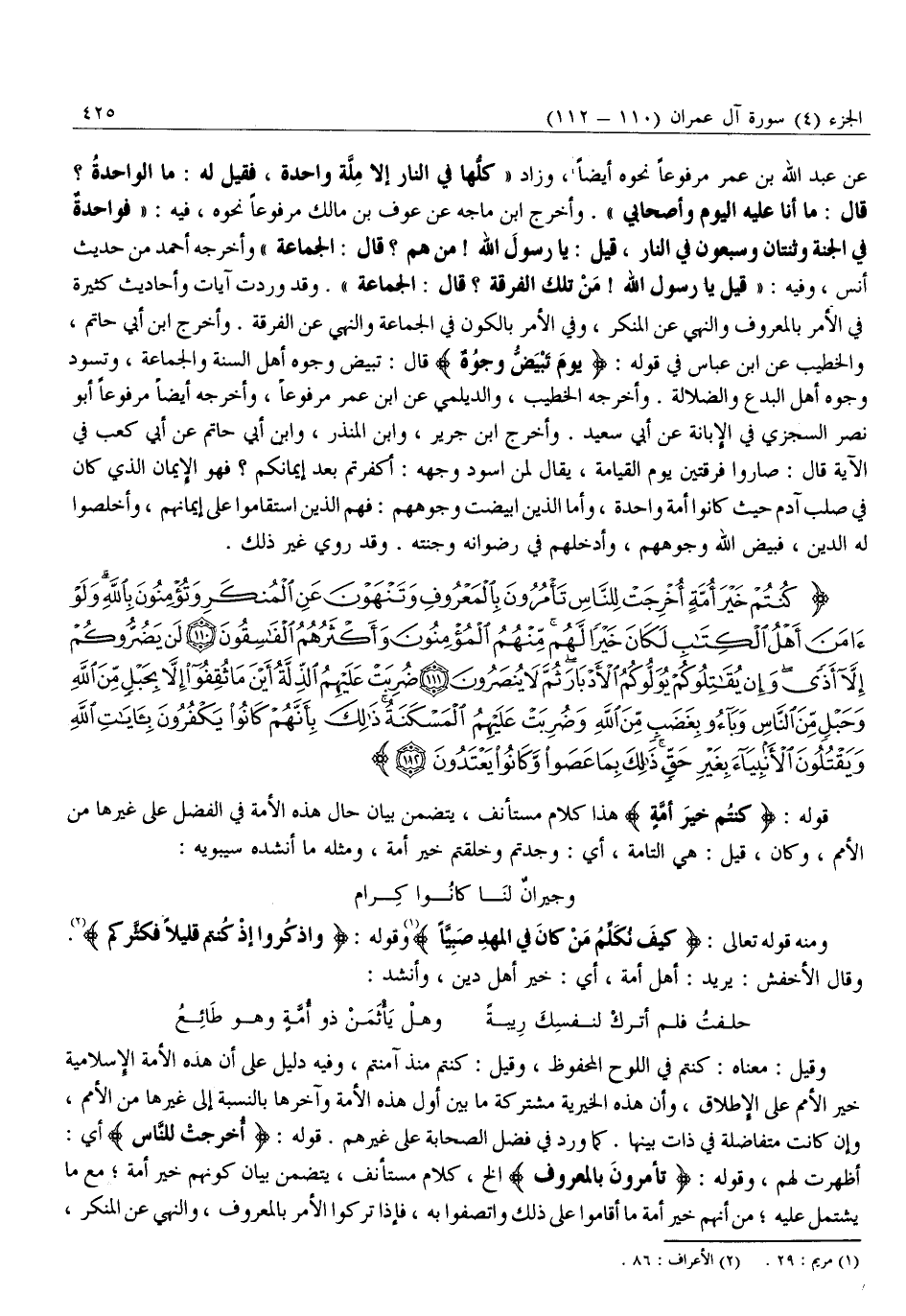 قَالَ: مَا أَنَا عَلَيْهِ الْيَوْمَ وَأَصْحَابِي» . وَأَخْرَجَ ابْنُ مَاجَهْ عَنْ عَوْفِ بْنِ مَالِكٍ مَرْفُوعًا نحوه، فيه: «فَوَاحِدَةٌ فِي الْجَنَّةِ وَثِنْتَانِ وَسَبْعُونَ فِي النَّارِ، قِيلَ: يَا رَسُولَ اللَّهِ! مَنْ هُمْ؟ قَالَ: الْجَمَاعَةُ» وَأَخْرَجَهُ أَحْمَدُ مِنْ حَدِيثِ أَنَسٍ، وَفِيهِ: «قِيلَ يَا رَسُولَ اللَّهِ! مَنْ تِلْكَ الْفِرْقَةُ؟ قَالَ: الْجَمَاعَةُ» . وَقَدْ وَرَدَتْ آيَاتٌ وَأَحَادِيثُ كَثِيرَةٌ فِي الْأَمْرِ بِالْمَعْرُوفِ وَالنَّهْيِ عَنِ الْمُنْكَرِ، وَفِي الْأَمْرِ بِالْكَوْنِ فِي الْجَمَاعَةِ وَالنَّهْيِ عَنِ الْفُرْقَةِ. وَأَخْرَجَ ابْنُ أَبِي حَاتِمٍ، وَالْخَطِيبُ عَنِ ابْنِ عَبَّاسٍ فِي قَوْلِهِ: يَوْمَ تَبْيَضُّ وُجُوهٌ قَالَ: تَبْيَضُّ وُجُوهُ أَهْلِ السُّنَّةِ وَالْجَمَاعَةِ، وَتَسْوَدُّ وُجُوهُ أَهْلِ الْبِدَعِ وَالضَّلَالَةِ. وَأَخْرَجَهُ الْخَطِيبُ، وَالدَّيْلَمِيُّ عَنِ ابْنِ عُمَرَ مَرْفُوعًا، وَأَخْرَجَهُ أَيْضًا مَرْفُوعًا أَبُو نَصْرٍ السِّجْزِيُّ فِي الْإِبَانَةِ عَنْ أَبِي سَعِيدٍ. وَأَخْرَجَ ابْنُ جَرِيرٍ، وَابْنُ الْمُنْذِرِ، وَابْنُ أَبِي حاتم عن أبي كَعْبٍ فِي الْآيَةِ قَالَ: صَارُوا فِرْقَتَيْنِ يَوْمَ الْقِيَامَةِ، يُقَالُ لِمَنِ اسْوَدَّ وَجْهُهُ: أَكَفَرْتُمْ بَعْدَ إِيمَانِكُمْ؟ فَهُوَ الْإِيمَانُ الَّذِي كَانَ فِي صُلْبِ آدَمَ حَيْثُ كَانُوا أُمَّةً وَاحِدَةً، وَأَمَّا الَّذِينَ ابْيَضَّتْ وُجُوهُهُمْ: فَهُمُ الَّذِينَ اسْتَقَامُوا عَلَى إِيمَانِهِمْ، وَأَخْلَصُوا لَهُ الدِّينَ، فَبَيَّضَ اللَّهُ وُجُوهَهُمْ، وَأَدْخَلَهُمْ فِي رِضْوَانِهِ وَجَنَّتَهُ. وَقَدْ رُوِيَ غَيْرُ ذَلِكَ.