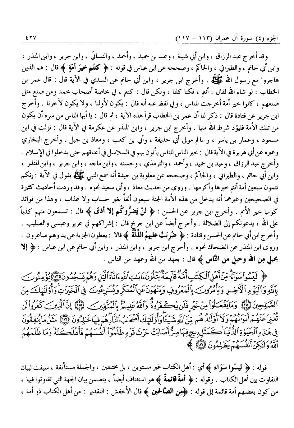 لَيْسُوا سَواءً مِنْ أَهْلِ الْكِتابِ أُمَّةٌ قائِمَةٌ يَتْلُونَ آياتِ اللَّهِ آناءَ اللَّيْلِ وَهُمْ يَسْجُدُونَ (113) يُؤْمِنُونَ بِاللَّهِ وَالْيَوْمِ الْآخِرِ وَيَأْمُرُونَ بِالْمَعْرُوفِ وَيَنْهَوْنَ عَنِ الْمُنْكَرِ وَيُسارِعُونَ فِي الْخَيْراتِ وَأُولئِكَ مِنَ الصَّالِحِينَ (114) وَما يَفْعَلُوا مِنْ خَيْرٍ فَلَنْ يُكْفَرُوهُ وَاللَّهُ عَلِيمٌ بِالْمُتَّقِينَ (115) إِنَّ الَّذِينَ كَفَرُوا لَنْ تُغْنِيَ عَنْهُمْ أَمْوالُهُمْ وَلا أَوْلادُهُمْ مِنَ اللَّهِ شَيْئاً وَأُولئِكَ أَصْحابُ النَّارِ هُمْ فِيها خالِدُونَ (116) مَثَلُ مَا يُنْفِقُونَ فِي هذِهِ الْحَياةِ الدُّنْيا كَمَثَلِ رِيحٍ فِيها صِرٌّ أَصابَتْ حَرْثَ قَوْمٍ ظَلَمُوا أَنْفُسَهُمْ فَأَهْلَكَتْهُ وَما ظَلَمَهُمُ اللَّهُ وَلكِنْ أَنْفُسَهُمْ يَظْلِمُونَ (117)