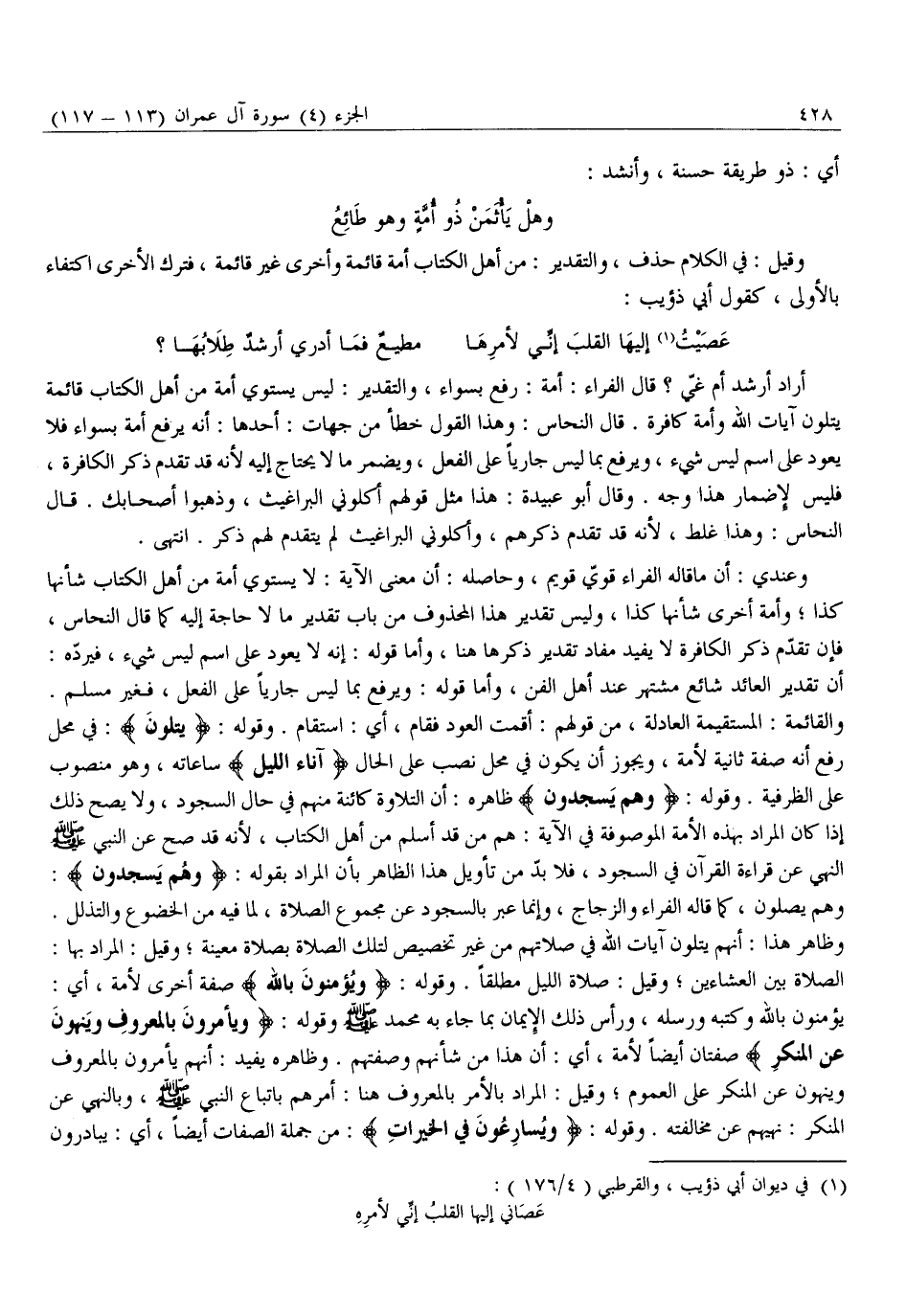 وَهَلْ يَأْثَمَنْ ذُو أُمَّةٍ وَهُوَ طَائِعُ وَقِيلَ: فِي الْكَلَامِ حَذْفٌ، وَالتَّقْدِيرُ: مِنْ أَهْلِ الْكِتَابِ أُمَّةٌ قَائِمَةٌ وَأُخْرَى غَيْرُ قَائِمَةٍ، فَتَرَكَ الْأُخْرَى اكْتِفَاءً بِالْأُولَى، كَقَوْلِ أَبِي ذُؤَيْبٍ: