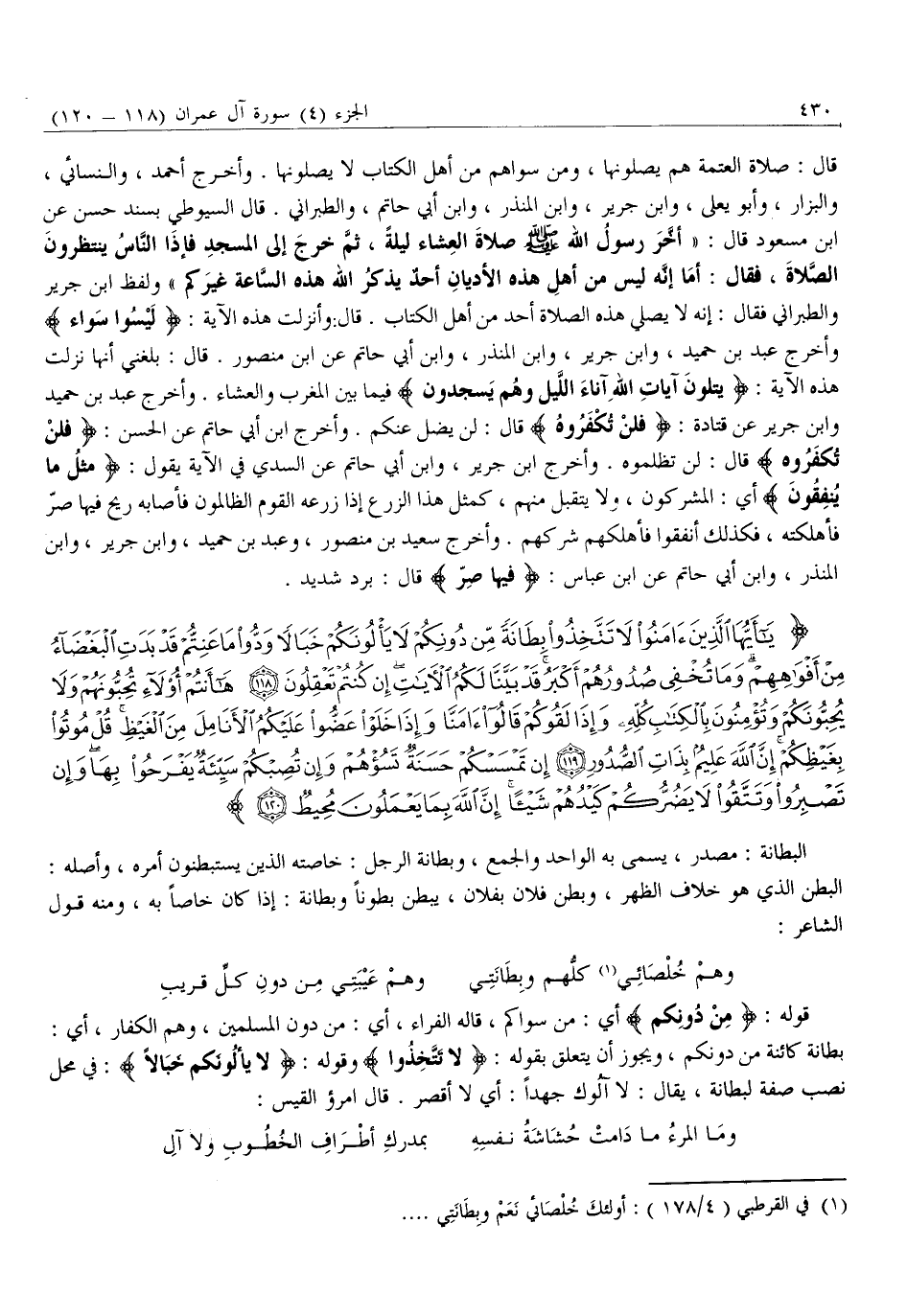 قَالَ: صَلَاةُ الْعَتَمَةِ هُمْ يُصَلُّونَهَا، وَمَنْ سِوَاهُمْ مِنْ أَهْلِ الْكِتَابِ لَا يُصَلُّونَهَا. وَأَخْرَجَ أَحْمَدُ، وَالنَّسَائِيُّ، وَالْبَزَّارُ، وَأَبُو يَعْلَى، وَابْنُ جَرِيرٍ، وَابْنُ الْمُنْذِرِ، وَابْنُ أَبِي حَاتِمٍ، وَالطَّبَرَانِيُّ. قَالَ السُّيُوطِيُّ بِسَنَدٍ حَسَنٍ عَنِ ابْنِ مَسْعُودٍ قَالَ: «أَخَّرَ رَسُولُ اللَّهِ صَلَّى اللَّهُ عَلَيْهِ وَسَلَّمَ صَلَاةَ الْعِشَاءِ لَيْلَةً، ثُمَّ خَرَجَ إِلَى الْمَسْجِدِ فَإِذَا النَّاسُ يَنْتَظِرُونَ الصَّلَاةَ، فَقَالَ: أَمَا إِنَّهُ لَيْسَ مِنْ أَهْلِ هَذِهِ الْأَدْيَانِ أَحَدٌ يَذْكُرُ اللَّهَ هَذِهِ السَّاعَةَ غَيْرُكُمْ» وَلَفْظُ ابْنِ جَرِيرٍ وَالطَّبَرَانِيُّ فَقَالَ: إِنَّهُ لَا يُصَلِّي هَذِهِ الصَّلَاةَ أَحَدٌ مِنْ أَهْلِ الْكِتَابِ. قَالَ: وَأُنْزِلَتْ هَذِهِ الْآيَةُ: لَيْسُوا سَواءً وَأَخْرَجَ عَبْدُ بْنُ حُمَيْدٍ، وَابْنُ جَرِيرٍ، وَابْنُ المنذر، وابن أبي حَاتِمٍ عَنِ ابْنِ مَنْصُورٍ. قَالَ: بَلَغَنِي أَنَّهَا نَزَلَتْ هَذِهِ الْآيَةُ: يَتْلُونَ آياتِ اللَّهِ آناءَ اللَّيْلِ وَهُمْ يَسْجُدُونَ فِيمَا بَيْنَ الْمَغْرِبِ وَالْعِشَاءِ. وَأَخْرَجَ عَبْدُ بْنُ حُمَيْدٍ وَابْنُ جَرِيرٍ عَنْ قَتَادَةَ: فَلَنْ يُكْفَرُوهُ قَالَ: لَنْ يَضِلَّ عَنْكُمْ. وَأَخْرَجَ ابْنُ أَبِي حَاتِمٍ عَنِ الْحَسَنِ: فَلَنْ يُكْفَرُوهُ قَالَ: لَنْ تَظْلِمُوهُ. وَأَخْرَجَ ابْنُ جَرِيرٍ، وَابْنُ أَبِي حَاتِمٍ عَنِ السُّدِّيِّ فِي الْآيَةِ يقول: ثَلُ مَا يُنْفِقُونَ
