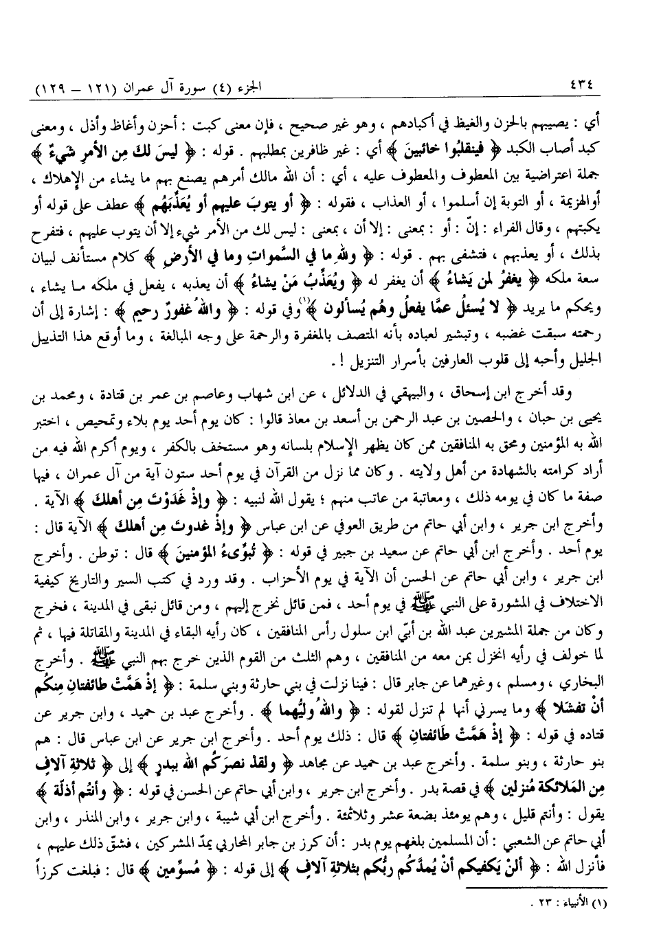 يَوْمَ أُحُدٍ. وَأَخْرَجَ ابْنُ أَبِي حَاتِمٍ عَنْ سَعِيدِ بْنِ جُبَيْرٍ فِي قَوْلِهِ: تُبَوِّئُ الْمُؤْمِنِينَ قَالَ: تُوَطِّنُ. وَأَخْرَجَ ابْنُ جَرِيرٍ، وَابْنُ أَبِي حَاتِمٍ عَنِ الْحَسَنِ أَنَّ الْآيَةَ فِي يَوْمِ الْأَحْزَابِ. وَقَدْ وَرَدَ فِي كُتُبِ السِّيَرِ وَالتَّارِيخِ كَيْفِيَّةُ الِاخْتِلَافِ فِي الْمَشُورَةِ عَلَى النَّبِيِّ صَلَّى اللَّهُ عَلَيْهِ وَسَلَّمَ فِي يَوْمِ أُحُدٍ، فَمِنْ قَائِلٍ نَخْرُجُ إِلَيْهِمْ، وَمِنْ قَائِلٍ نَبْقَى فِي الْمَدِينَةِ، فَخَرَجَ وَكَانَ مِنْ جُمْلَةِ الْمُشِيرِينَ عَبْدُ اللَّهِ بْنُ أُبَيٍّ ابْنُ سَلُولَ رَأْسُ الْمُنَافِقِينَ، كَانَ رَأْيُهُ الْبَقَاءَ فِي الْمَدِينَةِ وَالْمُقَاتَلَةَ فِيهَا، ثُمَّ لَمَّا خُولِفَ فِي رَأْيِهِ انْخَزَلَ بِمَنْ مَعَهُ مِنَ المنافقين، وهم الثُّلُثِ مِنَ الْقَوْمِ الَّذِينَ خَرَجَ بِهِمُ النَّبِيُّ صلّى الله عليه وَسَلَّمَ. وَأَخْرَجَ الْبُخَارِيُّ، وَمُسْلِمٌ، وَغَيْرُهُمَا عَنْ جَابِرٍ قَالَ: فِينَا نَزَلَتْ فِي بَنِي حَارِثَةَ وَبَنِي سَلَمَةَ: إِذْ هَمَّتْ طائِفَتانِ مِنْكُمْ أَنْ تَفْشَلا وَمَا يَسُرُّنِي أَنَّهَا لَمْ تَنْزِلْ لِقَوْلِهِ: وَاللَّهُ وَلِيُّهُما. وَأَخْرَجَ عَبْدُ بْنُ حُمَيْدٍ، وَابْنُ جَرِيرٍ عَنْ قَتَادَةَ فِي قَوْلِهِ: إِذْ هَمَّتْ طائِفَتانِ قَالَ: ذَلِكَ يَوْمُ أُحُدٍ. وَأَخْرَجَ ابْنُ جَرِيرٍ عَنِ ابْنِ عَبَّاسٍ قَالَ: هُمْ بَنُو حَارِثَةَ، وَبَنُو سَلَمَةَ. وَأَخْرَجَ عَبْدُ بْنُ حُمَيْدٍ عَنْ مجاهد وَلَقَدْ نَصَرَكُمُ اللَّهُ بِبَدْرٍ إلى بِثَلاثَةِ آلافٍ مِنَ الْمَلائِكَةِ مُنْزَلِينَ فِي قِصَّةِ بَدْرٍ. وَأَخْرَجَ ابْنُ جَرِيرٍ، وَابْنُ أَبِي حَاتِمٍ عَنِ الْحَسَنِ فِي قَوْلِهِ: وَأَنْتُمْ أَذِلَّةٌ يَقُولُ: وَأَنْتُمْ قَلِيلٌ، وَهُمْ يَوْمَئِذٍ بِضْعَةَ عَشَرَ وَثَلَاثُمِائَةٍ. وَأَخْرَجَ ابْنُ أَبِي شَيْبَةَ، وَابْنُ جَرِيرٍ، وَابْنُ الْمُنْذِرِ، وَابْنُ أَبِي حَاتِمٍ عَنِ الشَّعْبِيِّ: أَنَّ الْمُسْلِمِينَ بَلَغَهُمْ يَوْمَ بَدْرٍ: أَنَّ كُرْزَ بْنَ جَابِرٍ الْمُحَارِبِيَّ يَمُدُّ الْمُشْرِكِينَ، فَشَقَّ ذَلِكَ عَلَيْهِمْ، فَأَنْزَلَ اللَّهُ: أَلَنْ يَكْفِيَكُمْ أَنْ يُمِدَّكُمْ رَبُّكُمْ بِثَلاثَةِ آلافٍ إِلَى قَوْلِهِ: مُسَوِّمِينَ قَالَ: فَبَلَغَتْ كُرْزًا