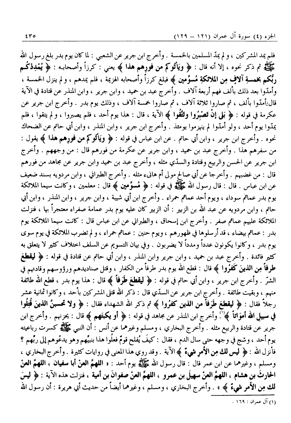 مِنْ سَفَرِهِمْ هَذَا. وَأَخْرَجَ عَبْدُ بْنُ حُمَيْدٍ، وَابْنُ جَرِيرٍ عَنْ عِكْرِمَةَ مِنْ فَوْرِهِمْ قَالَ: مِنْ وَجْهِهِمْ. وَأَخْرَجَ ابْنُ جَرِيرٍ عَنِ الْحَسَنِ وَالرَّبِيعِ وَقَتَادَةَ وَالسُّدِّيِّ مِثْلَهُ، وَأَخْرَجَ عَبْدُ بْنُ حُمَيْدٍ وَابْنُ جَرِيرٍ عَنْ مُجَاهِدٍ مِنْ فَوْرِهِمْ قَالَ: مِنْ غَضَبِهِمْ. وَأَخْرَجَا عَنْ أَبِي صَالِحٍ مَوْلَى أُمِّ هَانِئٍ مِثْلَهُ. وَأَخْرَجَ الطَّبَرَانِيُّ، وَابْنُ مَرْدَوَيْهِ بِسَنَدٍ ضَعِيفٍ عَنِ ابْنِ عَبَّاسٍ. قَالَ: قَالَ رَسُولُ اللَّهِ صَلَّى اللَّهُ عَلَيْهِ وَسَلَّمَ فِي قَوْلِهِ: مُسَوِّمِينَ قَالَ: مُعَلِّمِينَ، وَكَانَتْ سِيمَا الْمَلَائِكَةِ يَوْمَ بَدْرٍ عَمَائِمَ سَوْدَاءَ، وَيَوْمَ أُحُدٍ عَمَائِمَ حَمْرَاءَ. وَأَخْرَجَ ابْنُ أَبِي شَيْبَةَ، وَابْنُ جَرِيرٍ، وَابْنُ الْمُنْذِرِ، وَابْنُ أَبِي حَاتِمٍ، وَابْنُ مَرْدَوَيْهِ عَنْ عَبْدِ اللَّهِ بْنِ الزُّبَيْرِ: أَنَّ الزُّبَيْرَ كَانَ عَلَيْهِ يَوْمَ بَدْرٍ عِمَامَةٌ صَفْرَاءُ مُعْتَجِرًا بِهَا، فَنَزَلَتِ الْمَلَائِكَةُ عَلَيْهِمْ عَمَائِمُ صُفْرٌ. وَأَخْرَجَ ابْنُ إِسْحَاقَ، وَالطَّبَرَانِيُّ عَنِ ابْنِ عَبَّاسٍ قَالَ: كَانَتْ سِيمَا الْمَلَائِكَةِ يَوْمَ بَدْرٍ: عَمَائِمَ بَيْضَاءَ، قَدْ أَرْسَلُوهَا فِي ظُهُورِهِمْ، وَيَوْمَ حُنَيْنٍ: عَمَائِمَ حَمْرَاءَ، وَلَمْ تَضْرِبِ الْمَلَائِكَةُ فِي يَوْمٍ سِوَى يَوْمِ بَدْرٍ، وَكَانُوا يُكَوِّنُونَ عَدَدًا وَمَدَدًا لَا يَضْرِبُونَ. وَفِي بَيَانِ التَّسْوِيمِ عَنِ السَّلَفِ اخْتِلَافٌ كَثِيرٌ لَا يَتَعَلَّقُ بِهِ كَثِيرُ فَائِدَةٍ. وَأَخْرَجَ عَبْدُ بْنُ حُمَيْدٍ، وَابْنُ جَرِيرٍ وَابْنُ الْمُنْذِرِ، وَابْنُ أَبِي حَاتِمٍ عَنْ قَتَادَةَ فِي قَوْلِهِ: لِيَقْطَعَ طَرَفاً مِنَ الَّذِينَ كَفَرُوا قَالَ: قَطَعَ اللَّهُ يَوْمَ بَدْرٍ طَرَفًا مِنَ الْكُفَّارِ، وقتل صناديدهم ورؤوسهم وَقَادَتَهُمْ فِي الشَّرِّ. وَأَخْرَجَ ابْنُ جَرِيرٍ، وَابْنُ أَبِي حَاتِمٍ فِي قَوْلِهِ: لِيَقْطَعَ طَرَفاً قَالَ: هَذَا يَوْمُ بَدْرٍ، قَطَعَ اللَّهُ طَائِفَةً مِنْهُمْ، وَبَقِيَتْ طَائِفَةٌ. وَأَخْرَجَ ابْنُ جَرِيرٍ عَنِ السُّدِّيِّ قَالَ: ذَكَرَ اللَّهُ قَتْلَى الْمُشْرِكِينَ بِأُحُدٍ، وَكَانُوا ثَمَانِيَةَ عَشَرَ رَجُلًا فَقَالَ: لِيَقْطَعَ طَرَفاً مِنَ الَّذِينَ كَفَرُوا ثُمَّ ذَكَرَ اللَّهُ الشُّهَدَاءَ فَقَالَ: وَلا تَحْسَبَنَّ الَّذِينَ قُتِلُوا فِي سَبِيلِ اللَّهِ أَمْواتاً «1» . وَأَخْرَجَ ابْنُ الْمُنْذِرِ عَنْ مُجَاهِدٍ فِي قَوْلِهِ: أَوْ يَكْبِتَهُمْ قَالَ: يُحْزِنَهُمْ. وَأَخْرَجَ ابْنُ جَرِيرٍ عَنْ قَتَادَةَ وَالرَّبِيعِ مِثْلَهُ. وَأَخْرَجَ الْبُخَارِيُّ، وَمُسْلِمٌ وَغَيْرُهُمَا عَنْ أَنَسٍ: أَنَّ النَّبِيَّ صَلَّى اللَّهُ عَلَيْهِ وَسَلَّمَ كُسِرَتْ رَبَاعِيَّتُهُ يَوْمَ أُحُدٍ، وَشُجَّ فِي وَجْهِهِ حَتَّى سَالَ الدَّمُ، فَقَالَ: كَيْفَ يُفْلِحُ قَوْمٌ فَعَلُوا هَذَا بِنَبِيِّهِمْ وَهُوَ يَدْعُوهُمْ إِلَى رَبِّهِمْ؟