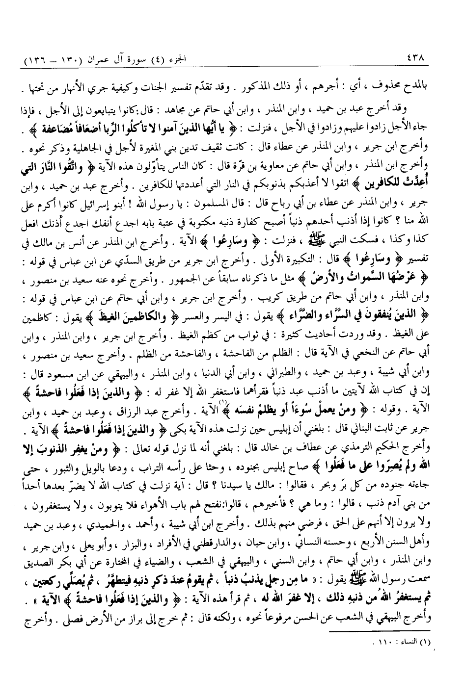 «1» الْآيَةَ. وَأَخْرَجَ عَبْدُ الرَّزَّاقِ، وَعَبْدُ بْنُ حُمَيْدٍ، وَابْنُ جَرِيرٍ عَنْ ثَابِتٍ الْبُنَانِيِّ قَالَ: بَلَغَنِي أَنَّ إِبْلِيسَ حِينَ نَزَلَتْ هَذِهِ الْآيَةُ بَكَى وَالَّذِينَ إِذا فَعَلُوا فاحِشَةً الْآيَةَ.