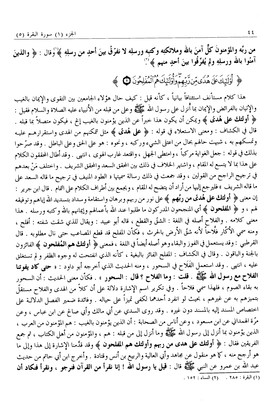 إِنَّ مَعْنَى أُولئِكَ عَلى هُدىً مِنْ رَبِّهِمْ عَلَى نُورٍ مِنْ رَبِّهِمْ وَبُرْهَانٍ وَاسْتِقَامَةٍ وَسَدَادٍ بِتَسْدِيدِ اللَّهِ إِيَّاهُمْ وَتَوْفِيقِهِ لَهُمْ، والْمُفْلِحُونَ أي المنجحون المدركون مَا طَلَبُوا عِنْدَ اللَّهِ بِأَعْمَالِهِمْ وَإِيمَانِهِمْ بِاللَّهِ وَكُتُبِهِ وَرُسُلِهِ. هَذَا مَعْنَى كَلَامِهِ. وَالْفَلَاحُ أَصْلُهُ فِي اللُّغَةِ: الشَّقُّ وَالْقَطْعُ، قَالَهُ أَبُو عُبَيْدٍ: ويقال للذي شُقَّتْ شَفَتُهُ: أَفْلَحُ، وَمِنْهُ سُمِّيَ الْأَكَّارُ فَلَّاحًا لِأَنَّهُ شَقَّ الْأَرْضَ بِالْحَرْثِ، فَكَأَنَّ الْمُفْلِحَ قَدْ قَطَعَ الْمَصَاعِبَ حَتَّى نَالَ مَطْلُوبَهُ. قَالَ الْقُرْطُبِيُّ: وَقَدْ يُسْتَعْمَلُ فِي الْفَوْزِ وَالْبَقَاءِ وَهُوَ أَصْلُهُ أَيْضًا فِي اللُّغَةِ، فَمَعْنَى أُولئِكَ هُمُ الْمُفْلِحُونَ الْفَائِزُونَ بِالْجَنَّةِ وَالْبَاقُونَ. وَقَالَ فِي الْكَشَّافِ: الْمُفْلِحُ الْفَائِزُ بِالْبُغْيَةِ، كَأَنَّهُ الَّذِي انْفَتَحَتْ لَهُ وُجُوهُ الظَّفَرِ وَلَمْ تَسْتَغْلِقْ عَلَيْهِ، انْتَهَى. وَقَدِ اسْتُعْمِلَ الْفَلَاحُ فِي السُّحُورِ، وَمِنْهُ الْحَدِيثُ الَّذِي أَخْرَجَهُ أَبُو دَاوُدَ: «حَتَّى كَادَ يَفُوتُنَا الْفَلَاحُ مَعَ رَسُولِ اللَّهِ صَلَّى اللَّهُ عَلَيْهِ وَسَلَّمَ. قُلْتُ: وَمَا الْفَلَاحُ؟ قَالَ: السُّحُورُ» . فَكَأَنَّ مَعْنَى الْحَدِيثِ: أَنَّ السُّحُورَ بِهِ بَقَاءُ الصَّوْمِ، فَلِهَذَا سُمِّيَ فَلَاحًا. وَفِي تَكْرِيرِ اسْمِ الْإِشَارَةِ دَلَالَةٌ عَلَى أَنَّ كُلًّا مِنَ الْهُدَى وَالْفَلَاحِ مُسْتَقِلٌّ بِتَمَيُّزِهِمْ بِهِ عَنْ غَيْرِهِمْ، بِحَيْثُ لَوِ انْفَرَدَ أَحَدُهُمَا لَكَفَى تَمَيُّزًا عَلَى حِيَالِهِ. وَفَائِدَةُ ضَمِيرِ الْفَصْلِ الدَّلَالَةُ عَلَى اخْتِصَاصُ الْمُسْنَدُ إِلَيْهِ بِالْمُسْنَدِ دُونَ غَيْرِهِ. وَقَدْ رَوَى السُّدِّيُّ عَنْ أَبِي مَالِكٍ وَأَبِي صَالِحٍ عَنِ ابْنِ عَبَّاسٍ، وَعَنْ مُرَّةَ الْهَمْدَانِيِّ عَنِ ابْنِ مَسْعُودٍ، وَعَنْ أُنَاسٍ مِنَ الصَّحَابَةِ: أَنَّ الَّذِينَ يُؤْمِنُونَ بِالْغَيْبِ: هُمُ الْمُؤْمِنُونَ مِنَ الْعَرَبِ، الَّذِينَ يُؤْمِنُونَ بِمَا أُنْزِلَ إِلَى رَسُولِ اللَّهِ صَلَّى اللَّهُ عَلَيْهِ وَسَلَّمَ وَمَا أُنْزِلَ إِلَى مَنْ قَبْلَهُ: هُمْ، وَالْمُؤْمِنُونَ مِنْ أَهْلِ الْكِتَابِ، ثُمَّ جَمَعَ الْفَرِيقَيْنِ فَقَالَ: أُولئِكَ عَلى هُدىً مِنْ رَبِّهِمْ وَأُولئِكَ هُمُ الْمُفْلِحُونَ وَقَدْ قَدَّمْنَا الْإِشَارَةَ إِلَى هَذَا وَإِلَى مَا هُوَ أَرْجَحُ مِنْهُ، كَمَا هُوَ مَنْقُولٌ عَنْ مُجَاهِدٍ وَأَبِي الْعَالِيَةِ وَالرَّبِيعِ بْنِ أَنَسٍ وَقَتَادَةَ. وَأَخْرَجَ ابْنُ أَبِي حَاتِمٍ مِنْ حَدِيثِ عَبْدِ اللَّهِ بْنِ عَمْرٍو عَنِ النَّبِيِّ صَلَّى اللَّهُ عَلَيْهِ وَسَلَّمَ قَالَ: قِيلَ يَا رَسُولَ اللَّهِ! إِنَّا نَقْرَأُ مِنَ الْقُرْآنِ فَنَرْجُو، وَنَقْرَأُ فَنَكَادُ أَنْ