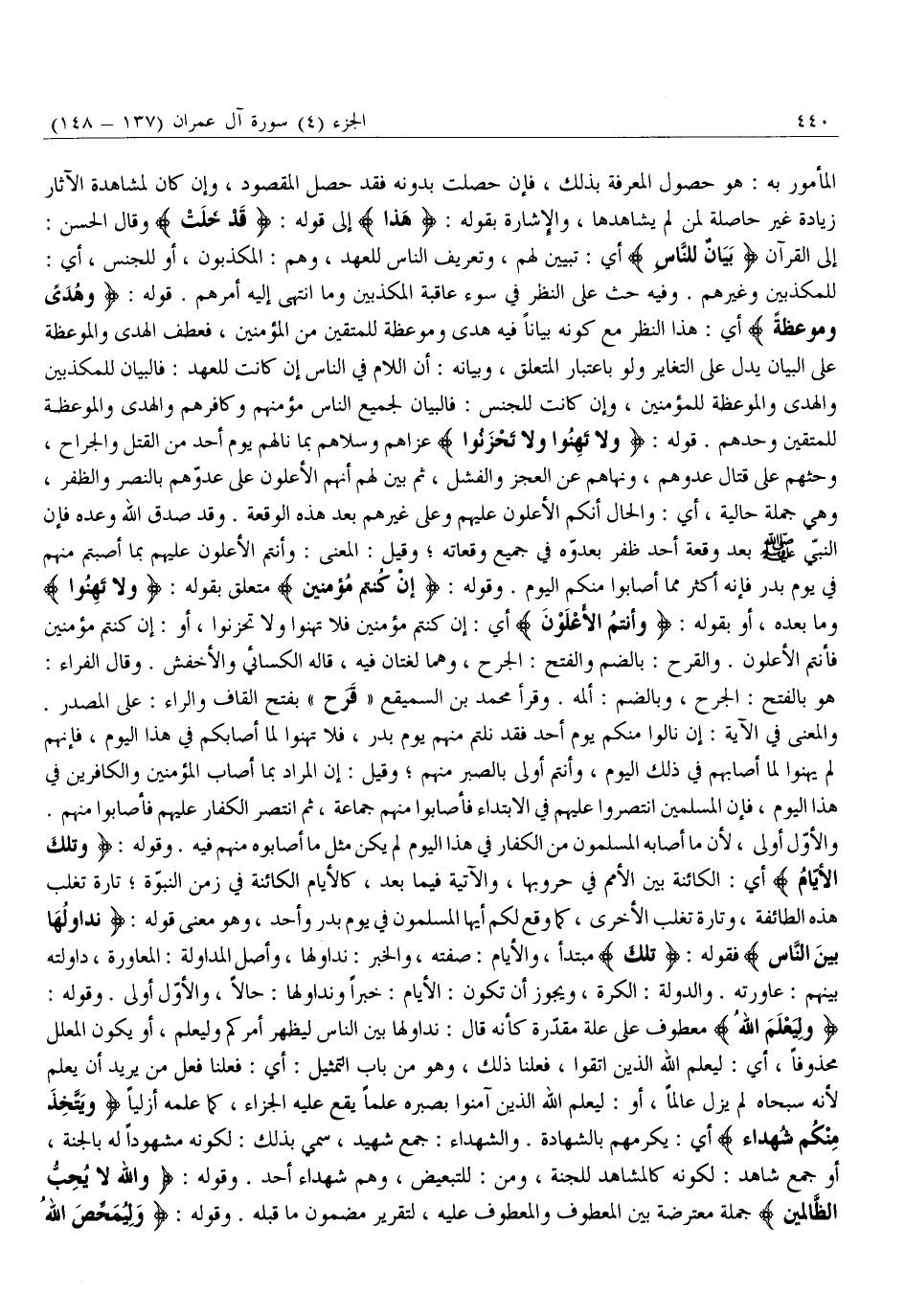 لِلْمُكَذِّبِينَ وَغَيْرِهِمْ. وَفِيهِ حَثٌّ عَلَى النَّظَرِ فِي سُوءِ عَاقِبَةِ الْمُكَذِّبِينَ وَمَا انْتَهَى إِلَيْهِ أَمْرُهُمْ. قَوْلُهُ: وَهُدىً وَمَوْعِظَةٌ أَيْ: هَذَا النَّظَرُ مَعَ كَوْنِهِ بَيَانًا فِيهِ هُدًى وَمَوْعِظَةٌ لِلْمُتَّقِينَ مِنَ الْمُؤْمِنِينَ، فَعَطْفُ الْهُدَى وَالْمَوْعِظَةِ عَلَى الْبَيَانِ يَدُلُّ عَلَى التَّغَايُرِ وَلَوْ بِاعْتِبَارِ الْمُتَعَلِّقِ، وَبَيَانُهُ: أَنَّ اللَّامَ فِي النَّاسِ إِنْ كَانَتْ لِلْعَهْدِ: فَالْبَيَانُ لِلْمُكَذِّبِينَ وَالْهُدَى وَالْمَوْعِظَةُ لِلْمُؤْمِنِينَ، وَإِنْ كَانَتْ لِلْجِنْسِ: فَالْبَيَانُ لِجَمِيعِ النَّاسِ مُؤْمِنِهِمْ وَكَافِرِهِمْ وَالْهُدَى وَالْمَوْعِظَةُ لِلْمُتَّقِينَ وَحْدَهُمْ. قَوْلُهُ: وَلا تَهِنُوا وَلا تَحْزَنُوا عَزَّاهُمْ وَسَلَّاهُمْ بِمَا نَالَهُمْ يَوْمَ أُحُدٍ مِنَ الْقَتْلِ وَالْجِرَاحِ، وَحَثَّهُمْ عَلَى قِتَالِ عَدُوِّهِمْ، وَنَهَاهُمْ عَنِ الْعَجْزِ وَالْفَشَلِ، ثُمَّ بَيَّنَ لَهُمْ أَنَّهُمُ الْأَعْلَوْنَ عَلَى عَدُوِّهِمْ بِالنَّصْرِ وَالظَّفَرِ، وَهِيَ جُمْلَةٌ حَالِيَّةٌ، أَيْ: وَالْحَالُ أَنَّكُمُ الْأَعْلَوْنَ عَلَيْهِمْ وَعَلَى غَيْرِهِمْ بَعْدَ هَذِهِ الْوَقْعَةِ. وَقَدْ صَدَقَ اللَّهُ وَعْدَهُ فَإِنَّ النَّبِيَّ صلّى الله عليه وَسَلَّمَ بَعْدَ وَقْعَةِ أُحُدٍ ظَفَرَ بِعَدُوِّهِ فِي جَمِيعِ وَقَعَاتِهِ وَقِيلَ: الْمَعْنَى: وَأَنْتُمُ الْأَعْلَوْنَ عَلَيْهِمْ بِمَا أَصَبْتُمْ مِنْهُمْ فِي يَوْمِ بَدْرٍ فَإِنَّهُ أَكْثَرُ مِمَّا أَصَابُوا مِنْكُمُ الْيَوْمَ. وَقَوْلُهُ: إِنْ كُنْتُمْ مُؤْمِنِينَ مُتَعَلِّقٌ بِقَوْلِهِ: وَلا تَهِنُوا وَمَا بَعْدَهُ، أَوْ بِقَوْلِهِ: وَأَنْتُمُ الْأَعْلَوْنَ أَيْ: إِنْ كُنْتُمْ مُؤْمِنِينَ فَلَا تَهِنُوا وَلَا تَحْزَنُوا، أَوْ: إِنْ كُنْتُمْ مُؤْمِنِينَ فَأَنْتُمُ الْأَعْلَوْنَ. وَالْقَرْحُ: بِالضَّمِّ وَالْفَتْحِ: الْجُرْحُ، وَهُمَا لُغَتَانِ فِيهِ، قَالَهُ الْكِسَائِيُّ وَالْأَخْفَشُ. وَقَالَ الْفَرَّاءُ: