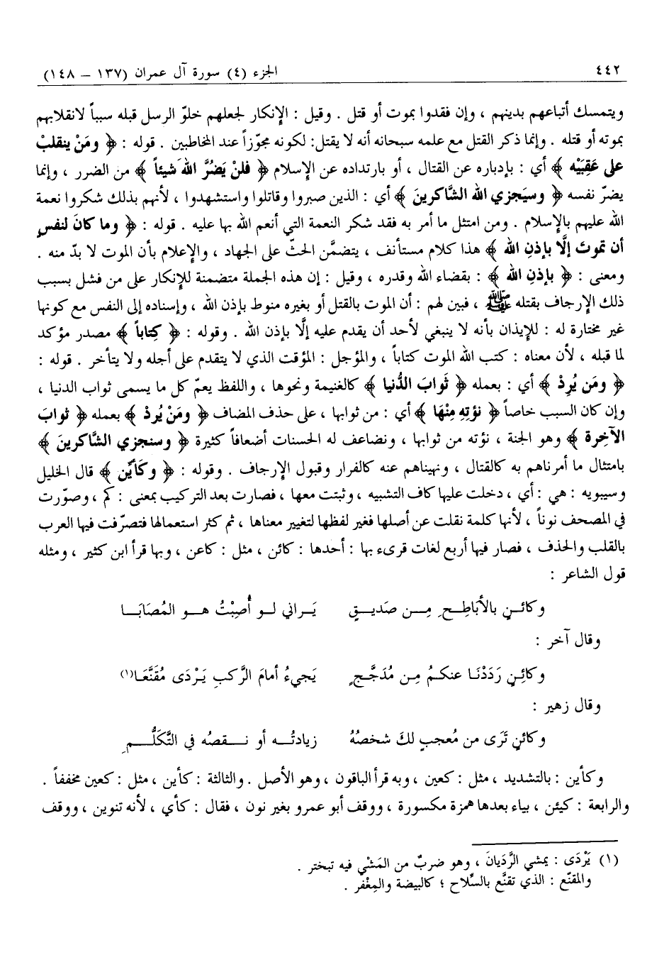 وَمَنْ يُرِدْ أي: بعمله ثَوابَ الدُّنْيا كَالْغَنِيمَةِ وَنَحْوِهَا، وَاللَّفْظُ يَعُمُّ كُلَّ مَا يُسَمَّى ثَوَابُ الدُّنْيَا، وَإِنْ كَانَ السَّبَبُ خَاصًّا نُؤْتِهِ مِنْها أَيْ: مِنْ ثَوَابِهَا، عَلَى حَذْفِ الْمُضَافِ وَمَنْ يُرِدْ بِعَمَلِهِ ثَوابَ الْآخِرَةِ وَهُوَ الْجَنَّةُ، نُؤْتِهِ مِنْ ثَوَابِهَا، وَنُضَاعِفْ لَهُ الْحَسَنَاتِ أَضْعَافًا كَثِيرَةً وَسَنَجْزِي الشَّاكِرِينَ بِامْتِثَالِ مَا أَمَرْنَاهُمْ بِهِ كَالْقِتَالِ، وَنَهَيْنَاهُمْ عَنْهُ كَالْفِرَارِ وَقَبُولِ الْإِرْجَافِ. وَقَوْلُهُ: وَكَأَيِّنْ قَالَ الْخَلِيلُ وَسِيبَوَيْهِ: هِيَ: أَيُّ، دَخَلَتْ عَلَيْهَا كَافُ التَّشْبِيهِ، وَثَبَتَتْ مَعَهَا، فَصَارَتْ بَعْدَ التَّرْكِيبِ بِمَعْنَى: كَمْ، وَصُوِّرَتْ فِي الْمُصْحَفِ نُونًا، لِأَنَّهَا كَلِمَةٌ نُقِلَتْ عَنْ أَصْلِهَا فَغُيِّرَ لَفْظُهَا لِتَغْيِيرِ مَعْنَاهَا، ثُمَّ كَثُرَ اسْتِعْمَالُهَا فَتَصَرَّفَتْ فِيهَا الْعَرَبُ بِالْقَلْبِ وَالْحَذْفِ، فَصَارَ فِيهَا أَرْبَعُ لُغَاتٍ قُرِئَ بِهَا: أَحَدُهَا: كَائِنٌ، مِثْلُ: كَاعِنٍ، وَبِهَا قَرَأَ ابْنُ كَثِيرٍ، وَمِثْلُهُ قَوْلُ الشاعر:
