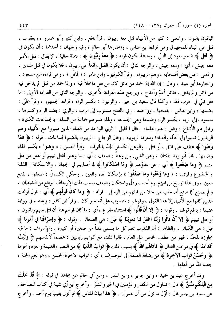 بِضَمِّهَا، وَابْنُ عَبَّاسٍ: بِفَتْحِهَا، وَوَاحِدُهُ: رَبِّيٌّ بِالْفَتْحِ مَنْسُوبٌ إِلَى الرَّبِّ، وَالرِّبِّيُّ: بِضَمِّ الرَّاءِ وَكَسْرِهَا، مَنْسُوبٌ إِلَى الرِّبَّةِ، بِكَسْرِ الرَّاءِ وَضَمِّهَا وَهِيَ الْجَمَاعَةُ، وَلِهَذَا فَسَرَّهُمْ جَمَاعَةٌ مِنَ السَّلَفِ بِالْجَمَاعَاتِ الْكَثِيرَةِ وَقِيلَ هُمُ الْأَتْبَاعُ وَقِيلَ: هُمُ الْعُلَمَاءُ. قَالَ الْخَلِيلُ: الرِّبِّيُّ الْوَاحِدُ مِنَ الْعِبَادِ الَّذِينَ صَبَرُوا مَعَ الْأَنْبِيَاءِ وَهُمُ الرَّبَّانِيُّونَ نُسِبُوا إِلَى التَّأَلُّهِ وَالْعِبَادَةِ وَمَعْرِفَةِ الرُّبُوبِيَّةِ. وَقَالَ الزَّجَّاجُ: الرُّبِّيُّونَ بِالضَّمِّ الْجَمَاعَاتُ. قَوْلُهُ: فَما وَهَنُوا عَطْفٌ عَلَى قَاتَلَ، أَوْ قُتِلَ. وَالْوَهْنُ انْكِسَارُ الْجِدِّ بِالْخَوْفِ. وَقَرَأَ الْحَسَنُ: «وَهِنُوا» بِكَسْرِ الْهَاءِ وَضَمِّهَا. قَالَ أَبُو زَيْدٍ: لُغَتَانِ، وَهَنَ الشَّيْءُ يَهِنُ وَهْنًا: ضَعُفَ، أَيْ: مَا وَهَنُوا لِقَتْلِ نَبِيِّهِمْ أَوْ لِقَتْلِ مَنْ قُتِلَ مِنْهُمْ وَما ضَعُفُوا أَيْ: عَنْ عَدُوِّهِمْ وَمَا اسْتَكانُوا لِمَا أَصَابَهُمْ فِي الْجِهَادِ. وَالِاسْتِكَانَةُ: الذِّلَّةُ وَالْخُضُوعُ وَقُرِئَ: «وَمَا وَهَنُوا وَمَا ضَعُفُوا» بِإِسْكَانِ الْهَاءِ وَالْعَيْنِ. وَحَكَى الْكِسَائِيُّ: ضَعَفُوا، بِفَتْحِ الْعَيْنِ، وَفِي هَذَا تَوْبِيخٌ لِمَنِ انْهَزَمَ يَوْمَ أُحُدٍ، وَذَلَّ وَاسْتَكَانَ وَضَعُفَ بِسَبَبِ ذَلِكَ الْإِرْجَافِ الْوَاقِعِ مِنَ الشَّيْطَانِ، وَلَمْ يَصْنَعْ كَمَا صَنَعَ أَصْحَابُ مَنْ خَلَا مَنْ قَبْلِهِمْ مِنَ الرُّسُلِ. قَوْلُهُ: وَما كانَ قَوْلَهُمْ أَيْ: قَوْلَ أُولَئِكَ الَّذِينَ كَانُوا مَعَ الْأَنْبِيَاءِ إِلَّا هَذَا الْقَوْلَ، وَقَوْلَهُمْ: مَنْصُوبٌ عَلَى أَنَّهُ خَبَرُ كَانَ. وَقَرَأَ ابْنُ كَثِيرٍ، وَعَاصِمٌ فِي رِوَايَةٍ عَنْهُمَا: بِرَفْعِ قَوْلِهِمْ. وَقَوْلُهُ: إِلَّا أَنْ قالُوا اسْتِثْنَاءٌ مُفَرَّغٌ، أَيْ: مَا كَانَ قَوْلَهُمْ عِنْدَ أَنْ قُتِلَ مِنْهُمْ رَبَّانِيُّونَ، أَوْ قُتِلَ نَبِيُّهُمْ إِلَّا أَنْ قالُوا رَبَّنَا اغْفِرْ لَنا ذُنُوبَنا قِيلَ: هِيَ الصَّغَائِرُ. وَقَوْلُهُ: وَإِسْرافَنا فِي أَمْرِنا قِيلَ: هِيَ الْكَبَائِرُ، وَالظَّاهِرُ: أَنَّ الذُّنُوبَ تَعُمُّ كُلَّ مَا يُسَمَّى ذَنْبًا مِنْ صَغِيرَةٍ أَوْ كَبِيرَةٍ. وَالْإِسْرَافُ: مَا فِيهِ مُجَاوَزَةٌ لِلْحَدِّ، فَهُوَ مِنْ عَطْفِ الْخَاصِّ عَلَى الْعَامِّ، قَالُوا ذَلِكَ مَعَ كَوْنِهِمْ رَبَّانِيِّينَ: هَضْمًا لِأَنْفُسِهِمْ وَثَبِّتْ أَقْدامَنا فِي مَوَاطِنِ الْقِتَالِ فَآتاهُمُ اللَّهُ بِسَبَبِ ذَلِكَ ثَوابَ الدُّنْيا مِنَ النَّصْرِ وَالْغَنِيمَةِ وَالْعِزَّةِ وَنَحْوِهَا وَحُسْنَ ثَوابِ الْآخِرَةِ مِنْ إِضَافَةِ الصِّفَةِ إِلَى الْمَوْصُوفِ، أَيْ: ثَوَابَ الْآخِرَةِ الْحَسَنِ، وَهُوَ نَعِيمُ الْجَنَّةِ، جَعَلْنَا اللَّهُ مِنْ أَهْلِهَا.