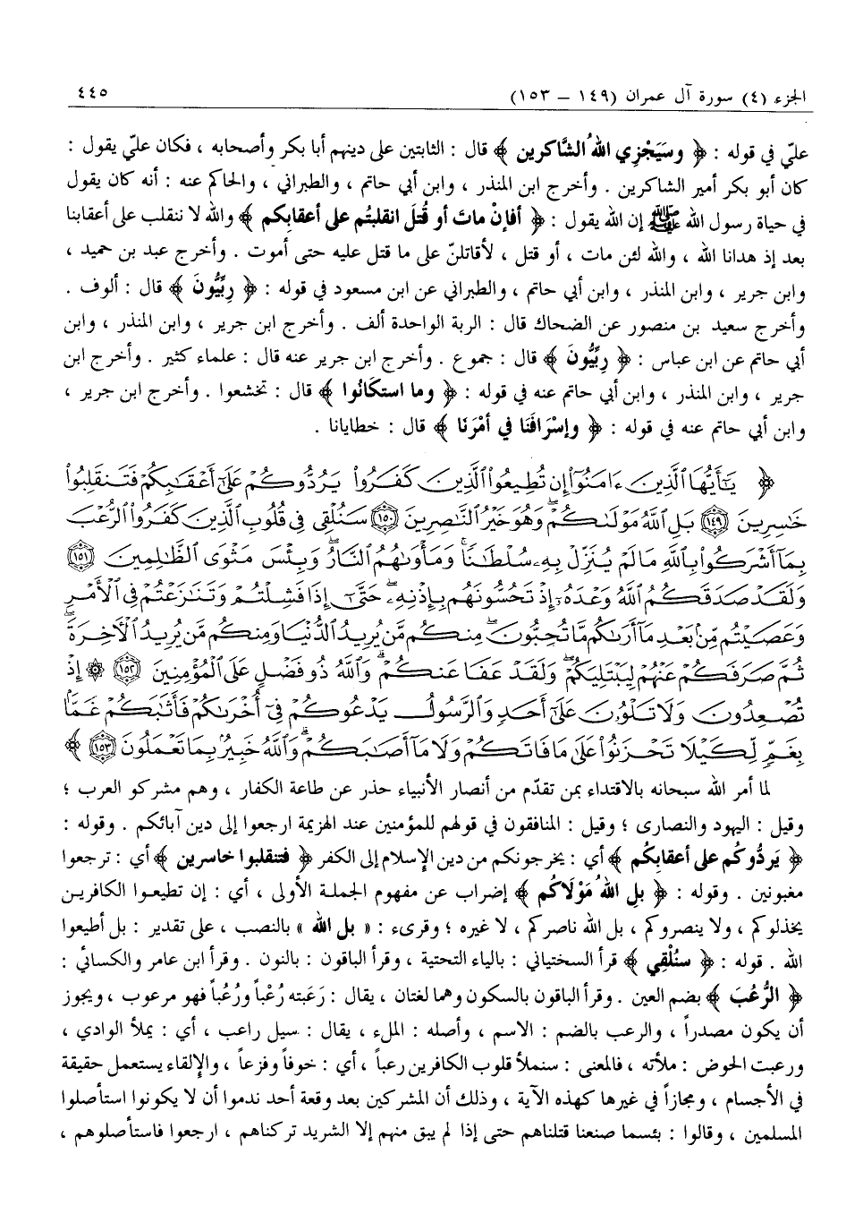 يَا أَيُّهَا الَّذِينَ آمَنُوا إِنْ تُطِيعُوا الَّذِينَ كَفَرُوا يَرُدُّوكُمْ عَلى أَعْقابِكُمْ فَتَنْقَلِبُوا خاسِرِينَ (149) بَلِ اللَّهُ مَوْلاكُمْ وَهُوَ خَيْرُ النَّاصِرِينَ (150) سَنُلْقِي فِي قُلُوبِ الَّذِينَ كَفَرُوا الرُّعْبَ بِما أَشْرَكُوا بِاللَّهِ مَا لَمْ يُنَزِّلْ بِهِ سُلْطاناً وَمَأْواهُمُ النَّارُ وَبِئْسَ مَثْوَى الظَّالِمِينَ (151) وَلَقَدْ صَدَقَكُمُ اللَّهُ وَعْدَهُ إِذْ تَحُسُّونَهُمْ بِإِذْنِهِ حَتَّى إِذا فَشِلْتُمْ وَتَنازَعْتُمْ فِي الْأَمْرِ وَعَصَيْتُمْ مِنْ بَعْدِ مَا أَراكُمْ مَا تُحِبُّونَ مِنْكُمْ مَنْ يُرِيدُ الدُّنْيا وَمِنْكُمْ مَنْ يُرِيدُ الْآخِرَةَ ثُمَّ صَرَفَكُمْ عَنْهُمْ لِيَبْتَلِيَكُمْ وَلَقَدْ عَفا عَنْكُمْ وَاللَّهُ ذُو فَضْلٍ عَلَى الْمُؤْمِنِينَ (152) إِذْ تُصْعِدُونَ وَلا تَلْوُونَ عَلى أَحَدٍ وَالرَّسُولُ يَدْعُوكُمْ فِي أُخْراكُمْ فَأَثابَكُمْ غَمًّا بِغَمٍّ لِكَيْلا تَحْزَنُوا عَلى مَا فاتَكُمْ وَلا مَا أَصابَكُمْ وَاللَّهُ خَبِيرٌ بِما تَعْمَلُونَ (153)