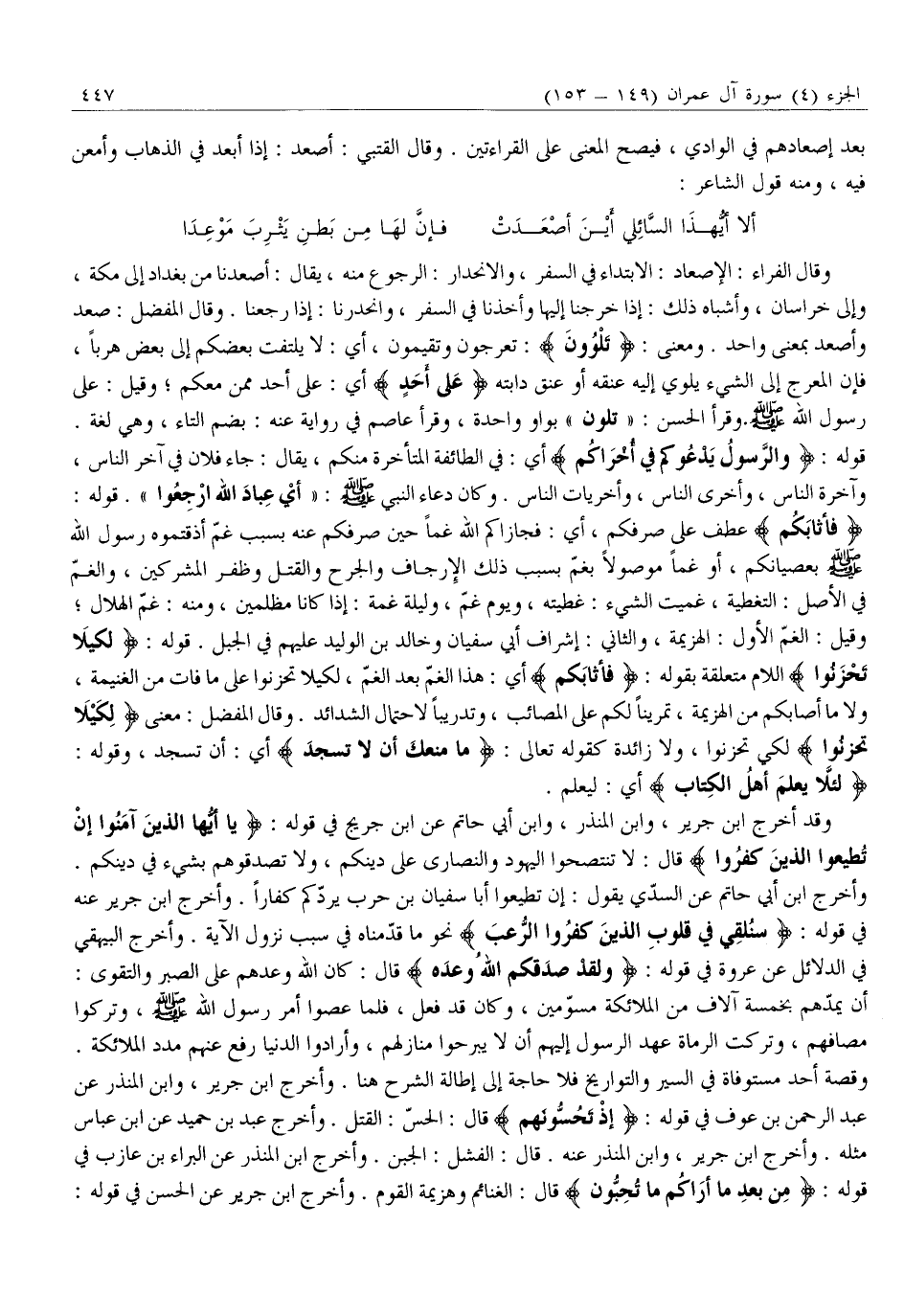 وَقَالَ الْفَرَّاءُ: الْإِصْعَادُ: الِابْتِدَاءُ فِي السَّفَرِ، وَالِانْحِدَارُ: الرُّجُوعُ مِنْهُ، يُقَالُ: أَصْعَدْنَا مِنْ بَغْدَادَ إِلَى مَكَّةَ، وَإِلَى خُرَاسَانَ، وَأَشْبَاهِ ذَلِكَ: إِذَا خَرَجْنَا إِلَيْهَا وَأَخَذْنَا فِي السَّفَرِ، وَانْحَدَرْنَا: إِذَا رَجَعْنَا. وَقَالَ الْمُفَضَّلُ: صَعِدَ وَأَصْعَدَ بِمَعْنًى وَاحِدٍ. وَمَعْنَى: تَلْوُونَ: تَعْرُجُونَ وَتُقِيمُونَ، أَيْ: لَا يَلْتَفِتُ بَعْضُكُمْ إِلَى بَعْضٍ هَرَبًا، فَإِنَّ الْمُعَرِّجَ إِلَى الشَّيْءِ يَلْوِي إِلَيْهِ عُنُقَهُ أَوْ عُنُقَ دَابَّتِهِ عَلى أَحَدٍ أَيْ: عَلَى أَحَدٍ مِمَّنْ مَعَكُمْ وَقِيلَ: عَلَى رَسُولِ اللَّهِ صَلَّى اللَّهُ عَلَيْهِ وَسَلَّمَ. وَقَرَأَ الْحَسَنُ: «تَلُونَ» بِوَاوٍ وَاحِدَةٍ، وَقَرَأَ عَاصِمٌ فِي رِوَايَةٍ عَنْهُ: بِضَمِّ التَّاءِ، وَهِيَ لُغَةٌ.