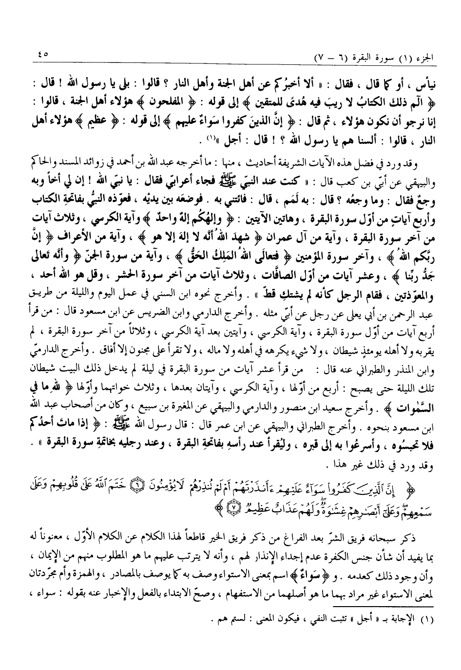 إِنَّا نَرْجُو أَنْ نَكُونَ هَؤُلَاءِ، ثُمَّ قَالَ: إِنَّ الَّذِينَ كَفَرُوا سَواءٌ عَلَيْهِمْ إِلَى قَوْلِهِ: عَظِيمٌ هَؤُلَاءِ أَهْلُ النَّارِ، قَالُوا: أَلَسْنَا هُمْ يَا رَسُولَ اللَّهِ؟! قَالَ: أَجَلْ» «1» .