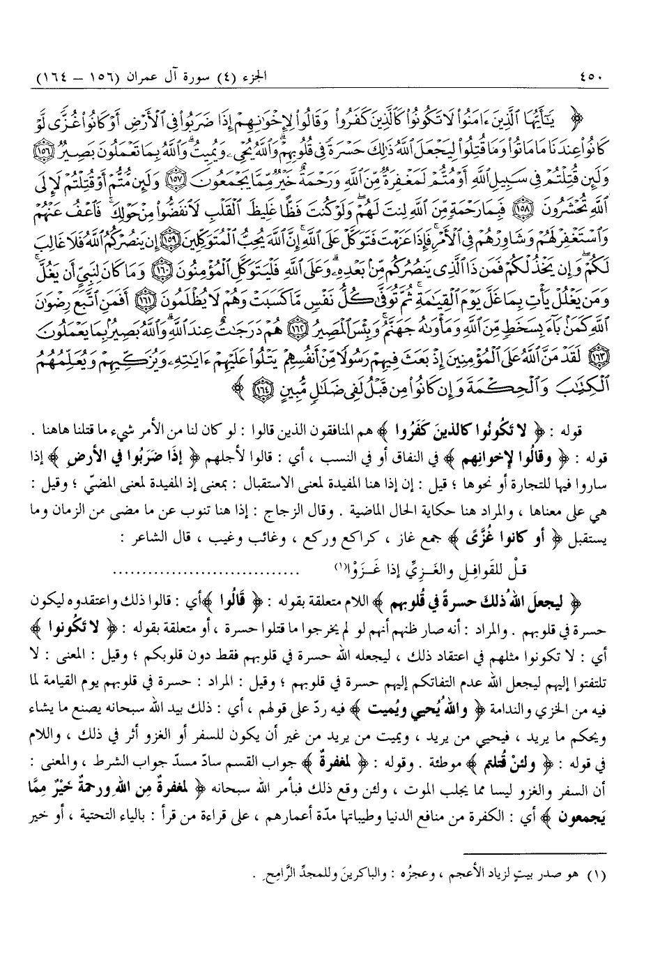 لِيَجْعَلَ اللَّهُ ذلِكَ حَسْرَةً فِي قُلُوبِهِمْ اللَّامُ مُتَعَلِّقَةٌ بِقَوْلِهِ: قالُوا أَيْ: قَالُوا ذَلِكَ وَاعْتَقَدُوهُ لِيَكُونَ حَسْرَةً فِي قُلُوبِهِمْ. وَالْمُرَادُ: أَنَّهُ صَارَ ظَنُّهُمْ أَنَّهُمْ لَوْ لَمْ يَخْرُجُوا مَا قُتِلُوا حَسْرَةً، أَوْ مُتَعَلِّقَةٌ بِقَوْلِهِ: لَا تَكُونُوا أَيْ: لَا تَكُونُوا مِثْلَهُمْ فِي اعْتِقَادِ ذَلِكَ، لِيَجْعَلَهُ اللَّهُ حَسْرَةً فِي قُلُوبِهِمْ فَقَطْ دُونَ قُلُوبِكُمْ وَقِيلَ: الْمَعْنَى: لَا تَلْتَفِتُوا إِلَيْهِمْ لِيَجْعَلَ اللَّهُ عَدَمَ الْتِفَاتِكُمْ إِلَيْهِمْ حَسْرَةً فِي قُلُوبِهِمْ وَقِيلَ: الْمُرَادُ: حَسْرَةً فِي قُلُوبِهِمْ يَوْمَ الْقِيَامَةِ لِمَا فِيهِ مِنَ الْخِزْيِ وَالنَّدَامَةِ وَاللَّهُ يُحْيِي وَيُمِيتُ فِيهِ رَدٌّ عَلَى قَوْلِهِمْ، أَيْ: ذَلِكَ بِيَدِ اللَّهِ سُبْحَانَهُ يَصْنَعُ مَا يَشَاءُ وَيَحْكُمُ مَا يُرِيدُ، فَيُحْيِي مَنْ يُرِيدُ، وَيُمِيتُ مَنْ يُرِيدُ مِنْ غَيْرِ أَنْ يَكُونَ لِلسَّفَرِ أَوِ الْغَزْوِ أَثَرٌ فِي ذَلِكَ، وَاللَّامُ فِي قَوْلِهِ: وَلَئِنْ قُتِلْتُمْ مُوَطِّئَةٌ. وَقَوْلُهُ: لَمَغْفِرَةٌ جَوَابُ الْقَسَمِ سَادٌّ مَسَدَّ جَوَابِ الشَّرْطِ، وَالْمَعْنَى: