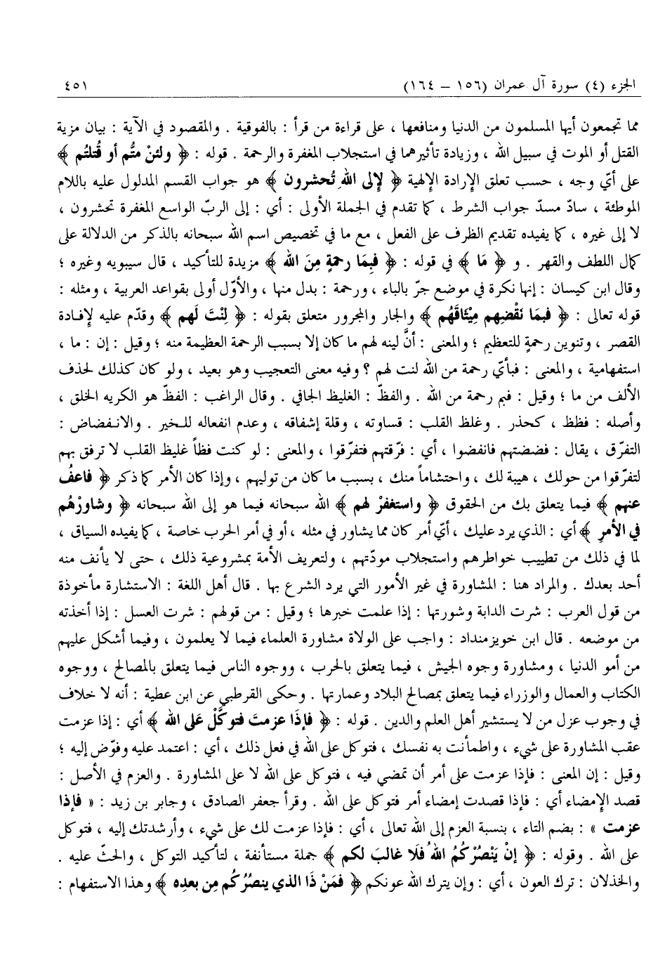 مِمَّا تَجْمَعُونَ أَيُّهَا الْمُسْلِمُونَ مِنَ الدُّنْيَا وَمَنَافِعِهَا، عَلَى قِرَاءَةِ مَنْ قَرَأَ: بِالْفَوْقِيَّةِ. وَالْمَقْصُودُ فِي الْآيَةِ: بَيَانُ مَزِيَّةِ الْقَتْلِ أَوِ الْمَوْتِ فِي سَبِيلِ اللَّهِ، وَزِيَادَةِ تَأْثِيرِهِمَا فِي اسْتِجْلَابِ الْمَغْفِرَةِ وَالرَّحْمَةِ. قَوْلُهُ: وَلَئِنْ مُتُّمْ أَوْ قُتِلْتُمْ عَلَى أَيِّ وَجْهٍ، حَسَبَ تَعَلُّقِ الْإِرَادَةِ الْإِلَهِيَّةِ لَإِلَى اللَّهِ تُحْشَرُونَ هُوَ جَوَابُ الْقَسَمِ الْمَدْلُولُ عَلَيْهِ بِاللَّامِ الْمُوَطِّئَةِ، سَادٌّ مَسَدَّ جَوَابِ الشَّرْطِ، كَمَا تَقَدَّمَ فِي الْجُمْلَةِ الْأُولَى: أَيْ: إِلَى الرَّبِّ الْوَاسِعِ الْمَغْفِرَةِ تُحْشَرُونَ، لَا إِلَى غَيْرِهِ، كَمَا يُفِيدُهُ تَقْدِيمُ الظَّرْفِ عَلَى الْفِعْلِ، مَعَ مَا فِي تَخْصِيصِ اسْمِ اللَّهِ سُبْحَانَهُ بِالذِّكْرِ مِنَ الدَّلَالَةِ عَلَى كَمَالِ اللُّطْفِ وَالْقَهْرِ. وَمَا فِي قَوْلِهِ: فَبِما رَحْمَةٍ مِنَ اللَّهِ مَزِيدَةٌ لِلتَّأْكِيدِ، قال سِيبَوَيْهَ وَغَيْرُهُ وَقَالَ ابْنُ كَيْسَانَ: إِنَّهَا نَكِرَةٌ فِي مَوْضِعِ جَرٍّ بِالْبَاءِ، وَرَحْمَةٍ: بَدَلٌ مِنْهَا، وَالْأَوَّلُ أَوْلَى بِقَوَاعِدِ الْعَرَبِيَّةِ، وَمِثْلُهُ:
