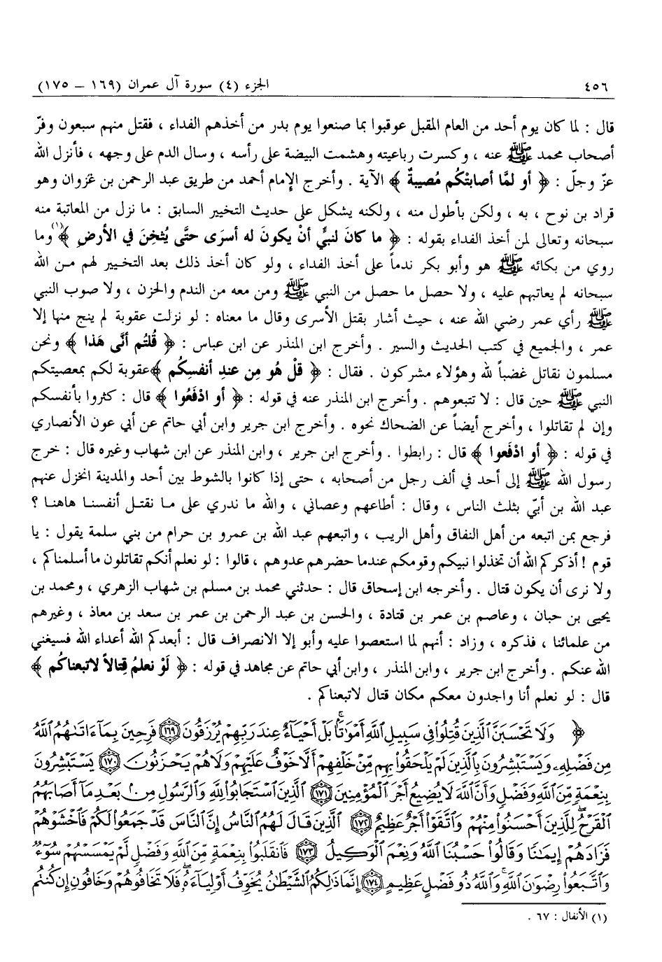 قَالَ: لَمَّا كَانَ يَوْمُ أُحُدٍ مِنَ الْعَامِ الْمُقْبِلِ عُوقِبُوا بِمَا صَنَعُوا يَوْمَ بَدْرٍ مِنْ أَخْذِهِمُ الْفِدَاءَ، فَقُتِلَ مِنْهُمْ سَبْعُونَ وَفَرَّ أَصْحَابُ محمد صلّى الله عليه وَسَلَّمَ عَنْهُ، وَكُسِرَتْ رَبَاعِيَّتُهُ وَهُشِّمَتِ الْبَيْضَةُ عَلَى رَأْسِهِ، وَسَالَ الدَّمُ عَلَى وَجْهِهِ، فَأَنْزَلَ اللَّهُ عزّ وجلّ: أَوَلَمَّا أَصابَتْكُمْ مُصِيبَةٌ الآية. وأخرج الْإِمَامُ أَحْمَدُ مِنْ طَرِيقِ عَبْدِ الرَّحْمَنِ بْنِ غَزْوَانَ وَهُوَ قُرَادُ بْنُ نُوحٍ، بِهِ، وَلَكِنْ بِأَطْوَلَ مِنْهُ، وَلَكِنَّهُ يُشْكِلُ عَلَى حَدِيثِ التَّخْيِيرِ السَّابِقِ: مَا نَزَلَ مِنَ الْمُعَاتَبَةِ مِنْهُ سُبْحَانَهُ وَتَعَالَى لِمَنْ أَخَذَ الْفِدَاءَ بِقَوْلِهِ: مَا كانَ لِنَبِيٍّ أَنْ يَكُونَ لَهُ أَسْرى حَتَّى يُثْخِنَ فِي الْأَرْضِ «1» وَمَا رُوِيَ مِنْ بُكَائِهِ صَلَّى اللَّهُ عَلَيْهِ وَسَلَّمَ هُوَ وَأَبُو بَكْرٍ نَدَمًا عَلَى أَخْذِ الْفِدَاءِ، وَلَوْ كَانَ أَخْذُ ذَلِكَ بَعْدَ التَّخْيِيرِ لَهُمْ مِنَ اللَّهِ سُبْحَانَهُ لَمْ يُعَاتِبْهُمْ عَلَيْهِ، وَلَا حَصَلَ مَا حَصَلَ مِنَ النَّبِيِّ صَلَّى اللَّهُ عَلَيْهِ وَسَلَّمَ وَمَنْ مَعَهُ مِنَ النَّدَمِ وَالْحُزْنِ، وَلَا صوب النبي صلّى الله عليه وَسَلَّمَ رَأْيَ عُمَرَ رَضِيَ اللَّهُ عَنْهُ، حَيْثُ أَشَارَ بِقَتْلِ الْأَسْرَى وَقَالَ مَا مَعْنَاهُ: لَوْ نَزَلَتْ عُقُوبَةٌ لَمْ يَنْجُ مِنْهَا إِلَّا عُمَرُ، وَالْجَمِيعُ فِي كُتُبِ الْحَدِيثِ وَالسِّيَرِ. وَأَخْرَجَ ابْنُ الْمُنْذِرِ عَنِ ابْنِ عَبَّاسٍ: قُلْتُمْ أَنَّى هَذَا وَنَحْنُ مُسْلِمُونَ نُقَاتِلُ غَضَبًا لِلَّهِ وَهَؤُلَاءِ مُشْرِكُونَ. فَقَالَ: قُلْ هُوَ مِنْ عِنْدِ أَنْفُسِكُمْ عُقُوبَةٌ لكم بمعصيتكم النبي صلّى الله عليه وَسَلَّمَ حِينَ قَالَ: لَا تَتْبَعُوهُمْ. وَأَخْرَجَ ابْنُ الْمُنْذِرِ عَنْهُ فِي قَوْلِهِ: أَوِ ادْفَعُوا قَالَ: كَثِّرُوا بِأَنْفُسِكُمْ وَإِنْ لَمْ تُقَاتِلُوا، وَأَخْرَجَ أَيْضًا عَنِ الضَّحَّاكِ نَحْوَهُ. وَأَخْرَجَ ابْنُ جَرِيرٍ وَابْنُ أَبِي حَاتِمٍ عَنْ أَبِي عَوْنِ الْأَنْصَارِيِّ فِي قَوْلِهِ: أَوِ ادْفَعُوا قَالَ: رَابِطُوا. وَأَخْرَجَ ابْنُ جَرِيرٍ، وَابْنُ الْمُنْذِرِ عَنِ ابْنِ شِهَابٍ وَغَيْرِهِ قَالَ: خَرَجَ رَسُولُ اللَّهِ صَلَّى اللَّهُ عَلَيْهِ وَسَلَّمَ إِلَى أُحُدٍ فِي أَلْفِ رَجُلٍ مِنْ أَصْحَابِهِ، حَتَّى إِذَا كَانُوا بِالشَّوْطِ بَيْنَ أُحُدٍ وَالْمَدِينَةِ انْخَزَلَ عَنْهُمْ عَبْدُ اللَّهِ بْنُ أُبَيٍّ بِثُلُثِ النَّاسِ، وَقَالَ: أَطَاعَهُمْ وَعَصَانِي، وَاللَّهِ مَا ندري على ما نَقْتُلُ أَنْفُسَنَا هَاهُنَا؟
