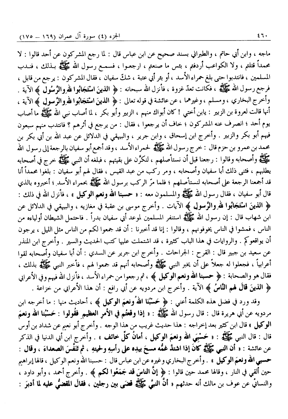 وَأَخْرَجَ الْبُخَارِيُّ، وَمُسْلِمٌ، وَغَيْرُهُمَا، عَنْ عَائِشَةَ فِي قَوْلِهِ تَعَالَى: الَّذِينَ اسْتَجابُوا لِلَّهِ وَالرَّسُولِ الْآيَةَ، أَنَّهَا قَالَتْ لِعُرْوَةَ بْنِ الزُّبَيْرِ: يَا ابْنَ أُخْتِي! كَانَ أَبَوَاكَ مِنْهُمْ، الزُّبَيْرُ وَأَبُو بَكْرٍ، لَمَّا أَصَابَ نَبِيَّ اللَّهِ صلّى الله عليه وَسَلَّمَ مَا أَصَابَ يَوْمَ أُحُدٍ انْصَرَفَ عَنْهُ الْمُشْرِكُونَ خَافَ أَنْ يَرْجِعُوا، فَقَالَ: مَنْ يَرْجِعُ فِي أَثَرِهِمْ؟ فَانْتَدَبَ مِنْهُمْ سَبْعُونَ فِيهِمْ أَبُو بَكْرٍ وَالزُّبَيْرُ. وَأَخْرَجَ ابْنُ إِسْحَاقَ، وَابْنُ جَرِيرٍ، وَالْبَيْهَقِيُّ فِي الدَّلَائِلِ عَنْ عَبْدِ اللَّهِ بْنِ أَبِي بَكْرِ بْنِ مُحَمَّدِ بْنِ عَمْرِو بْنِ حَزْمٍ قَالَ: خَرَجَ رَسُولُ اللَّهِ صَلَّى اللَّهُ عَلَيْهِ وسلّم لحمراء الْأَسَدِ، وَقَدْ أَجْمَعَ أَبُو سُفْيَانَ بِالرَّجْعَةِ إِلَى رَسُولِ اللَّهِ صَلَّى اللَّهُ عَلَيْهِ وَسَلَّمَ وَأَصْحَابِهِ وَقَالُوا: رَجَعْنَا قَبْلَ أَنْ نَسْتَأْصِلَهُمْ، لَنَكُرَّنَّ عَلَى بَقِيَّتِهِمْ، فَبَلَغَهُ أَنَّ النَّبِيَّ صَلَّى اللَّهُ عَلَيْهِ وَسَلَّمَ خَرَجَ فِي أَصْحَابِهِ يَطْلُبُهُمْ، فَثَنَى ذَلِكَ أَبَا سُفْيَانَ وَأَصْحَابَهُ، وَمَرَّ رَكْبٌ مِنْ عَبْدِ الْقَيْسِ، فَقَالَ لَهُمْ أَبُو سُفْيَانَ: بَلِّغُوا مُحَمَّدًا أَنَّا قَدْ أَجْمَعْنَا الرَّجْعَةَ عَلَى أَصْحَابِهِ لِنَسْتَأْصِلَهُمْ فَلَمَّا مَرَّ الرَّكْبُ بِرَسُولِ اللَّهِ صَلَّى اللَّهُ عليه وَسَلَّمَ بِحَمْرَاءِ الْأَسَدِ أَخْبَرُوهُ بِالَّذِي قَالَ أَبُو سُفْيَانَ، فَقَالَ رَسُولُ اللَّهِ صَلَّى اللَّهُ عَلَيْهِ وَسَلَّمَ وَالْمُسْلِمُونَ مَعَهُ: «حَسْبُنَا اللَّهُ وَنِعْمَ الْوَكِيلُ» ، فَأَنْزَلَ اللَّهُ فِي ذَلِكَ: