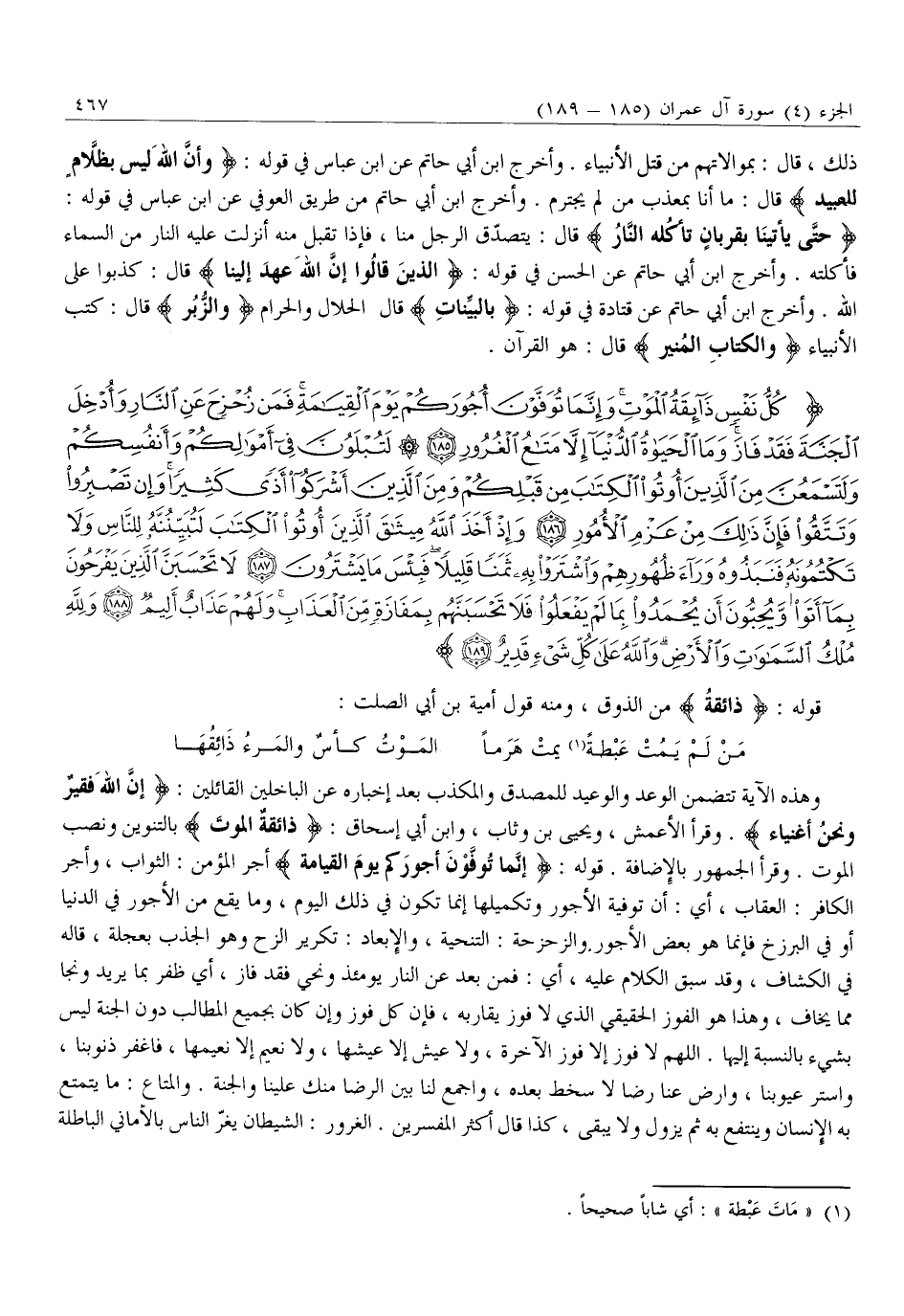 كُلُّ نَفْسٍ ذائِقَةُ الْمَوْتِ وَإِنَّما تُوَفَّوْنَ أُجُورَكُمْ يَوْمَ الْقِيامَةِ فَمَنْ زُحْزِحَ عَنِ النَّارِ وَأُدْخِلَ الْجَنَّةَ فَقَدْ فازَ وَمَا الْحَياةُ الدُّنْيا إِلاَّ مَتاعُ الْغُرُورِ (185) لَتُبْلَوُنَّ فِي أَمْوالِكُمْ وَأَنْفُسِكُمْ وَلَتَسْمَعُنَّ مِنَ الَّذِينَ أُوتُوا الْكِتابَ مِنْ قَبْلِكُمْ وَمِنَ الَّذِينَ أَشْرَكُوا أَذىً كَثِيراً وَإِنْ تَصْبِرُوا وَتَتَّقُوا فَإِنَّ ذلِكَ مِنْ عَزْمِ الْأُمُورِ (186) وَإِذْ أَخَذَ اللَّهُ مِيثاقَ الَّذِينَ أُوتُوا الْكِتابَ لَتُبَيِّنُنَّهُ لِلنَّاسِ وَلا تَكْتُمُونَهُ فَنَبَذُوهُ وَراءَ ظُهُورِهِمْ وَاشْتَرَوْا بِهِ ثَمَناً قَلِيلاً فَبِئْسَ مَا يَشْتَرُونَ (187) لَا تَحْسَبَنَّ الَّذِينَ يَفْرَحُونَ بِما أَتَوْا وَيُحِبُّونَ أَنْ يُحْمَدُوا بِما لَمْ يَفْعَلُوا فَلا تَحْسَبَنَّهُمْ بِمَفازَةٍ مِنَ الْعَذابِ وَلَهُمْ عَذابٌ أَلِيمٌ (188) وَلِلَّهِ مُلْكُ السَّماواتِ وَالْأَرْضِ وَاللَّهُ عَلى كُلِّ شَيْءٍ قَدِيرٌ (189)