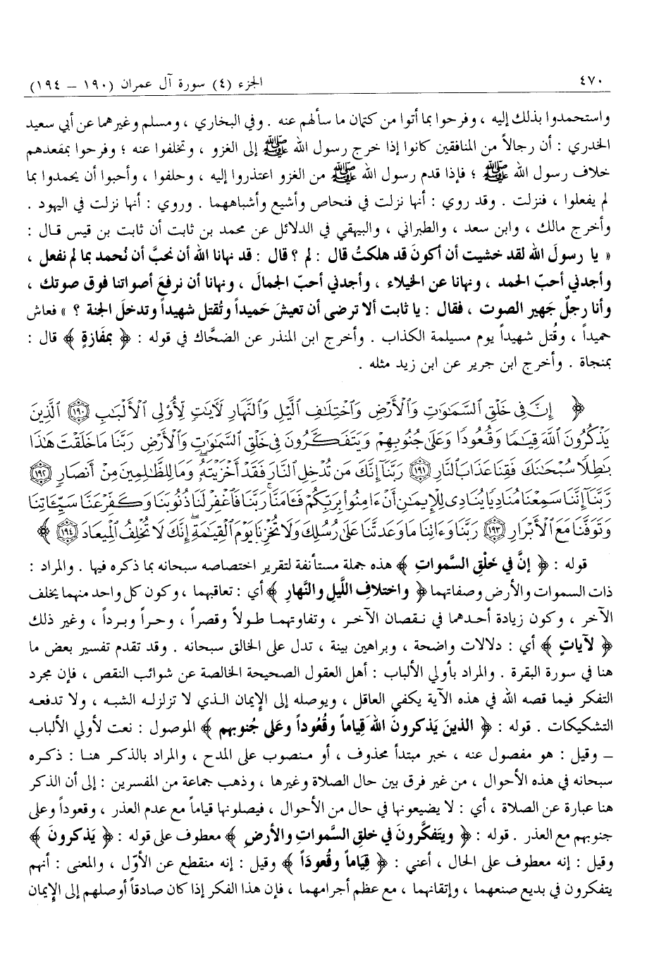 إِنَّ فِي خَلْقِ السَّماواتِ وَالْأَرْضِ وَاخْتِلافِ اللَّيْلِ وَالنَّهارِ لَآياتٍ لِأُولِي الْأَلْبابِ (190) الَّذِينَ يَذْكُرُونَ اللَّهَ قِياماً وَقُعُوداً وَعَلى جُنُوبِهِمْ وَيَتَفَكَّرُونَ فِي خَلْقِ السَّماواتِ وَالْأَرْضِ رَبَّنا مَا خَلَقْتَ هَذَا باطِلاً سُبْحانَكَ فَقِنا عَذابَ النَّارِ (191) رَبَّنا إِنَّكَ مَنْ تُدْخِلِ النَّارَ فَقَدْ أَخْزَيْتَهُ وَما لِلظَّالِمِينَ مِنْ أَنْصارٍ (192) رَبَّنا إِنَّنا سَمِعْنا مُنادِياً يُنادِي لِلْإِيمانِ أَنْ آمِنُوا بِرَبِّكُمْ فَآمَنَّا رَبَّنا فَاغْفِرْ لَنا ذُنُوبَنا وَكَفِّرْ عَنَّا سَيِّئاتِنا وَتَوَفَّنا مَعَ الْأَبْرارِ (193) رَبَّنا وَآتِنا مَا وَعَدْتَنا عَلى رُسُلِكَ وَلا تُخْزِنا يَوْمَ الْقِيامَةِ إِنَّكَ لَا تُخْلِفُ الْمِيعادَ (194)