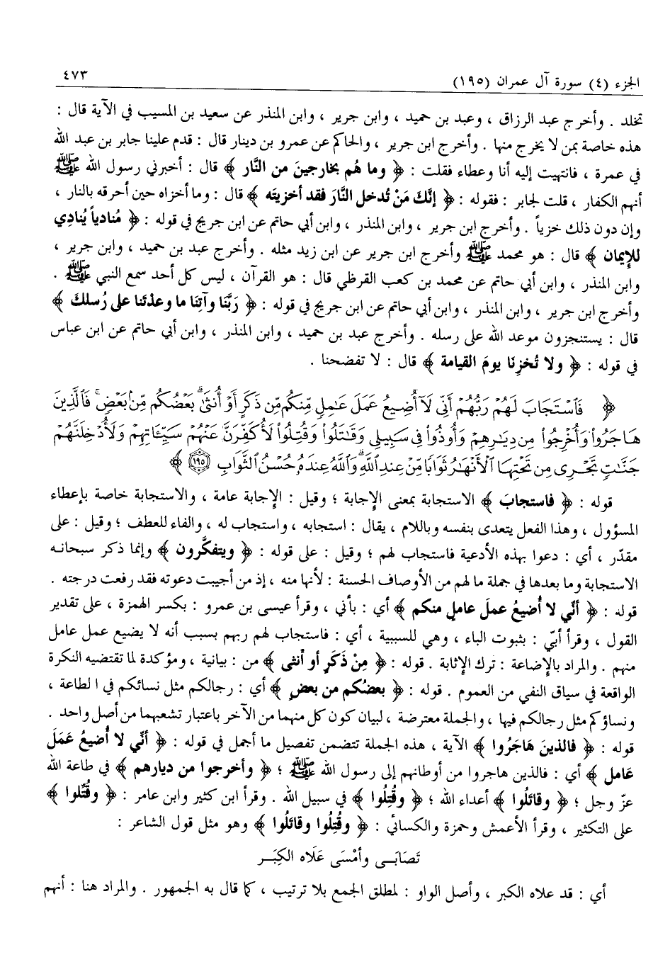 فَاسْتَجابَ لَهُمْ رَبُّهُمْ أَنِّي لَا أُضِيعُ عَمَلَ عامِلٍ مِنْكُمْ مِنْ ذَكَرٍ أَوْ أُنْثى بَعْضُكُمْ مِنْ بَعْضٍ فَالَّذِينَ هاجَرُوا وَأُخْرِجُوا مِنْ دِيارِهِمْ وَأُوذُوا فِي سَبِيلِي وَقاتَلُوا وَقُتِلُوا لَأُكَفِّرَنَّ عَنْهُمْ سَيِّئاتِهِمْ وَلَأُدْخِلَنَّهُمْ جَنَّاتٍ تَجْرِي مِنْ تَحْتِهَا الْأَنْهارُ ثَواباً مِنْ عِنْدِ اللَّهِ وَاللَّهُ عِنْدَهُ حُسْنُ الثَّوابِ (195)
