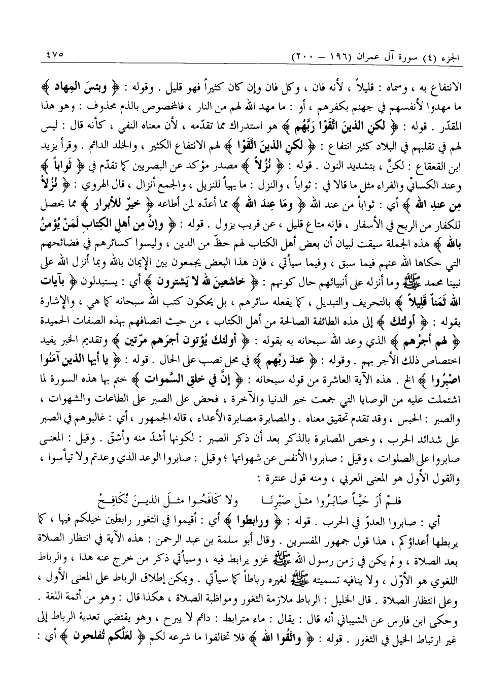 أَيْ: صَابَرُوا الْعَدُوَّ فِي الْحَرْبِ. قَوْلُهُ: وَرابِطُوا أَيْ: أَقِيمُوا فِي الثُّغُورِ رَابِطِينَ خَيْلَكُمْ فِيهَا، كَمَا يَرْبُطُهَا أعداؤكم، هذا قَوْلُ جُمْهُورِ الْمُفَسِّرِينَ. وَقَالَ أَبُو سَلَمَةَ بْنُ عَبْدِ الرَّحْمَنِ: هَذِهِ الْآيَةُ فِي انْتِظَارِ الصَّلَاةِ بَعْدَ الصَّلَاةِ، وَلَمْ يَكُنْ فِي زَمَنِ رَسُولِ اللَّهِ صَلَّى اللَّهُ عَلَيْهِ وَسَلَّمَ غَزْوٌ يُرَابَطُ فِيهِ، وَسَيَأْتِي ذِكْرُ مَنْ خَرَجَ عَنْهُ هَذَا، وَالرِّبَاطُ اللُّغَوِيُّ هُوَ الْأَوَّلُ، ولا ينافيه تسميته صلّى الله عليه وَسَلَّمَ لِغَيْرِهِ رِبَاطًا كَمَا سَيَأْتِي. وَيُمْكِنُ إِطْلَاقُ الرِّبَاطِ عَلَى الْمَعْنَى الْأَوَّلِ، وَعَلَى انْتِظَارِ الصَّلَاةِ. قَالَ الْخَلِيلُ: الرِّبَاطُ مُلَازَمَةُ الثُّغُورِ وَمُوَاظَبَةُ الصَّلَاةِ، هَكَذَا قَالَ: وَهُوَ مِنْ أَئِمَّةِ اللُّغَةِ.