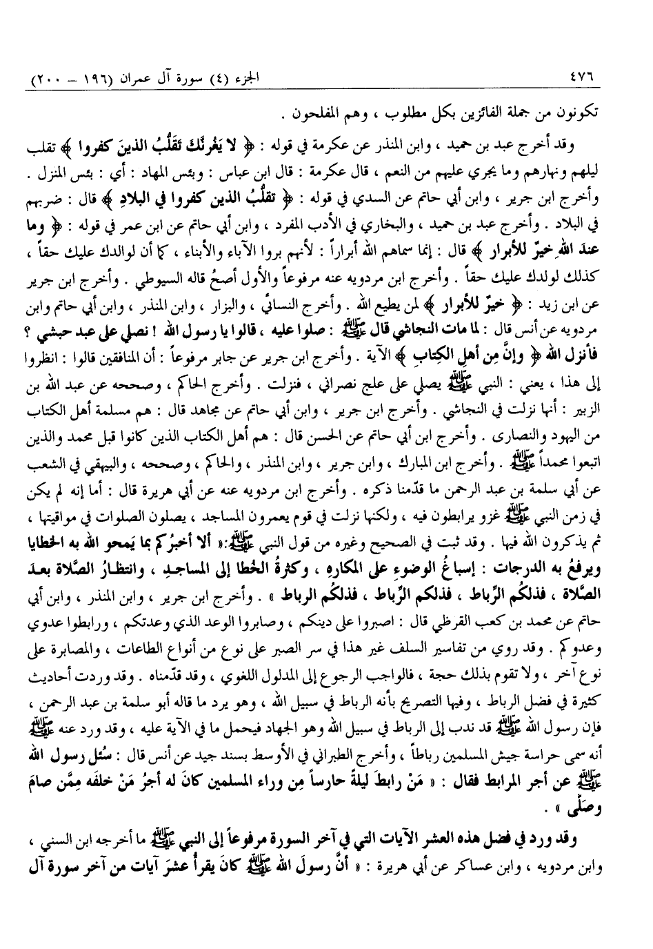 فأنزل الله وَإِنَّ مِنْ أَهْلِ الْكِتابِ الْآيَةَ. وَأَخْرَجَ ابْنُ جَرِيرٍ عَنْ جَابِرٍ مَرْفُوعًا: أَنَّ الْمُنَافِقِينَ قَالُوا: انْظُرُوا إِلَى هَذَا، يَعْنِي: النَّبِيَّ صَلَّى اللَّهُ عَلَيْهِ وَسَلَّمَ يُصَلِّي عَلَى عِلْجٍ نَصْرَانِيٍّ، فَنَزَلَتْ. وَأَخْرَجَ الْحَاكِمُ، وَصَحَّحَهُ عَنْ عَبْدِ اللَّهِ بْنِ الزُّبَيْرِ: أَنَّهَا نَزَلَتْ فِي النَّجَاشِيِّ. وَأَخْرَجَ ابْنُ جَرِيرٍ، وَابْنُ أَبِي حَاتِمٍ عَنْ مُجَاهِدٍ قَالَ: هُمْ مُسْلِمَةُ أَهْلِ الْكِتَابِ مِنَ الْيَهُودِ وَالنَّصَارَى. وَأَخْرَجَ ابْنُ أَبِي حَاتِمٍ عَنِ الْحَسَنِ قَالَ: هُمْ أَهْلُ الْكِتَابِ الَّذِينَ كَانُوا قَبْلَ مُحَمَّدٍ وَالَّذِينَ اتبعوا محمدا صلّى الله عليه وَسَلَّمَ. وَأَخْرَجَ ابْنُ الْمُبَارَكِ، وَابْنُ جَرِيرٍ، وَابْنُ الْمُنْذِرِ، وَالْحَاكِمُ، وَصَحَّحَهُ، وَالْبَيْهَقِيُّ فِي الشُّعَبِ عَنْ أَبِي سَلَمَةَ بْنِ عَبْدِ الرَّحْمَنِ مَا قَدَّمْنَا ذِكْرَهُ. وَأَخْرَجَ ابْنُ مَرْدَوَيْهِ عَنْهُ عَنْ أَبِي هُرَيْرَةَ قَالَ: أَمَا إِنَّهُ لَمْ يَكُنْ فِي زَمَنِ النَّبِيِّ صَلَّى اللَّهُ عَلَيْهِ وَسَلَّمَ غَزْوٌ يُرَابِطُونَ فِيهِ، وَلَكِنَّهَا نَزَلَتْ فِي قَوْمٍ يَعْمُرُونَ الْمَسَاجِدَ، يُصَلُّونَ الصَّلَوَاتِ فِي مَوَاقِيتِهَا، ثُمَّ يَذْكُرُونَ اللَّهَ فِيهَا. وَقَدْ ثَبَتَ فِي الصَّحِيحِ وَغَيْرِهِ مِنْ قَوْلِ النَّبِيِّ صَلَّى اللَّهُ عَلَيْهِ وَسَلَّمَ: «أَلَا أُخْبِرُكُمْ بِمَا يَمْحُو اللَّهُ بِهِ الْخَطَايَا وَيَرْفَعُ بِهِ الدَّرَجَاتِ: إِسْبَاغُ الْوُضُوءِ عَلَى الْمَكَارِهِ، وَكَثْرَةُ الْخُطَا إِلَى الْمَسَاجِدِ، وَانْتِظَارُ الصَّلَاةِ بَعْدَ الصَّلَاةِ، فَذَلِكُمُ الرِّبَاطُ، فَذَلِكُمُ الرِّبَاطُ، فَذَلِكُمُ الرِّبَاطُ» . وَأَخْرَجَ ابْنُ جَرِيرٍ، وَابْنُ الْمُنْذِرِ، وَابْنُ أَبِي حَاتِمٍ عَنْ مُحَمَّدِ بْنِ كَعْبٍ الْقُرَظِيِّ قَالَ: اصْبِرُوا عَلَى دِينِكُمْ، وَصَابِرُوا الْوَعْدَ الَّذِي وَعَدْتُكُمْ، وَرَابِطُوا عَدُوِّي وَعَدُوَّكُمْ. وَقَدْ رُوِيَ مِنْ تَفَاسِيرِ السَّلَفِ غَيْرُ هَذَا فِي سِرِّ الصَّبْرِ عَلَى نَوْعٍ مِنْ أَنْوَاعِ الطَّاعَاتِ، وَالْمُصَابَرَةِ عَلَى نَوْعٍ آخَرَ، وَلَا تَقُومُ بِذَلِكَ حُجَّةٌ، فَالْوَاجِبُ الرُّجُوعُ إِلَى الْمَدْلُولِ اللُّغَوِيِّ، وَقَدْ قَدَّمْنَاهُ. وَقَدْ وَرَدَتْ أَحَادِيثُ كَثِيرَةٌ فِي فَضْلِ الرِّبَاطِ، وَفِيهَا التَّصْرِيحُ بِأَنَّهُ الرِّبَاطُ فِي سَبِيلِ اللَّهِ، وَهُوَ يَرُدُّ مَا قَالَهُ أَبُو سَلَمَةَ بْنُ عَبْدِ الرَّحْمَنِ، فَإِنَّ رَسُولَ اللَّهِ صَلَّى اللَّهُ عَلَيْهِ وَسَلَّمَ قَدْ نَدَبَ إِلَى الرِّبَاطِ فِي سَبِيلِ اللَّهِ وَهُوَ الْجِهَادُ فَيُحْمَلُ مَا فِي الْآيَةِ عَلَيْهِ، وَقَدْ وَرَدَ عَنْهُ صَلَّى اللَّهُ عَلَيْهِ وَسَلَّمَ أَنَّهُ سَمَّى حِرَاسَةَ جَيْشِ الْمُسْلِمِينَ رِبَاطًا، وأخرج الطَّبَرَانِيُّ فِي الْأَوْسَطِ بِسَنَدٍ جَيِّدٍ عَنْ أَنَسٍ قَالَ: سُئِلَ رَسُولُ اللَّهِ صَلَّى اللَّهُ عَلَيْهِ وَسَلَّمَ عَنْ أَجْرِ الْمُرَابِطِ فَقَالَ: «مَنْ رَابَطَ لَيْلَةً حَارِسًا مِنْ وَرَاءِ الْمُسْلِمِينَ كَانَ لَهُ أَجْرُ مَنْ خَلْفَهُ مِمَّنْ صَامَ وَصَلَّى» .