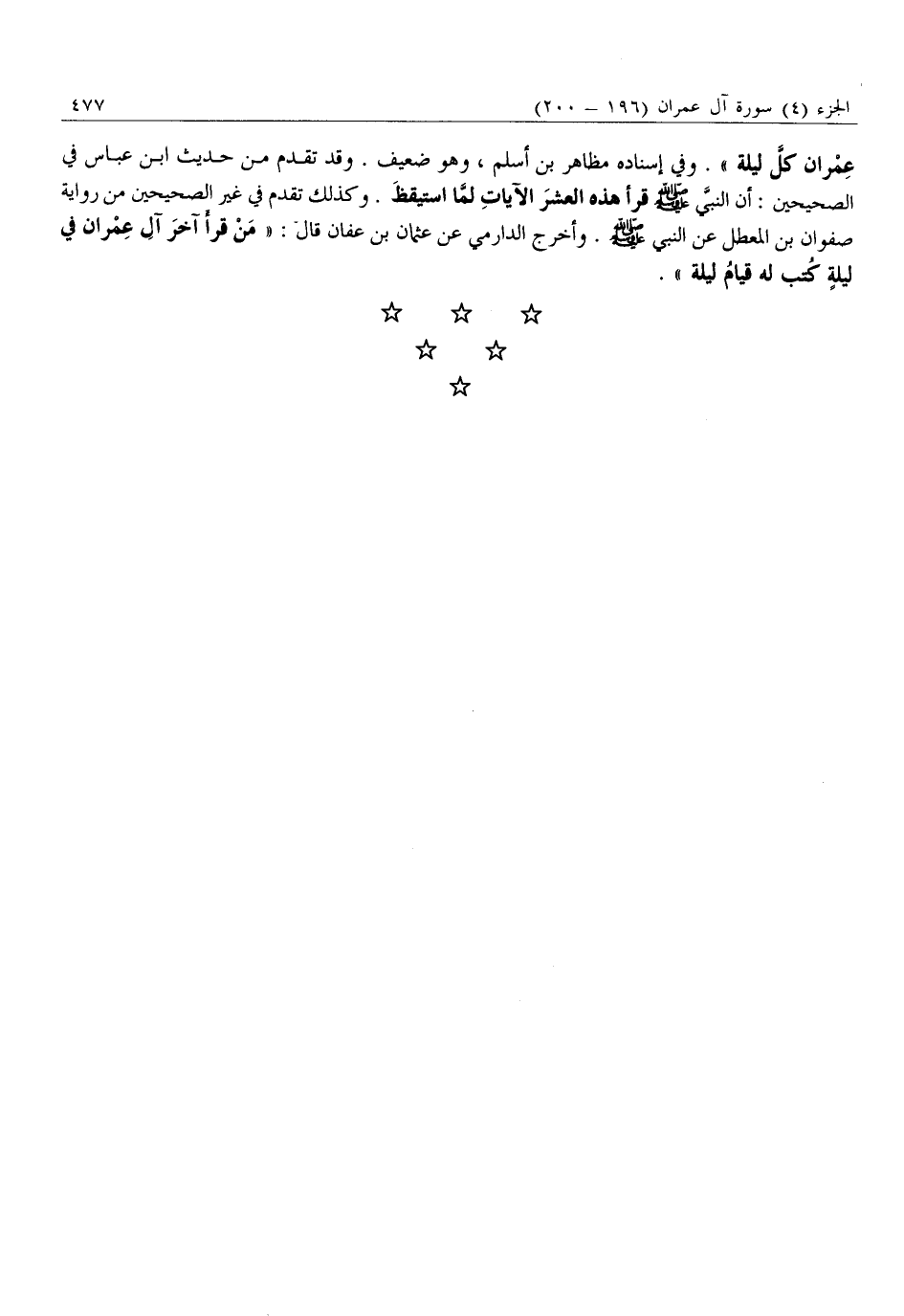 عِمْرَانَ كُلَّ لَيْلَةٍ» . وَفِي إِسْنَادِهِ مُظَاهِرُ بْنُ أَسْلَمَ، وَهُوَ ضَعِيفٌ. وَقَدْ تَقَدَّمَ مِنْ حَدِيثِ ابْنِ عَبَّاسٍ فِي الصَّحِيحَيْنِ: أَنَّ النَّبِيَّ صَلَّى اللَّهُ عَلَيْهِ وَسَلَّمَ قَرَأَ هَذِهِ الْعَشْرَ الْآيَاتِ لَمَّا اسْتَيْقَظَ. وَكَذَلِكَ تَقَدَّمَ فِي غَيْرِ الصَّحِيحَيْنِ مِنْ رِوَايَةِ صَفْوَانَ بْنِ الْمُعَطَّلِ عَنِ النَّبِيِّ صَلَّى اللَّهُ عَلَيْهِ وَسَلَّمَ. وَأَخْرَجَ الدَّارِمِيُّ عَنْ عُثْمَانَ بْنِ عَفَّانَ قَالَ: «مَنْ قَرَأَ آخِرَ آلِ عِمْرَانَ فِي ليلة كتب له قيام ليلة» .