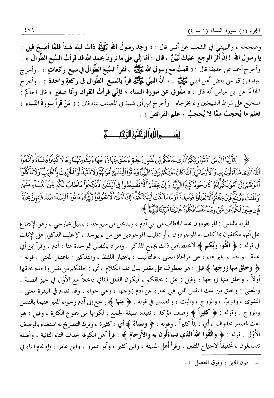 يَا أَيُّهَا النَّاسُ اتَّقُوا رَبَّكُمُ الَّذِي خَلَقَكُمْ مِنْ نَفْسٍ واحِدَةٍ وَخَلَقَ مِنْها زَوْجَها وَبَثَّ مِنْهُما رِجالاً كَثِيراً وَنِساءً وَاتَّقُوا اللَّهَ الَّذِي تَسائَلُونَ بِهِ وَالْأَرْحامَ إِنَّ اللَّهَ كانَ عَلَيْكُمْ رَقِيباً (1) وَآتُوا الْيَتامى أَمْوالَهُمْ وَلا تَتَبَدَّلُوا الْخَبِيثَ بِالطَّيِّبِ وَلا تَأْكُلُوا أَمْوالَهُمْ إِلى أَمْوالِكُمْ إِنَّهُ كانَ حُوباً كَبِيراً (2) وَإِنْ خِفْتُمْ أَلاَّ تُقْسِطُوا فِي الْيَتامى فَانْكِحُوا مَا طابَ لَكُمْ مِنَ النِّساءِ مَثْنى وَثُلاثَ وَرُباعَ فَإِنْ خِفْتُمْ أَلاَّ تَعْدِلُوا فَواحِدَةً أَوْ مَا مَلَكَتْ أَيْمانُكُمْ ذلِكَ أَدْنى أَلاَّ تَعُولُوا (3) وَآتُوا النِّساءَ صَدُقاتِهِنَّ نِحْلَةً فَإِنْ طِبْنَ لَكُمْ عَنْ شَيْءٍ مِنْهُ نَفْساً فَكُلُوهُ هَنِيئاً مَرِيئاً (4)