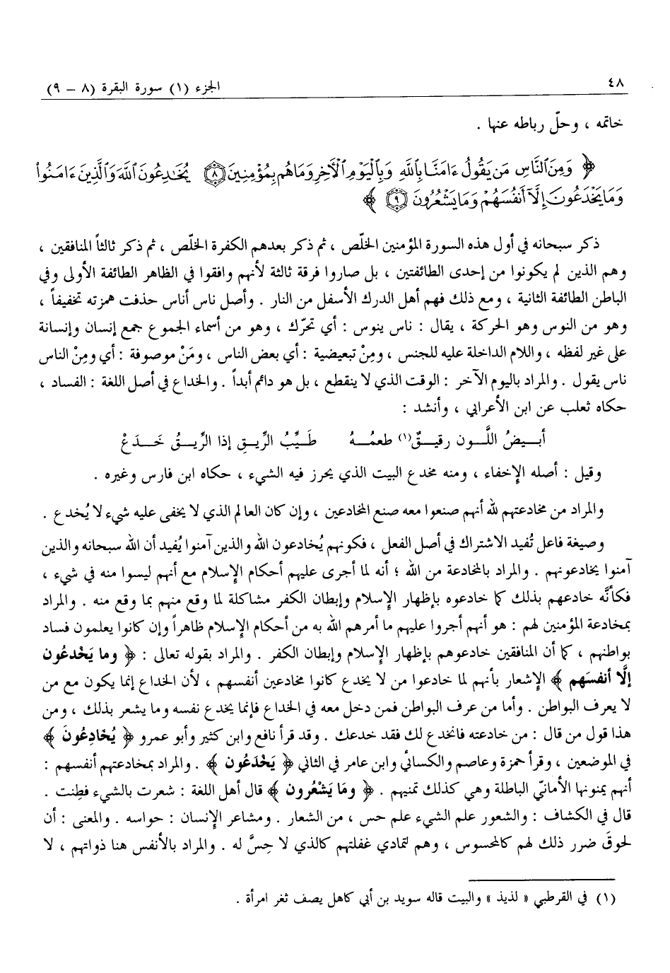 ذكر سبحانه فِي أَوَّلِ هَذِهِ السُّورَةِ الْمُؤْمِنِينَ الْخُلَّصَ، ثُمَّ ذَكَرَ بَعْدَهُمُ الْكَفَرَةَ الْخُلَّصَ، ثُمَّ ذَكَرَ ثَالِثًا الْمُنَافِقِينَ، وَهُمُ الَّذِينَ لَمْ يَكُونُوا مِنْ إِحْدَى الطَّائِفَتَيْنِ، بَلْ صَارُوا فِرْقَةً ثَالِثَةً لِأَنَّهُمْ وَافَقُوا فِي الظَّاهِرِ الطَّائِفَةَ الْأُولَى وَفِي الْبَاطِنِ الطَّائِفَةَ الثَّانِيَةَ، وَمَعَ ذَلِكَ فَهُمْ أَهْلُ الدَّرْكِ الْأَسْفَلِ من النار. وأصل ناس أناس حُذِفَتْ هَمْزَتُهُ تَخْفِيفًا، وَهُوَ مِنَ النَّوْسِ وَهُوَ الْحَرَكَةُ، يُقَالُ: نَاسَ يَنُوسُ: أَيْ تَحَرَّكَ، وَهُوَ مِنْ أَسْمَاءِ الْجُمُوعِ جَمْعُ إِنْسَانٍ وَإِنْسَانَةٍ عَلَى غير لفظه، واللام الداخلة عليه للجنس، ومن تبعيضية: أي بعض الناس، ومن مَوْصُوفَةٌ: أَيْ وَمِنَ النَّاسِ نَاسٌ يَقُولُ. وَالْمُرَادُ بِالْيَوْمِ الْآخِرِ: الْوَقْتُ الَّذِي لَا يَنْقَطِعُ، بَلْ هُوَ دَائِمٌ أَبَدًا. وَالْخِدَاعُ فِي أَصْلِ اللُّغَةِ: الْفَسَادُ، حَكَاهُ ثَعْلَبٌ عَنِ ابْنِ الْأَعْرَابِيِّ، وَأَنْشَدَ: