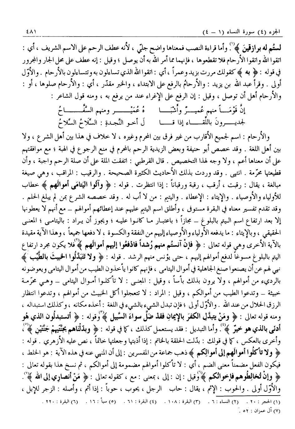 وَالْأَرْحَامُ: اسْمٌ لِجَمِيعِ الْأَقَارِبِ مِنْ غَيْرِ فَرْقٍ بَيْنَ الْمُحَرَّمِ وَغَيْرِهِ، لَا خِلَافَ فِي هَذَا بَيْنَ أَهْلِ الشَّرْعِ، وَلَا بَيْنَ أَهْلِ اللُّغَةِ. وَقَدْ خَصَّصَ أَبُو حَنِيفَةَ وَبَعْضُ الزَّيْدِيَّةِ الرَّحِمَ بِالْمُحَرَّمِ فِي مَنْعِ الرُّجُوعِ فِي الْهِبَةِ مَعَ مُوَافَقَتِهِمْ عَلَى أَنَّ مَعْنَاهَا أَعَمُّ، وَلَا وَجْهَ لِهَذَا التَّخْصِيصِ. قَالَ الْقُرْطُبِيُّ: اتَّفَقَتِ الْمِلَّةُ عَلَى أَنَّ صِلَةَ الرَّحِمِ وَاجِبَةٌ، وَأَنْ قَطِيعَتَهَا مُحَرَّمَةٌ. انْتَهَى. وَقَدْ وَرَدَتْ بِذَلِكَ الْأَحَادِيثُ الْكَثِيرَةُ الصَّحِيحَةُ. وَالرَّقِيبُ: الْمُرَاقِبُ، وَهِيَ صِيغَةُ مُبَالَغَةٍ، يُقَالُ: رَقَبْتُ، أَرْقُبُ، رُقْبَةً وَرُقْبَانًا: إِذَا انْتَظَرْتَ. قَوْلُهُ: وَآتُوا الْيَتامى أَمْوالَهُمْ