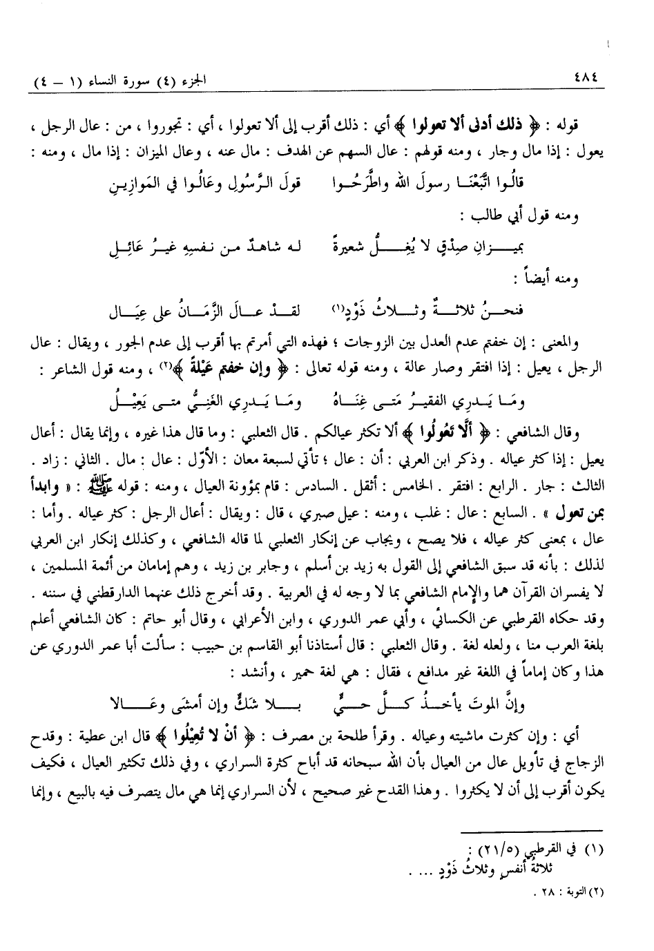 عَالَ، بِمَعْنَى كَثُرَ عِيَالُهُ، فَلَا يَصِحُّ، وَيُجَابُ عَنْ إِنْكَارِ الثَّعْلَبِيِّ لِمَا قَالَهُ الشَّافِعِيُّ، وَكَذَلِكَ إِنْكَارُ ابْنِ الْعَرَبِيِّ لِذَلِكَ: بِأَنَّهُ قَدْ سَبَقَ الشَّافِعِيَّ إِلَى الْقَوْلِ بِهِ زيد بن أسلم، وجابر بن زيد، وهم إِمَامَانِ مِنْ أَئِمَّةِ الْمُسْلِمِينَ، لَا يُفَسِّرَانِ الْقُرْآنَ هُمَا وَالْإِمَامُ الشَّافِعِيُّ بِمَا لَا وَجْهَ لَهُ فِي الْعَرَبِيَّةِ. وَقَدْ أَخْرَجَ ذَلِكَ عَنْهُمَا الدَّارَقُطْنِيُّ فِي سُنَنِهِ.